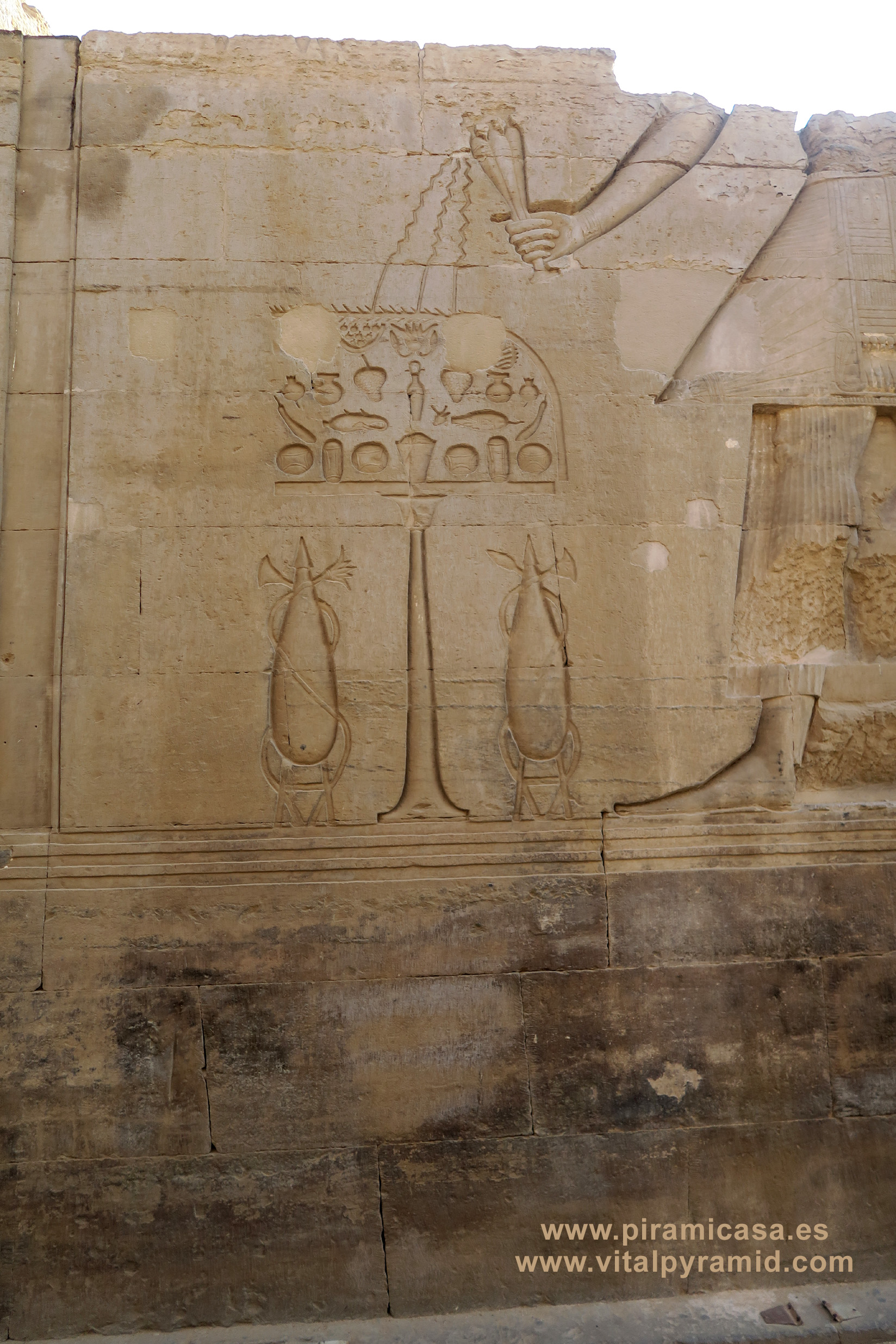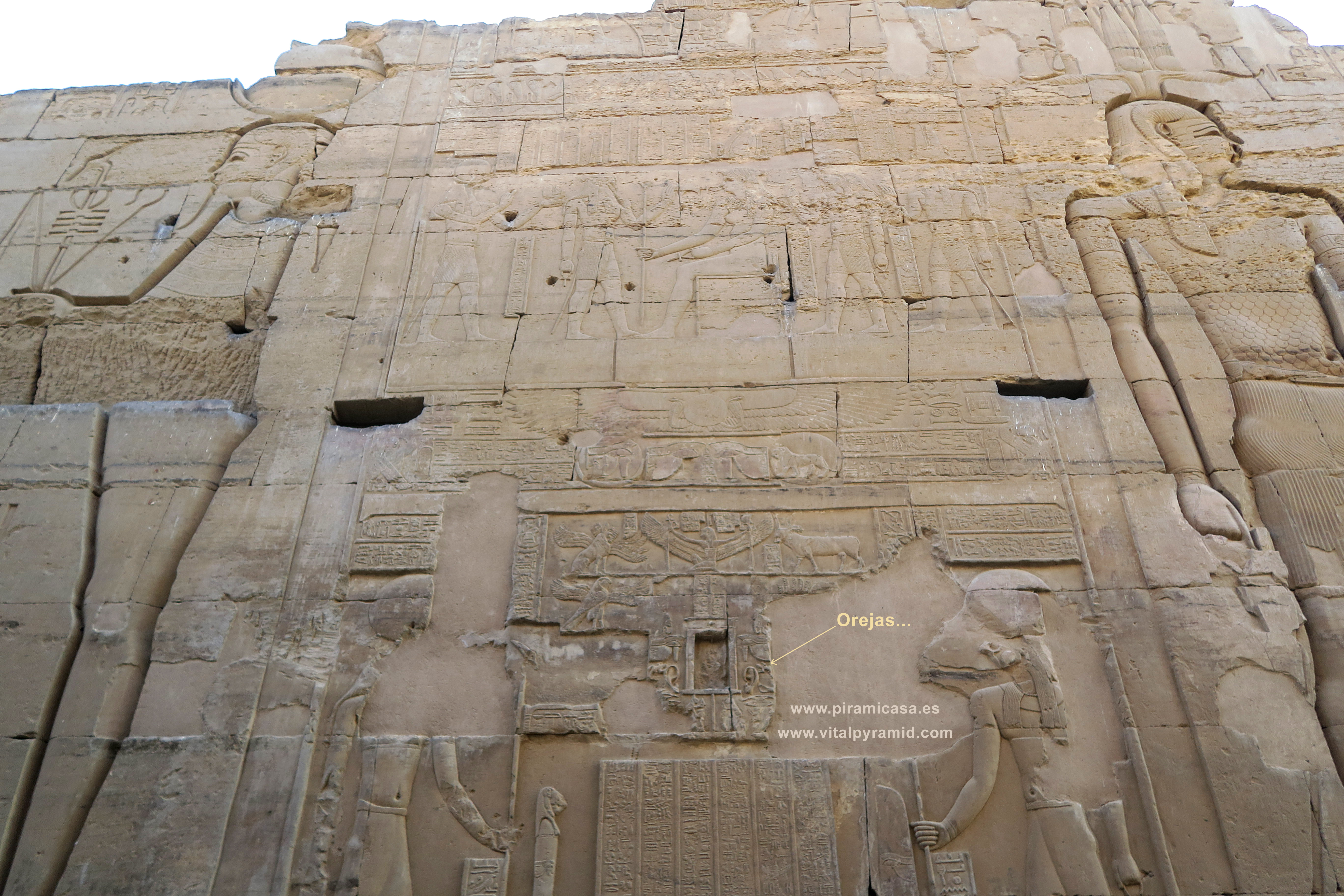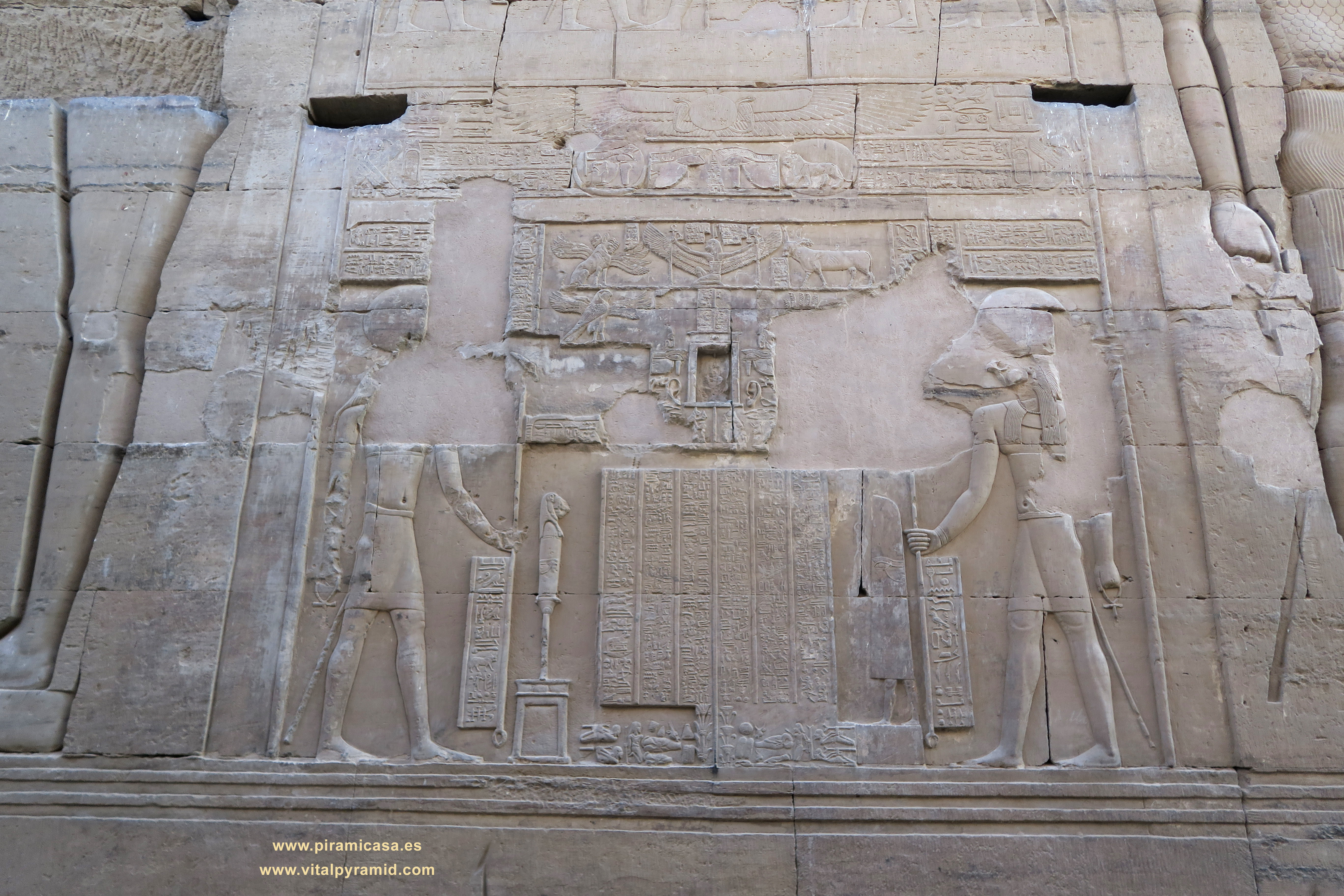 Aquí podemos ver algunas imágenes del frontispicio actual del Templo de Horus-Sobek Horus también suele escribirse Haroeris. Representa la Consciencia, como que hijo de Isis (la Ciencia) y Osiris (el Conocimiento). Sobek, representado con un cocodrilo no es nada malo. Las interpretaciones pueriles lo han convertido en el "malo de la película" casi al nivel de Set, que sí es el Hermano Malo de Osiris. Sobek sin embargo representa el Instinto, sin el cual no podríamos vivir, esa parte que lejos de ser "primitiva", es simplemente básica y esencial, que se ocupa del funcionamiento automático de nuestro cuerpo, de nuestro subconsciente en relación con todas las funciones vitales. Sin Sobek la Consciencia no podría desarrollarse, porque no tendría un cuerpo que funciona para manifestarse. Sin Horus, es decir sin Consciencia, tendríamos una manifestación animalesca, elemental, como muchas personas que no la desarrollan y funcionan sólo con esa parte que genera conductas como la de los reptiles. Pues ellos sólo funcionan en su estadio evolutivo, como máquinas biológicas instintivas.