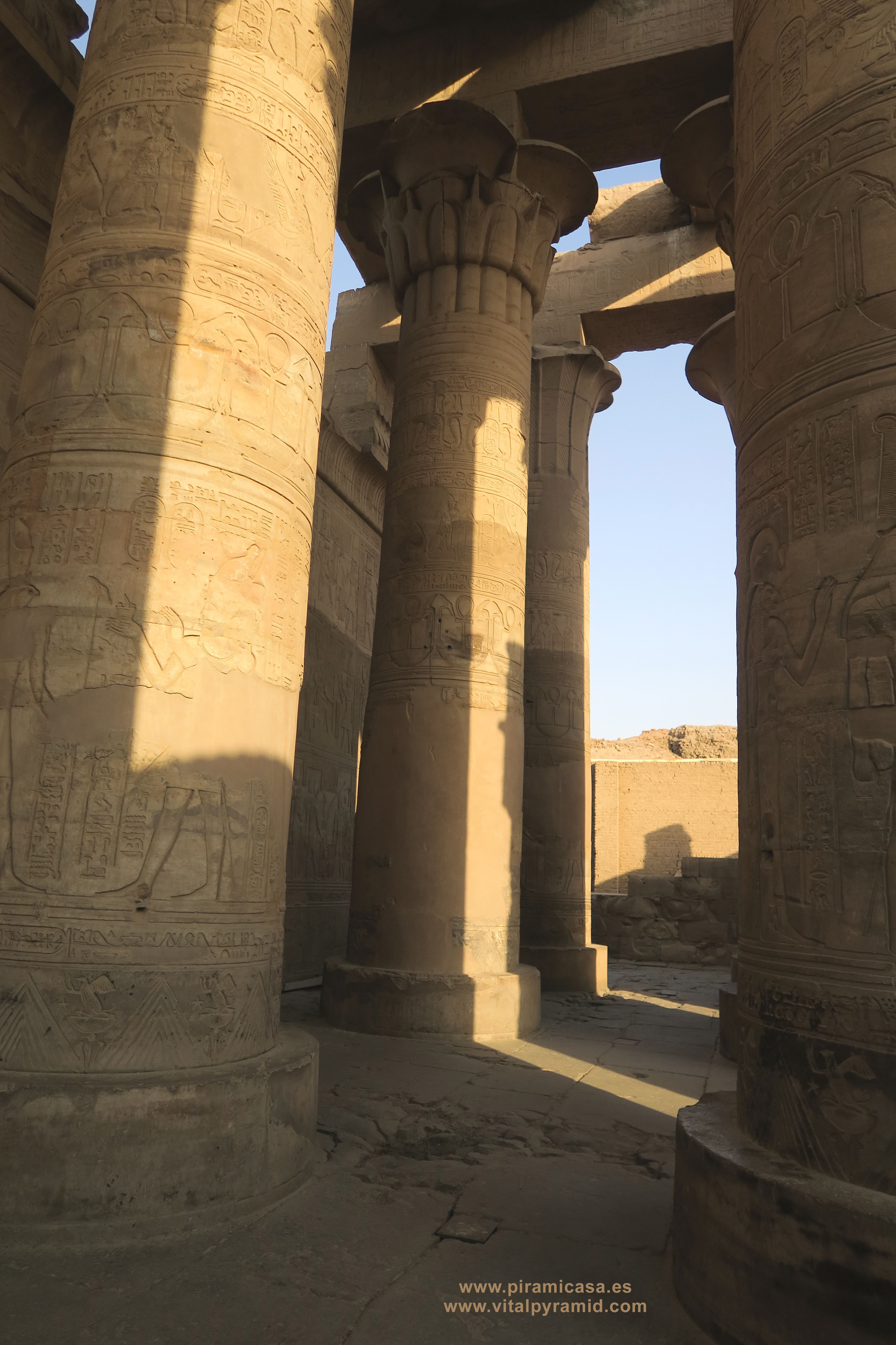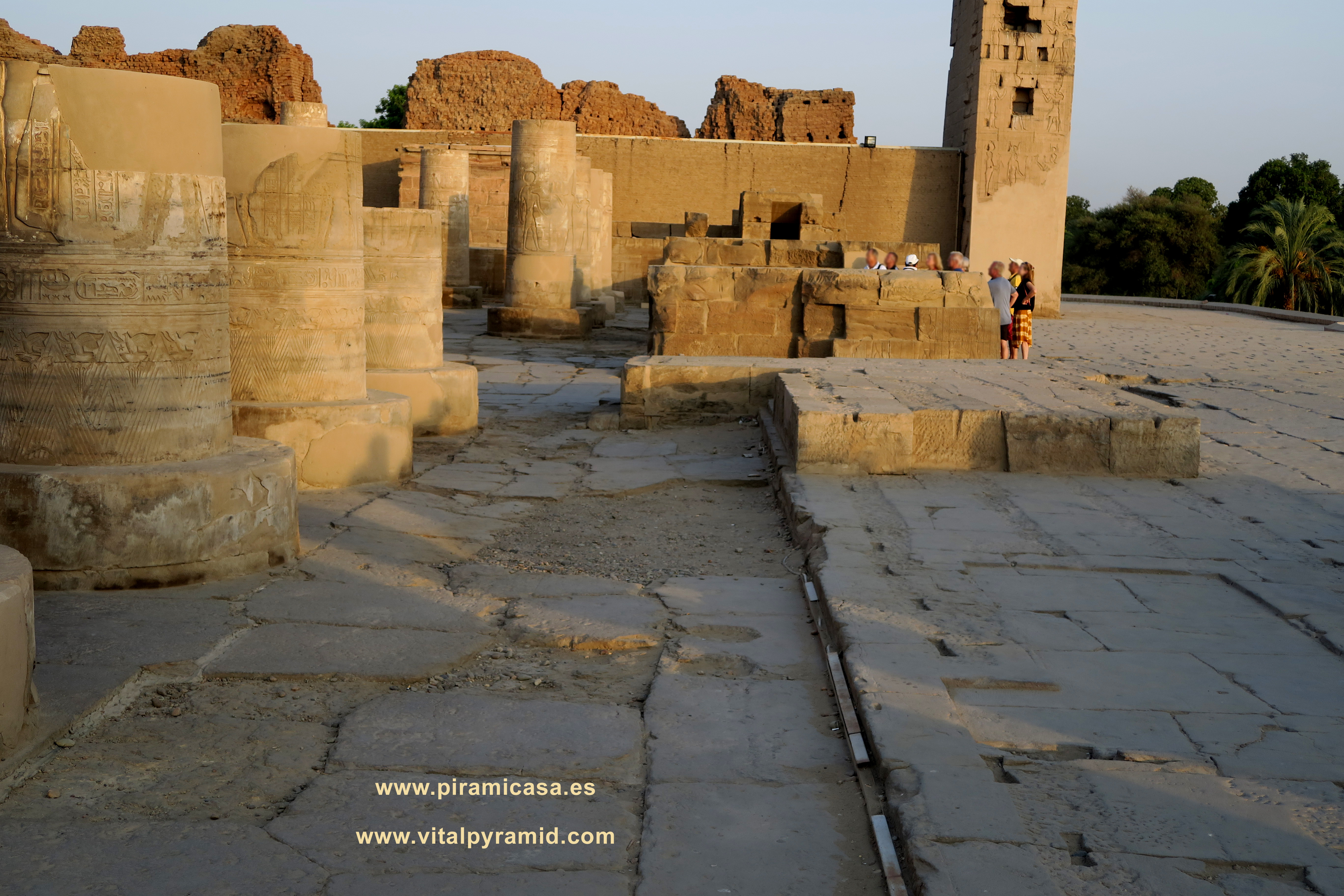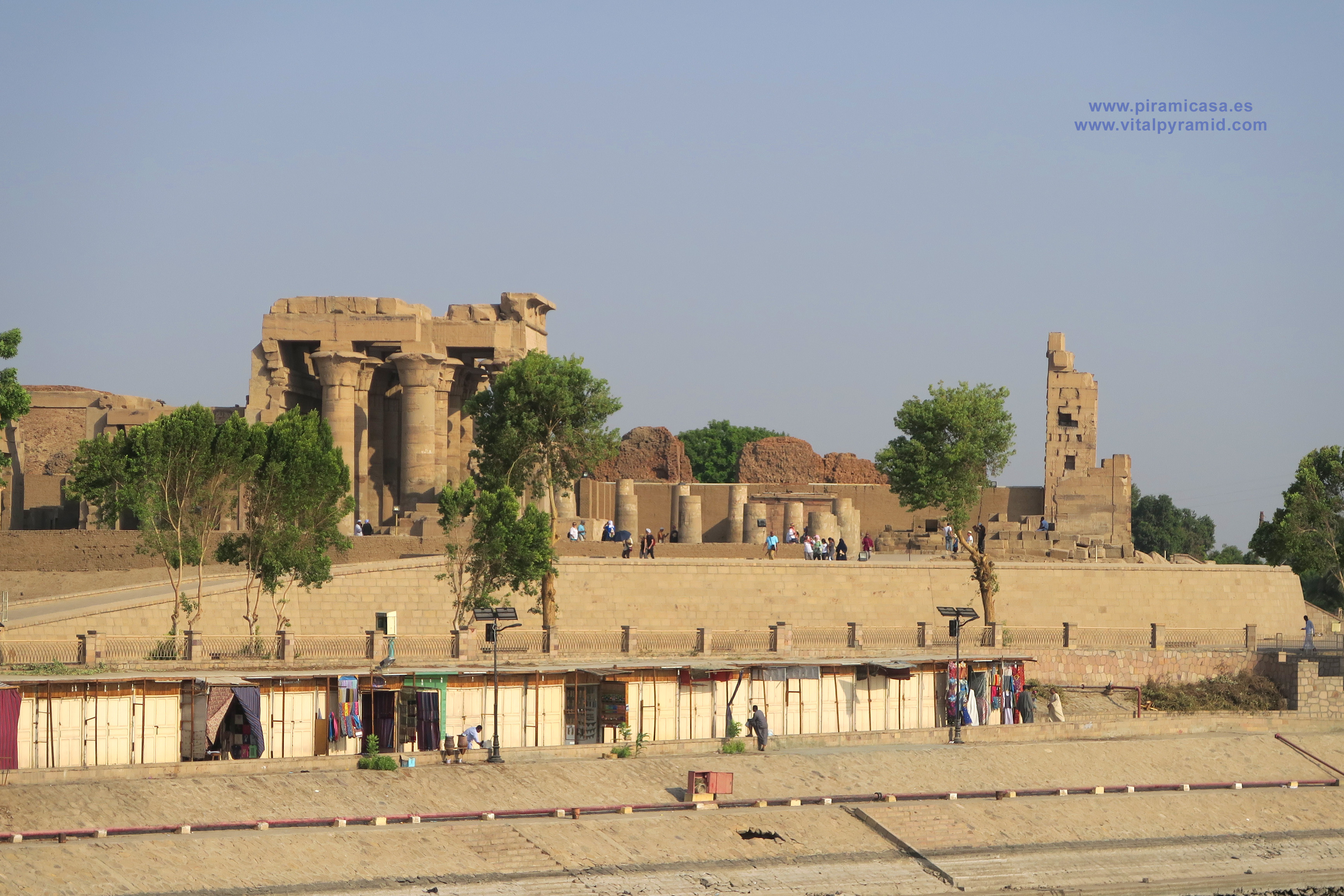 En las últimas imágenes de Kom Ombo podemos ver los bloques que quedan de lo que era el muro exterior, o al menos exterior a lo que queda. Puede que aún estuviese todo ello dentro de otra construcción mayor, porque al parecer los grandes muros de adobe que hace algunos milenios se construyeron alrededor de muchos de los templos, usaron justamente esos megalitos como cimientos. Este muro inmediatamente exterior que vemos en el Templo de Kom Ombo, tiene poco menos de tres metros de ancho, es decir de espesor. Sólo quedan en algunas partes un par de hiladas, pero nos dan idea de la magnitud original de este Templo de Horus-Sobek, en realidad la Escuela de Medicina del Antiguo Egipto.