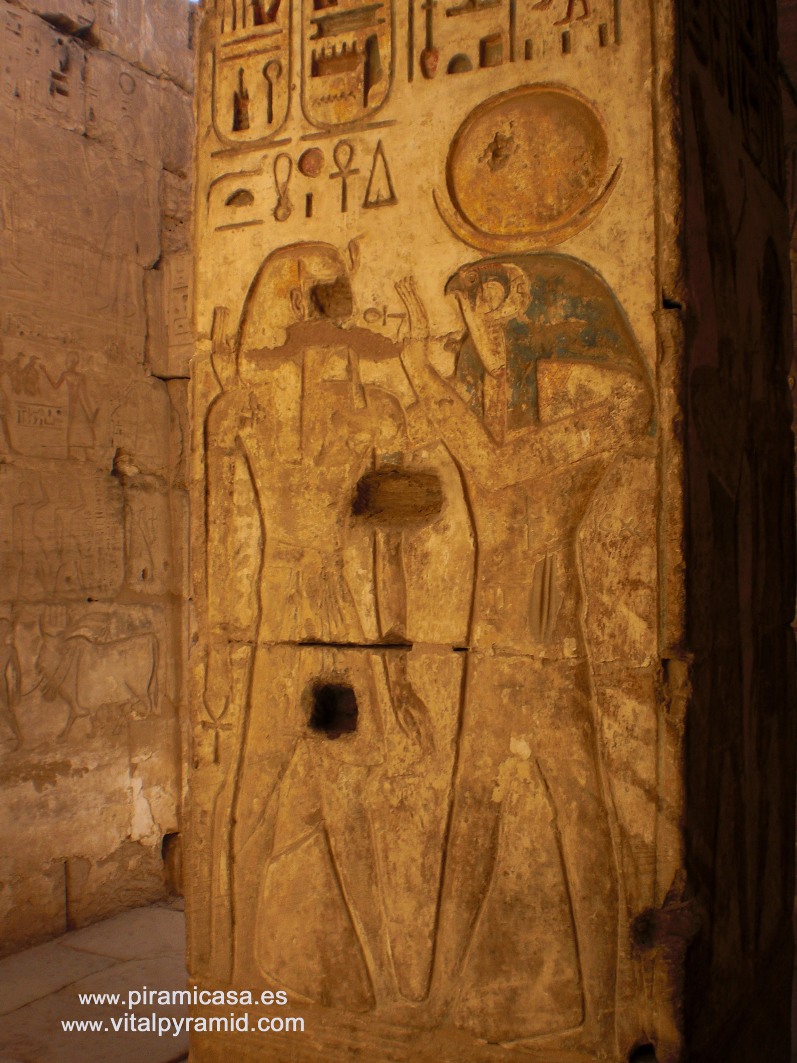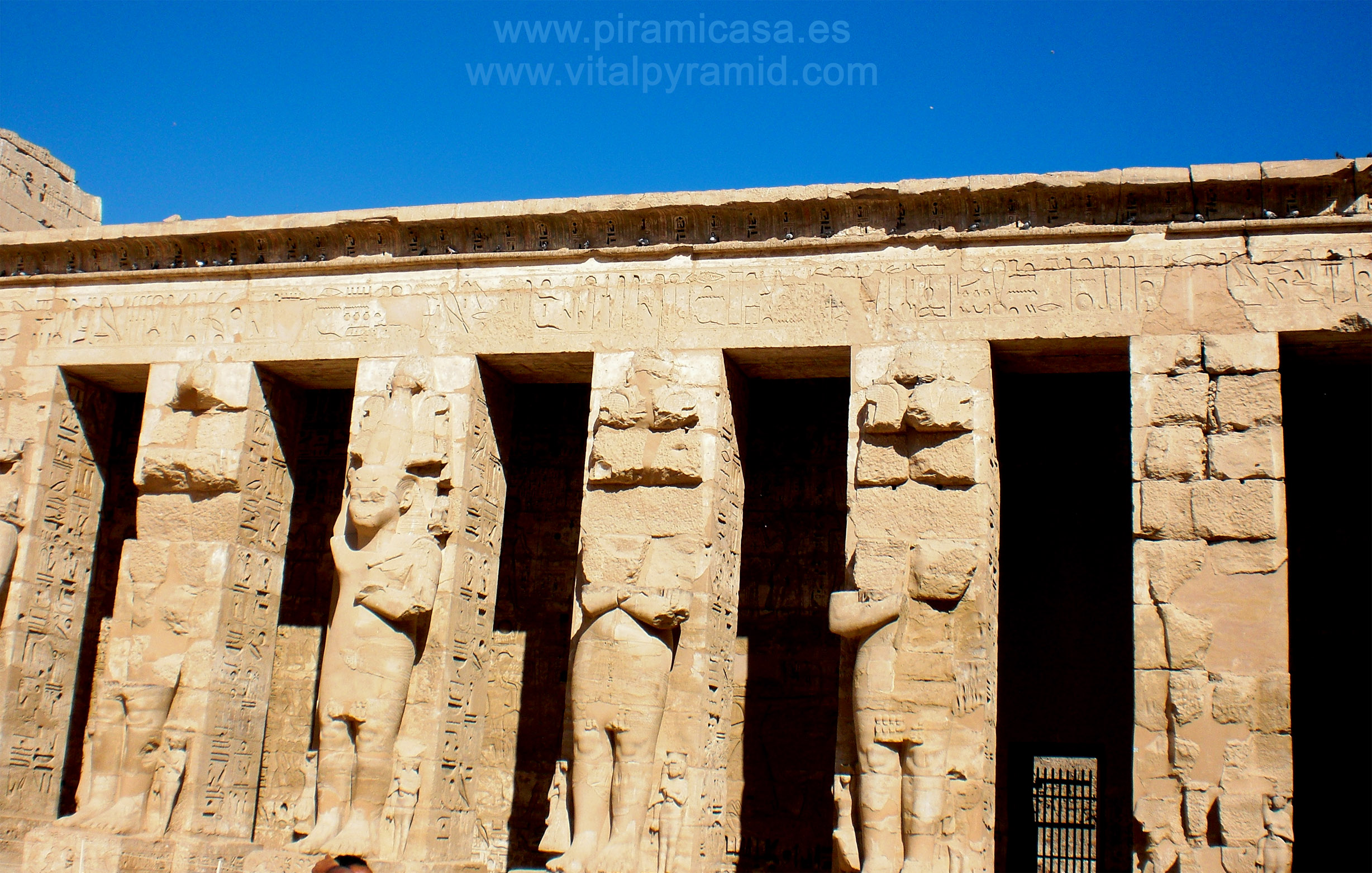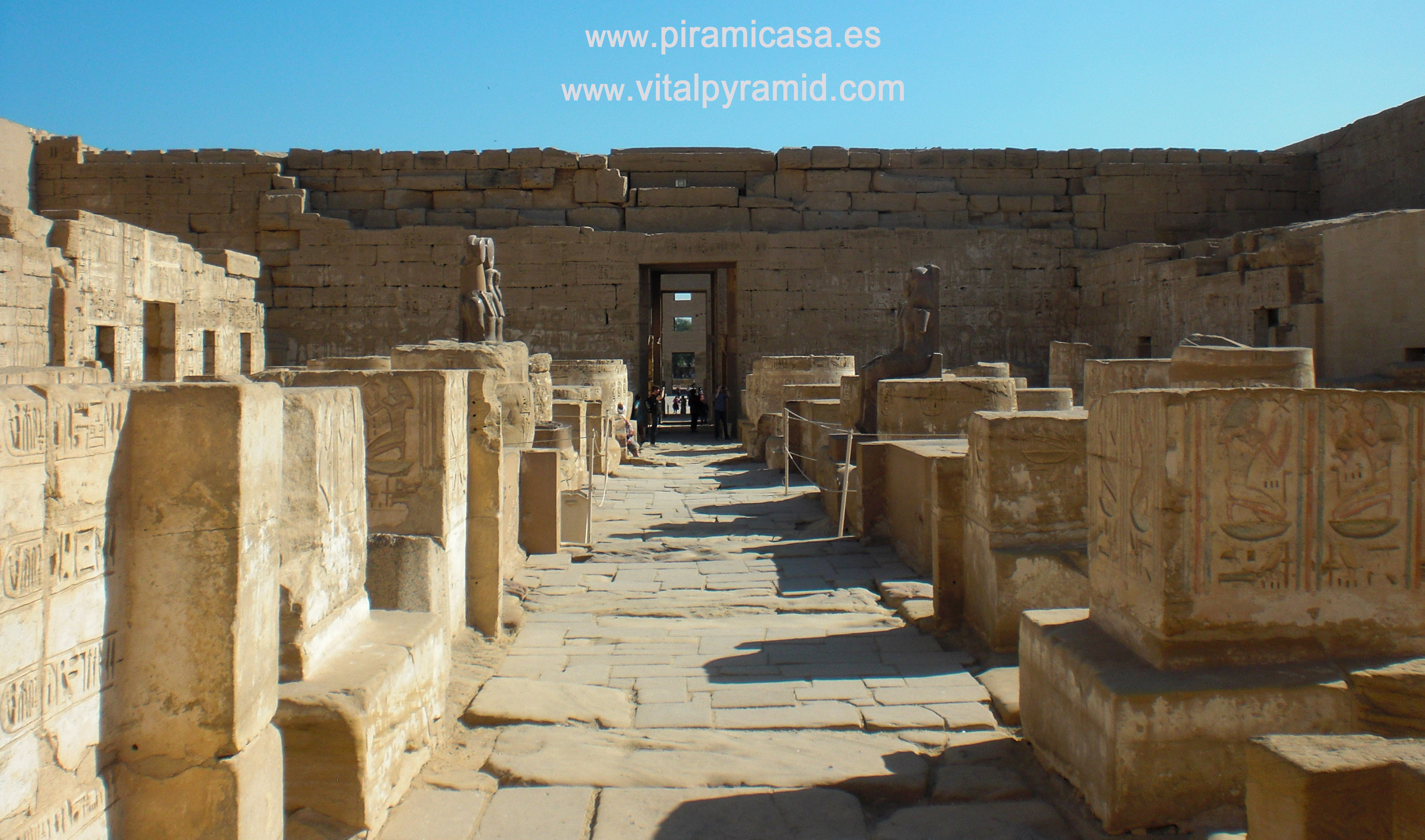 Tenemos muchísimas fotos de esta "primera escuela" de iniciación en Egipto, pero sería imposible colocarlas todas en gran tamaño y detalles. Por eso les recomendamos a quienes nos acompañan en los viajes a Egipto que traigan buenas cámaras y tarjetas como para sacar las mil a dos mil fotos que suele sacar cualquier viajero en los diez a quince días que duran nuestros viajes. Luego intercambiamos entre los miembros de los grupos todas las imágenes. En esta página encontrarás las más generales y básicas, pero ha de tenerse en cuenta que ya hemos calculado más de un millón de metros cuadrados que debieron haber, según lo que aún queda de Egipto como "ruinas". Los planos de planta de los Templos, que figuran en manuales y la web, están muy incompletos, faltando indicaciones de muchos muros exteriores que componían estos conjuntos. Algunos muros, de unos tres metros o más de ancho, encerraban bajo techo lo que hoy vemos como un "gran templo". De ello sólo quedan las primeras hiladas en algunos casos, y cornisas, pedazos de bloques que nos dan una idea de la enormidad que debió existir en el pasado. De todo ello, sólo queda una pequeña parte. Incluso estamos convencidos que la Esfinge de Giza estaba bajo techo junto con todo el complejo de su entorno. Medinet Habu no es la excepción. Debajo de las murallas y construcciones de adobe que rodean lo que queda de esta Escuela Hermética, hay enormes bloques de caliza, basalto y granito. El problema es -como en todo Egipto- que no se puede hacer arqueología ilegal, pero tampoco el Estado parece tener medios e interés en explorarlo todo. Para ello tiene que desaparecer la camarilla académica que mantiene oculto todo aquello que no podrían explicar sin desmoronar toda su estantería teórica de la historia egipcia. Cuando ello ocurra, Egipto volverá sin duda a tener la más grande afluencia turística imaginable.