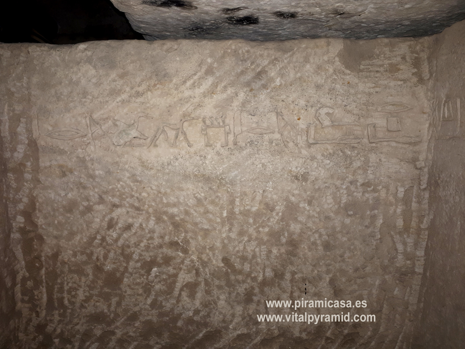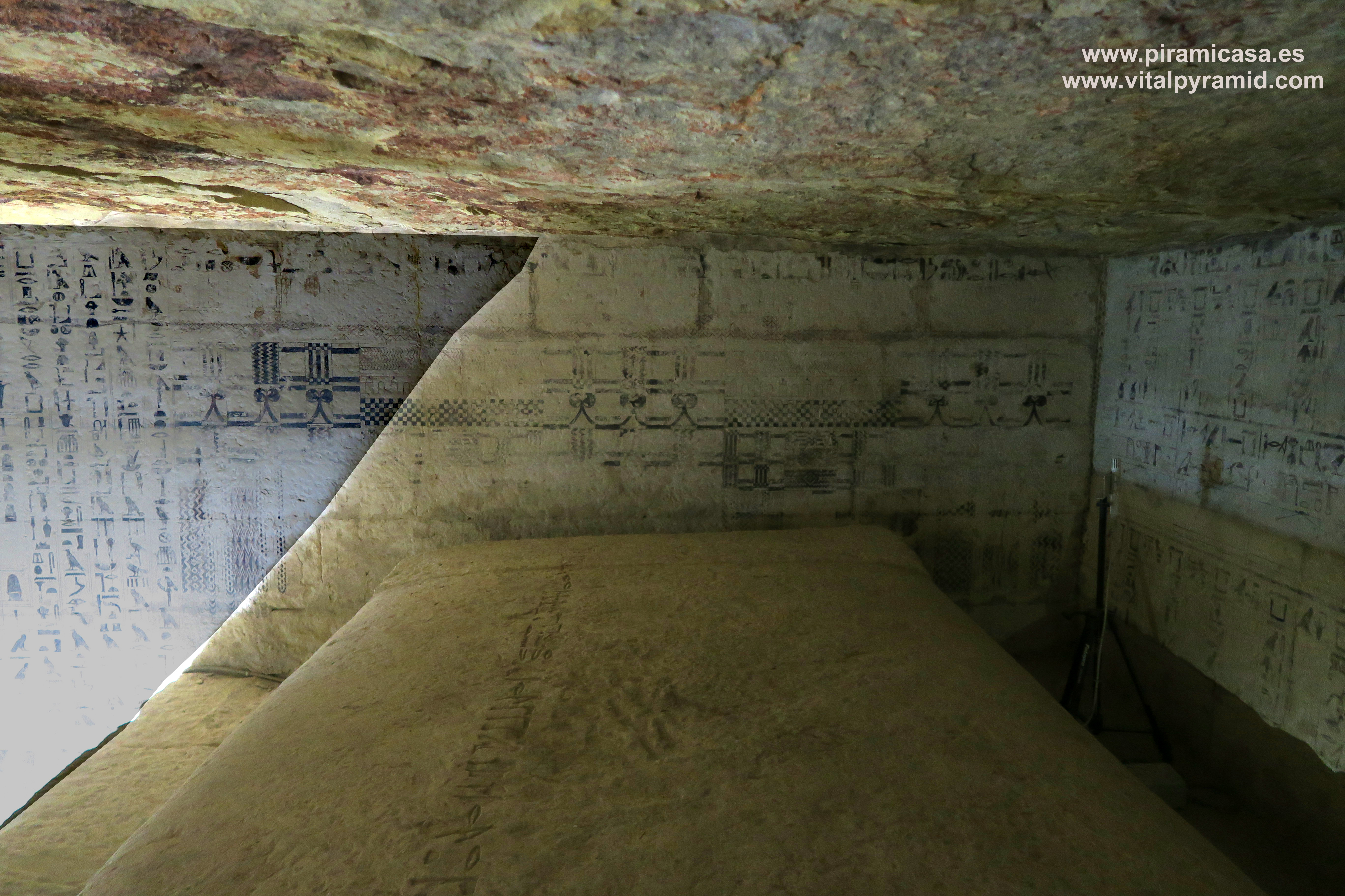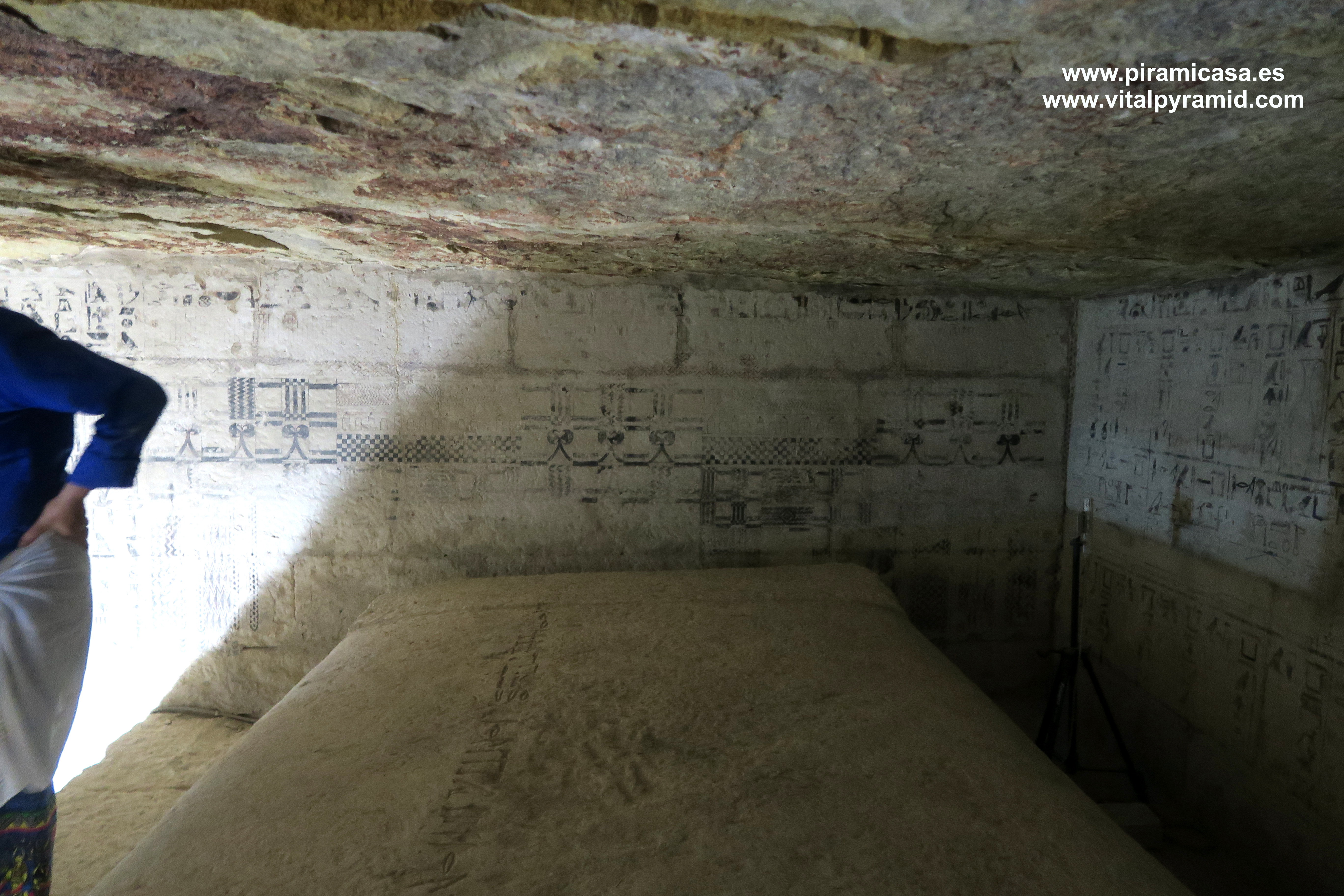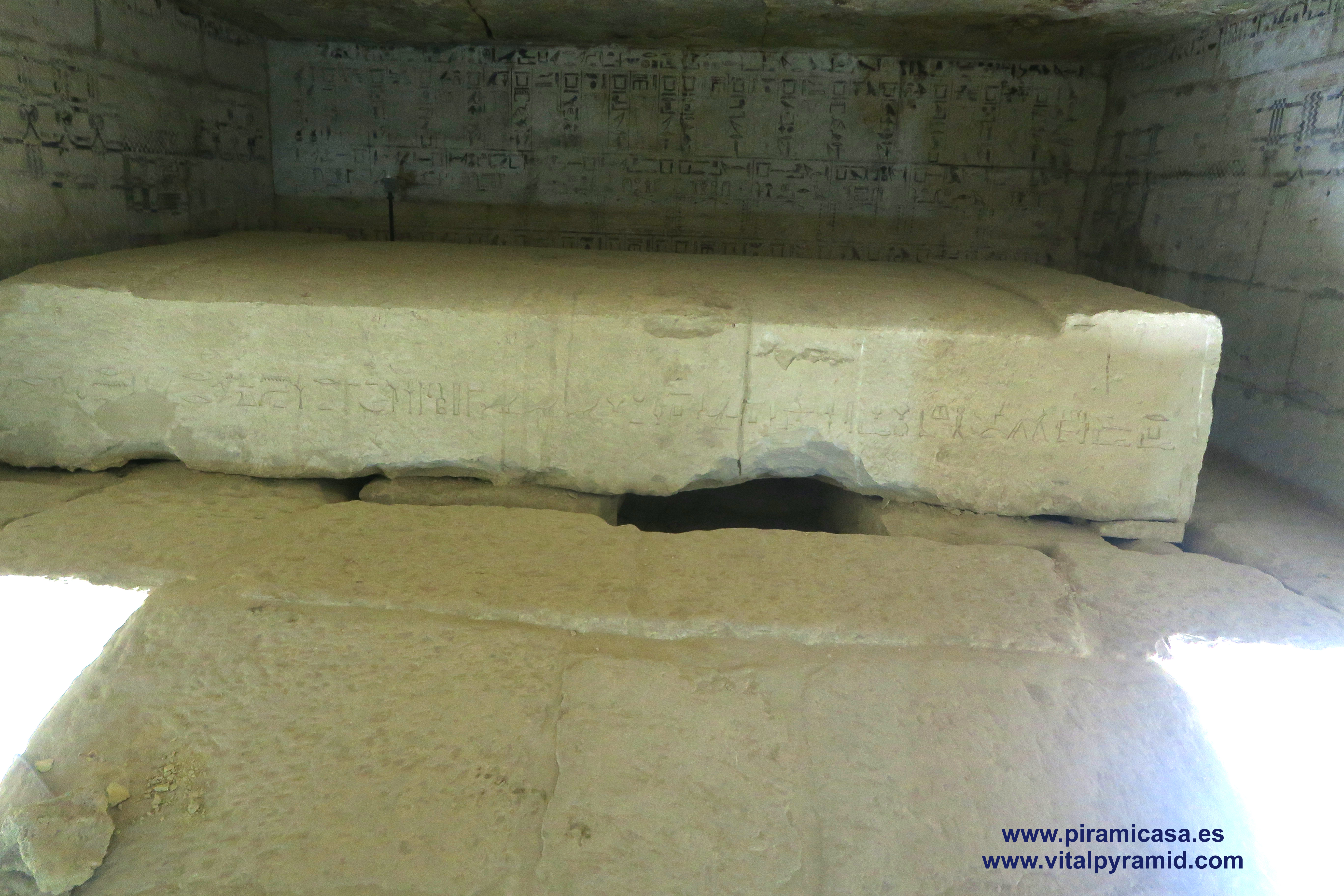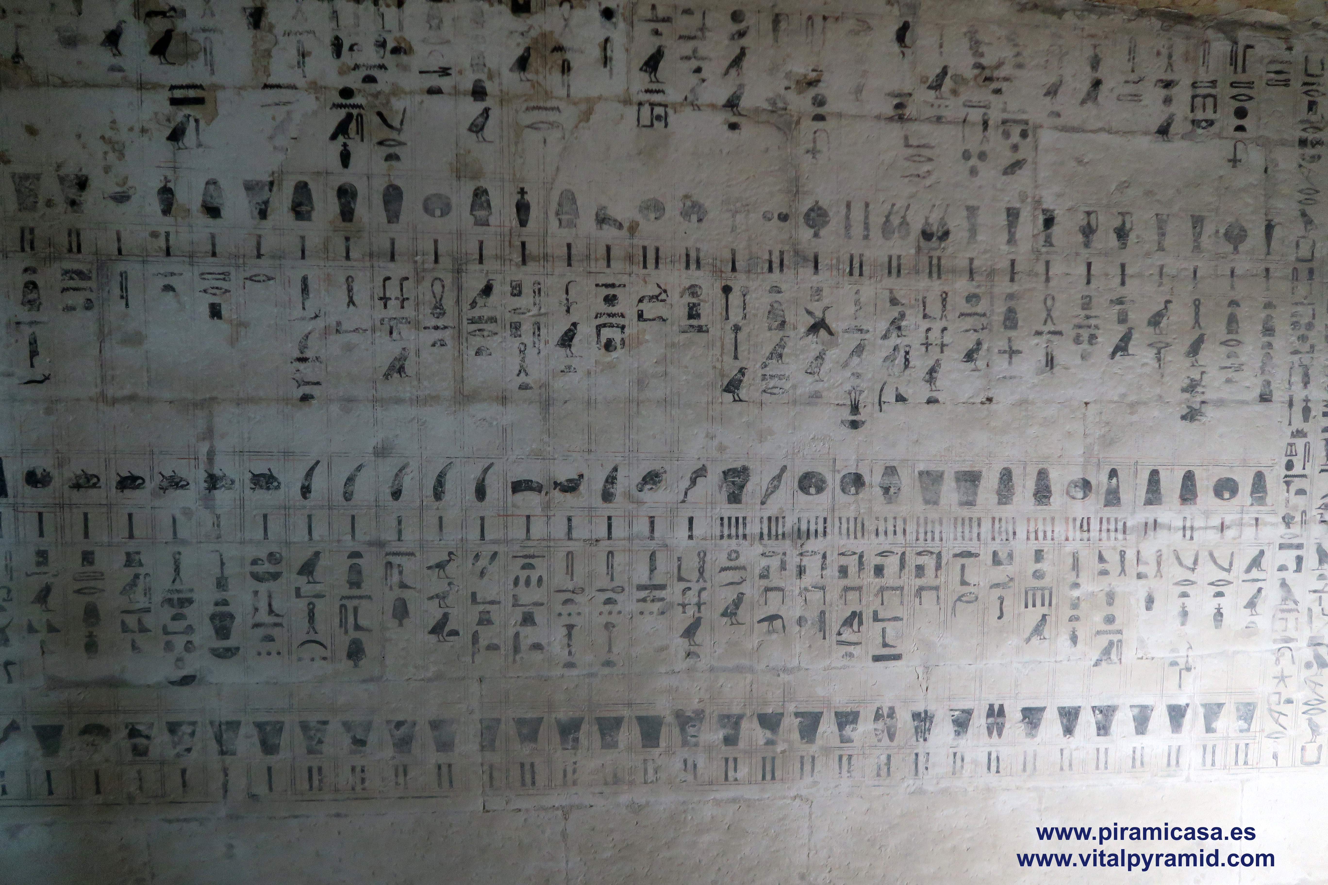 En Egipto vamos a encontrarnos en casi todas partes con supuestas tumbas, supuestas "necrópolis", como si todo lo antiguo hubiese sido cementerio, como si en todas partes se hubieran encontrado cadáveres, momias, ajuar mortuorio. Sin embargo en muy pocos sitios se han encontrado momias. Ni siquiera en el Valle de los Reyes, a excepción de la tumba de Tutankhamon, como explicamos en la sección del Valle de los Reyes. Mereruka presenta sólo escenas de caza, pesca, naturaleza, proceso y conservación de alimentos, así como temas de medicina. Empezamos por debajo del todo, en la cripta suberránea donde veremos un enorme tanque que nunca contuvo cadáver alguno. También recordemos que los jeroglíficos egipcios jamás han sido descifrados, constituyendo hasta hoy un misterio y una pseudociencia, toda vez que hay diversas teorías sin coherencia entre ella, elaboradas por egiptólogos de prestigio. Por lo tanto los jeroglíficos de estas cámaras también están para ser estudiados, analizados por criptógrafos y con toda seguridad, cuando sean correctamente traducidos se caerán la casi totalidad de las teorías que los antropólogos, arqueólogos y en especial los egiptólogos, exponen como verdades indiscutibles. Las nuevas generaciones de arqueólogos ya están empezando a generar teorías alternativas, destituyendo la "conspiración del silencio" que existe en todos los órdenes académicos, por los intereses económicos relacionados a la venta de los libros y el mantenimiento de las cátedras, cosas que quedan todas caducas, obsoletas con cada descubrimiento, porque ya no le caben parches a esta psedociencia llamada "egiptología". Será verdadera cuando sea interdisciplinaria, cuando no haya intereses curriculares, académicos, literarios y económicos que defender y se quiera llegar a la pura verdad.