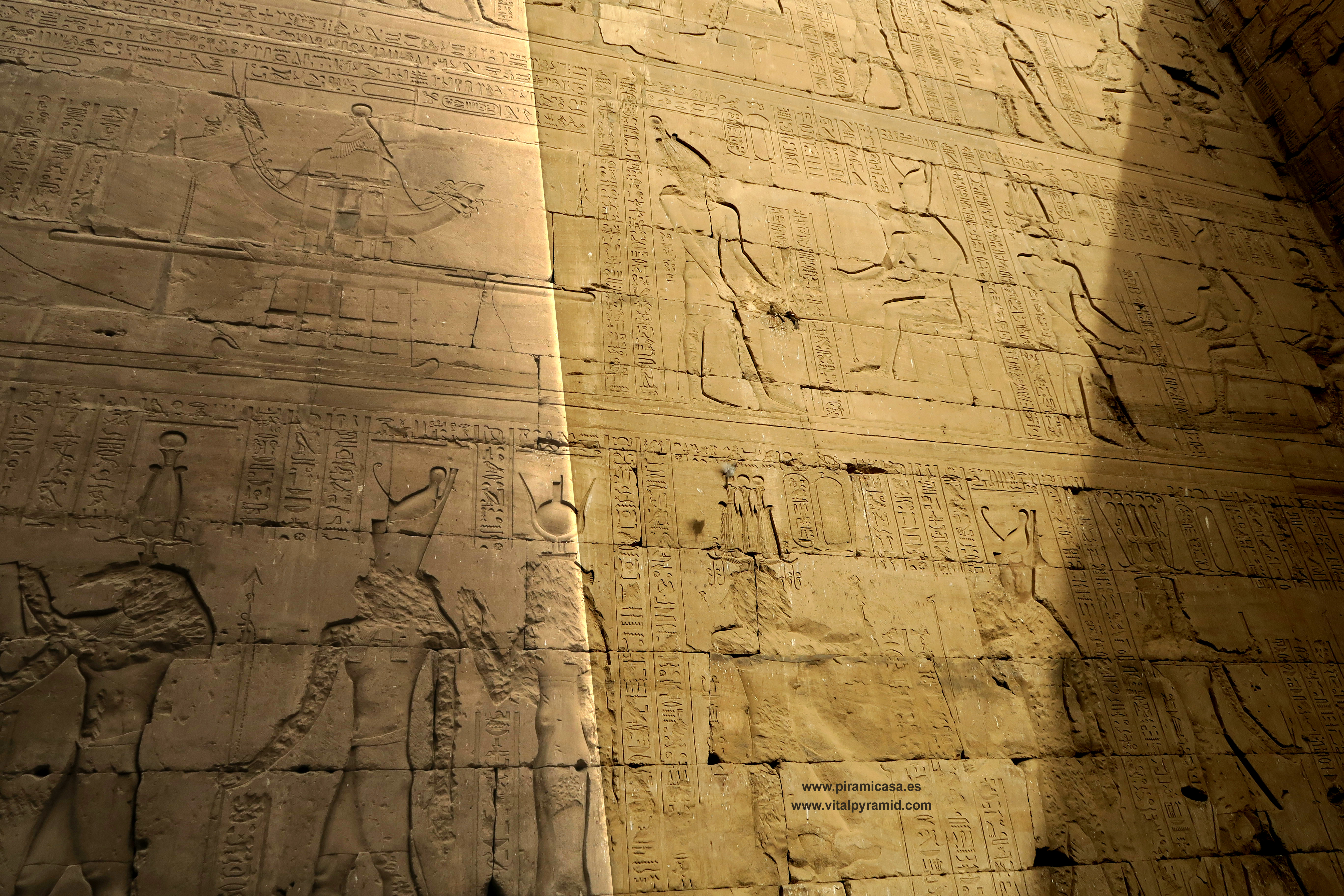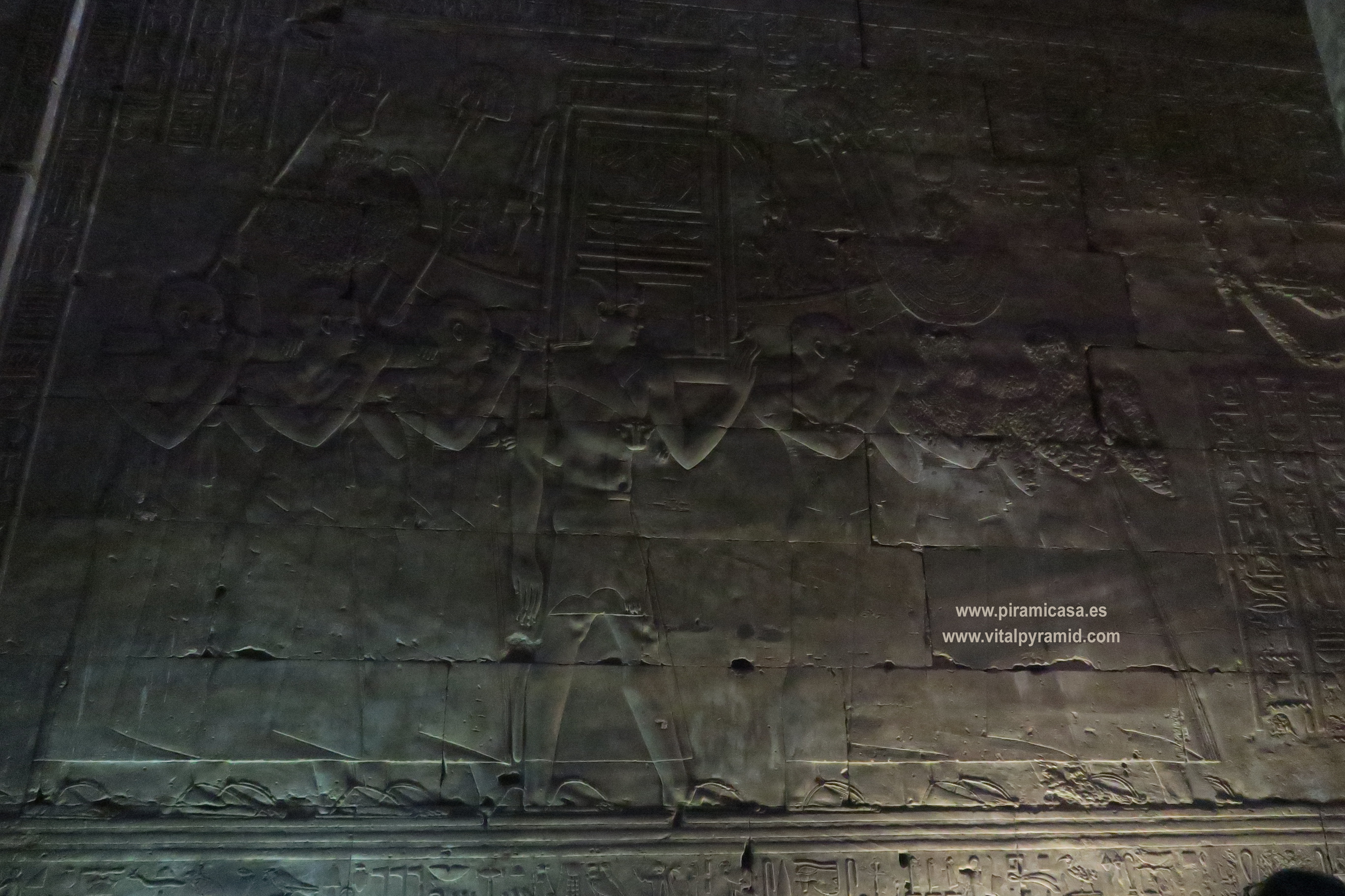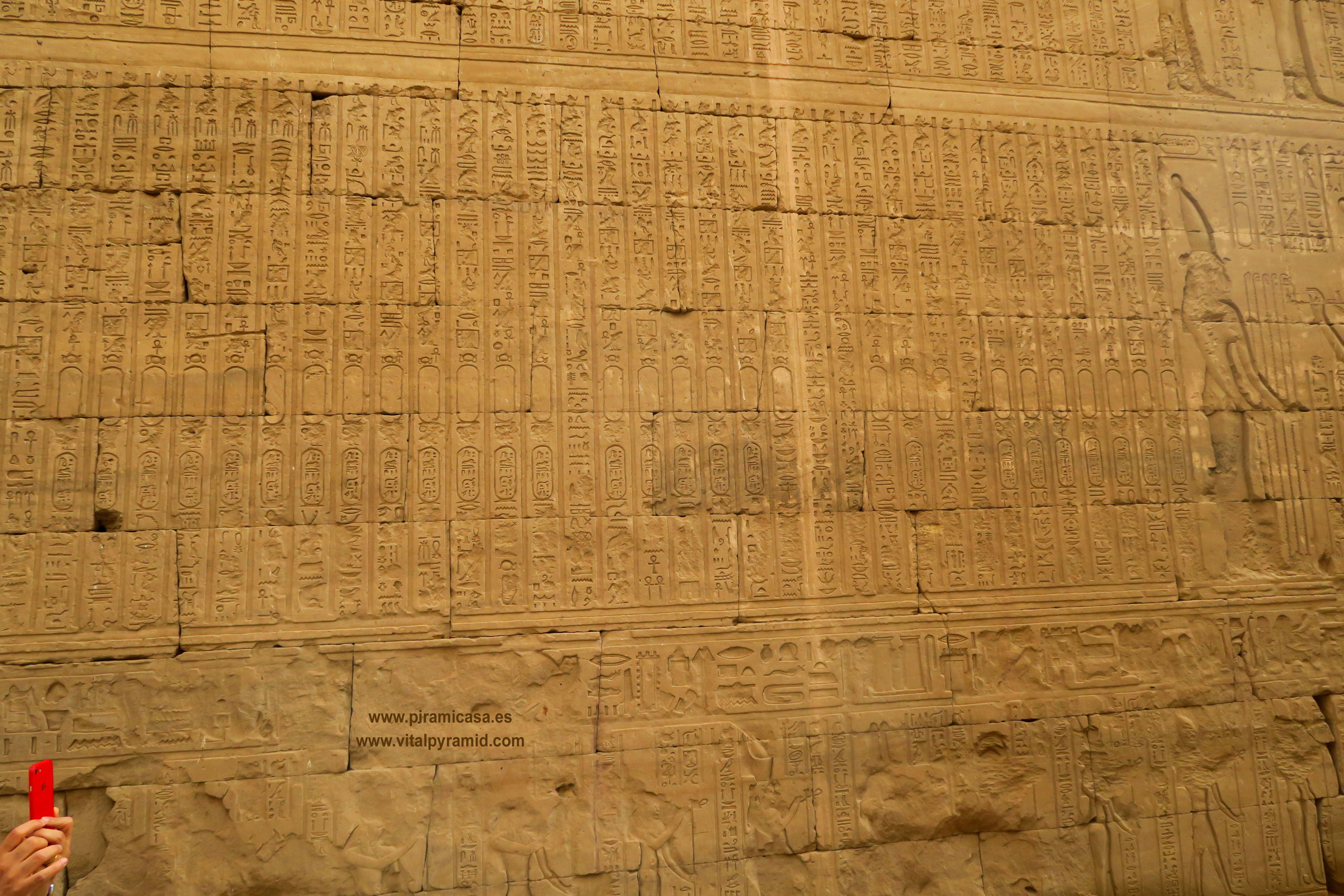 En 2018, durante nuestro 19º viaje, seguimos haciendo fotos de este fabuloso Templo de Horus, con sus grabados y jeroglíficos tan perfectos que aunque fuese el único templo de todo Egipto, basta para darse una idea de que es imposible tan perfección con cinceles de cobre y martillos. Son cosas que sólo puede comprenderse cuando se viaja a Egipto con la mente abierta y criterio analítico. En realidad son cientos los Templos de Egipto, aunque no se haya encontrado todos. Creemos que es un pequeño porcentaje lo que hay visible, por lo que es imposible imaginar que las cosas se hicieran como dicen las teorías ortodoxas y afirman con la contundencia de sus grandes títulos. La realidad científica más elemental basta para desmoronar como castillo de naipes esas teorías. Quienes nos acompañan a Egipto en nuestros viajes participan de la extraordinaria contemplación de estas obras inexplicables aún, de las que deberían hablar nuestros albañiles, arquitectos, ingenieros y petrólogos, en vez que meros repetidores de teorías de hace dos siglos, que se van emparchando para hacer un vestido que ya se descuelga solo, por el peso del absurdo y las evidencias en contra. Cada templo que se encuentra, cada pirámide que se halla o las ruinas de cualquier construcción antigua, es una palada más en la tumba de la antigua egiptología y un soplo de aire fresco para las nuevas generaciones de arqueólogos y egiptólogos interdisciplinarios.