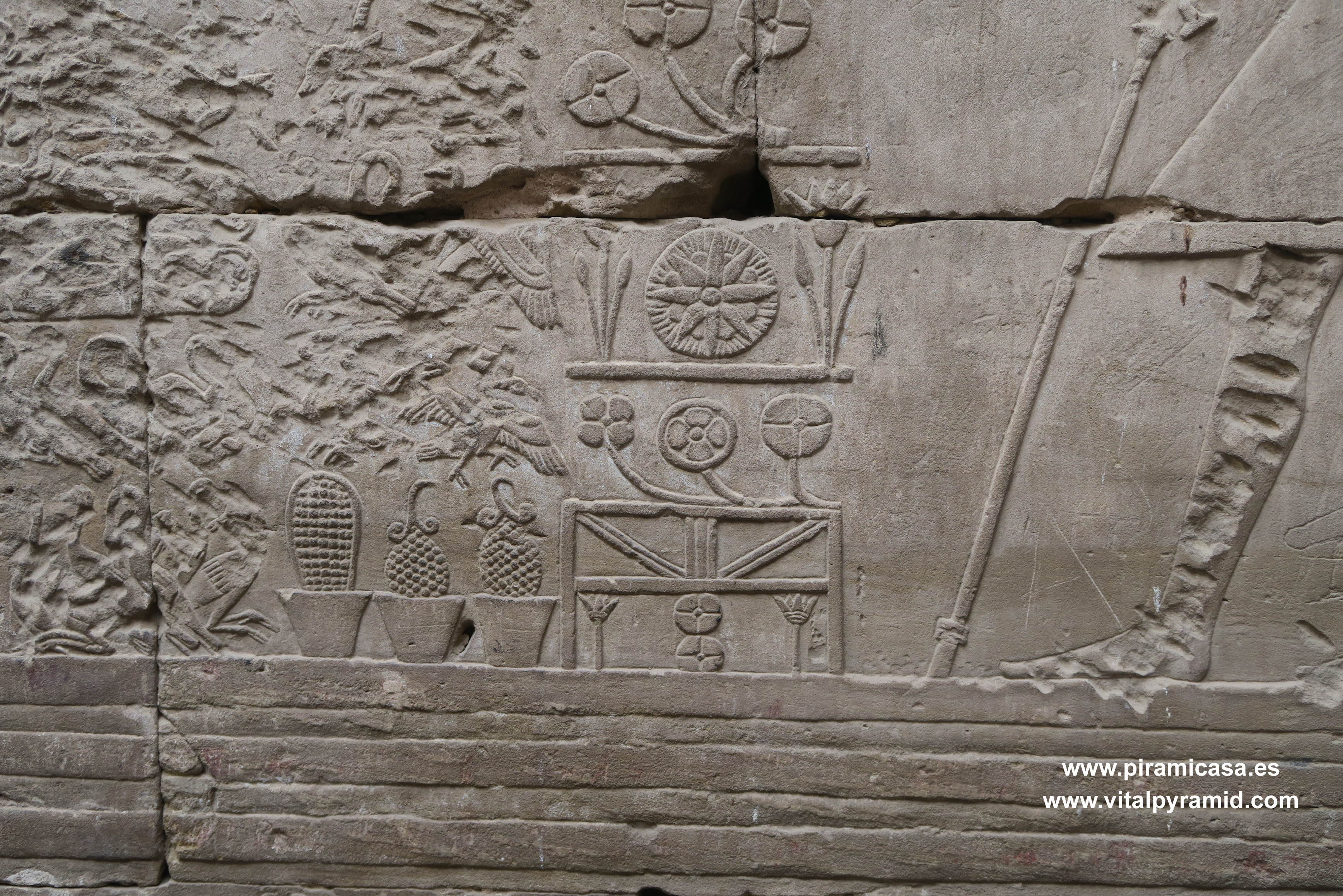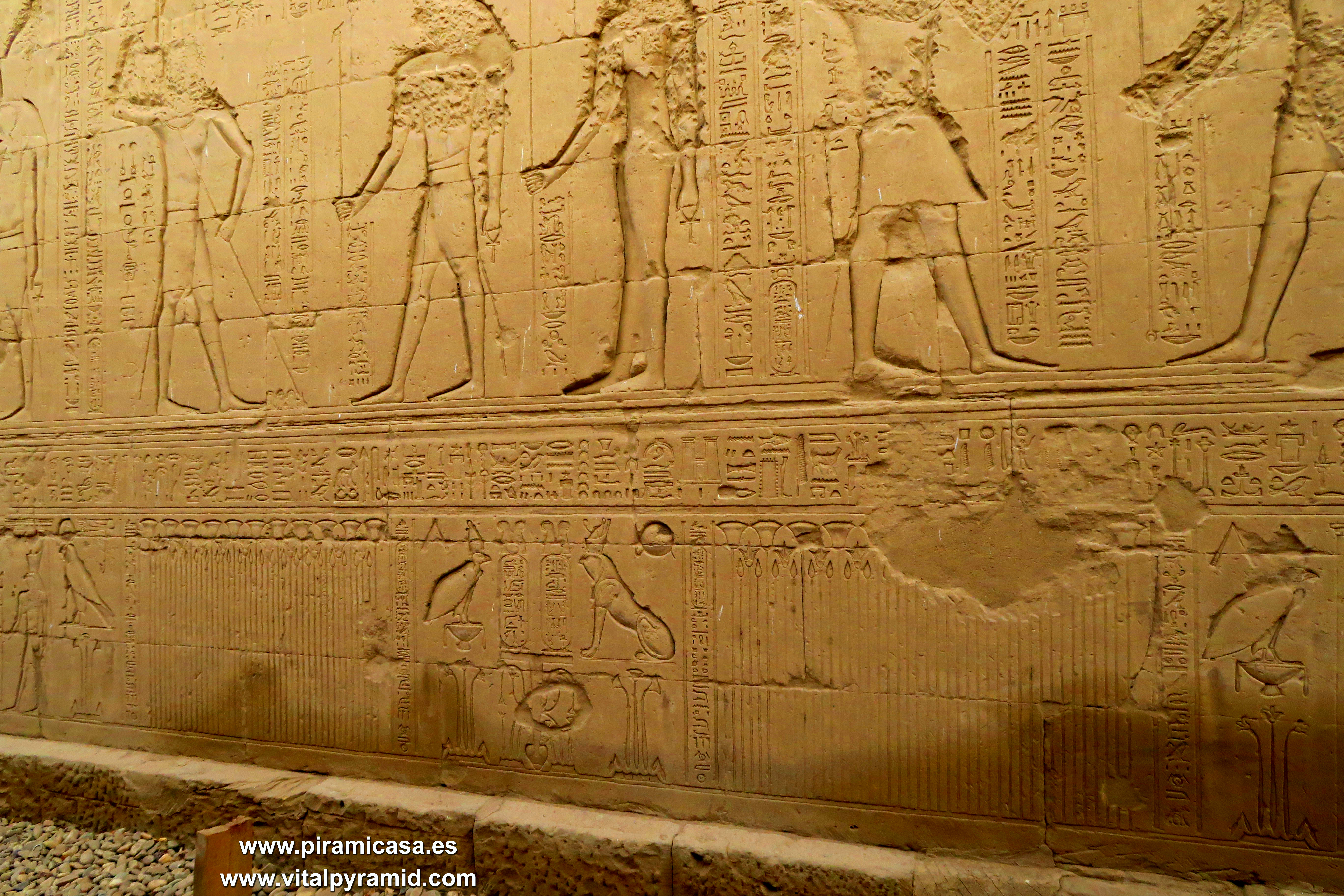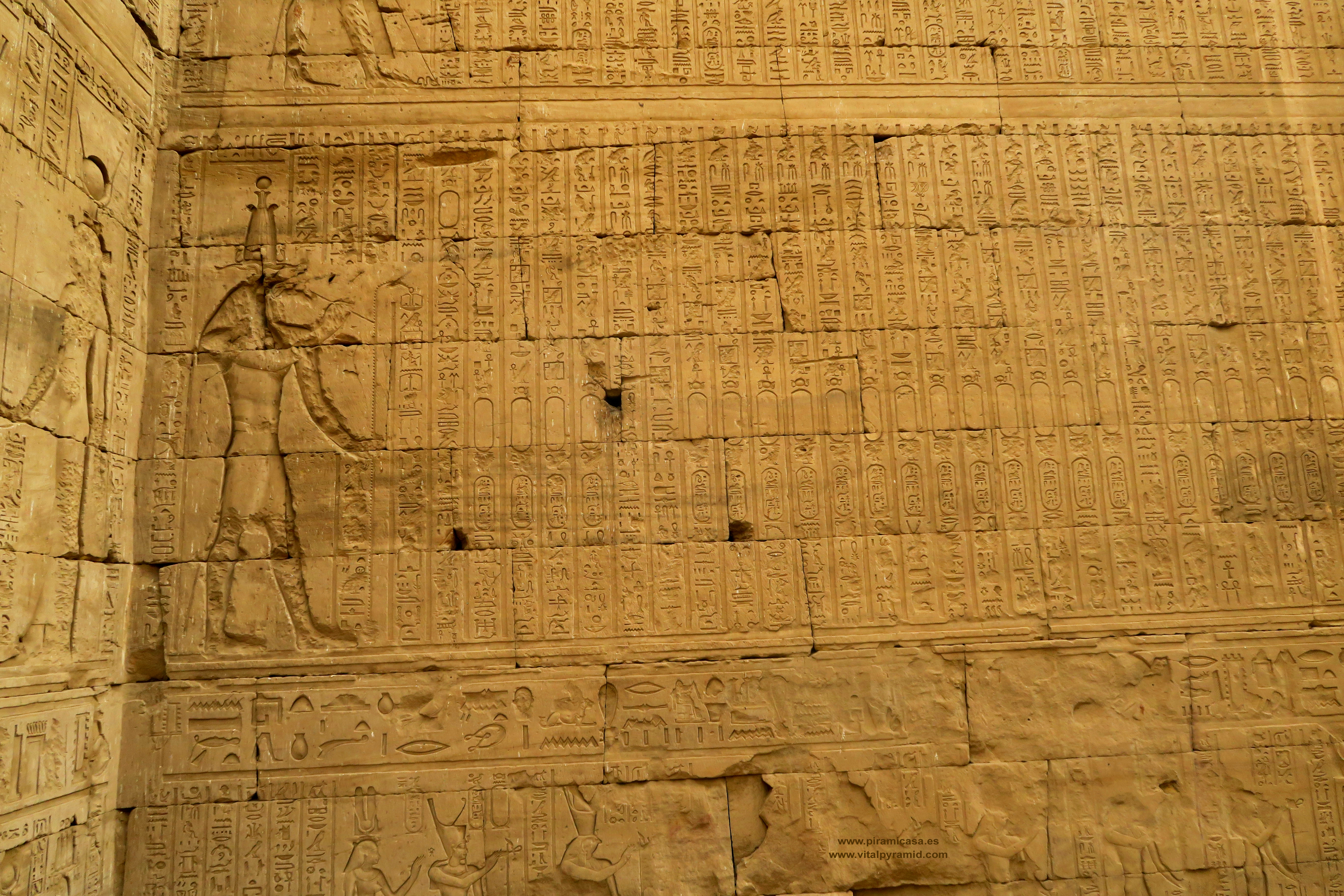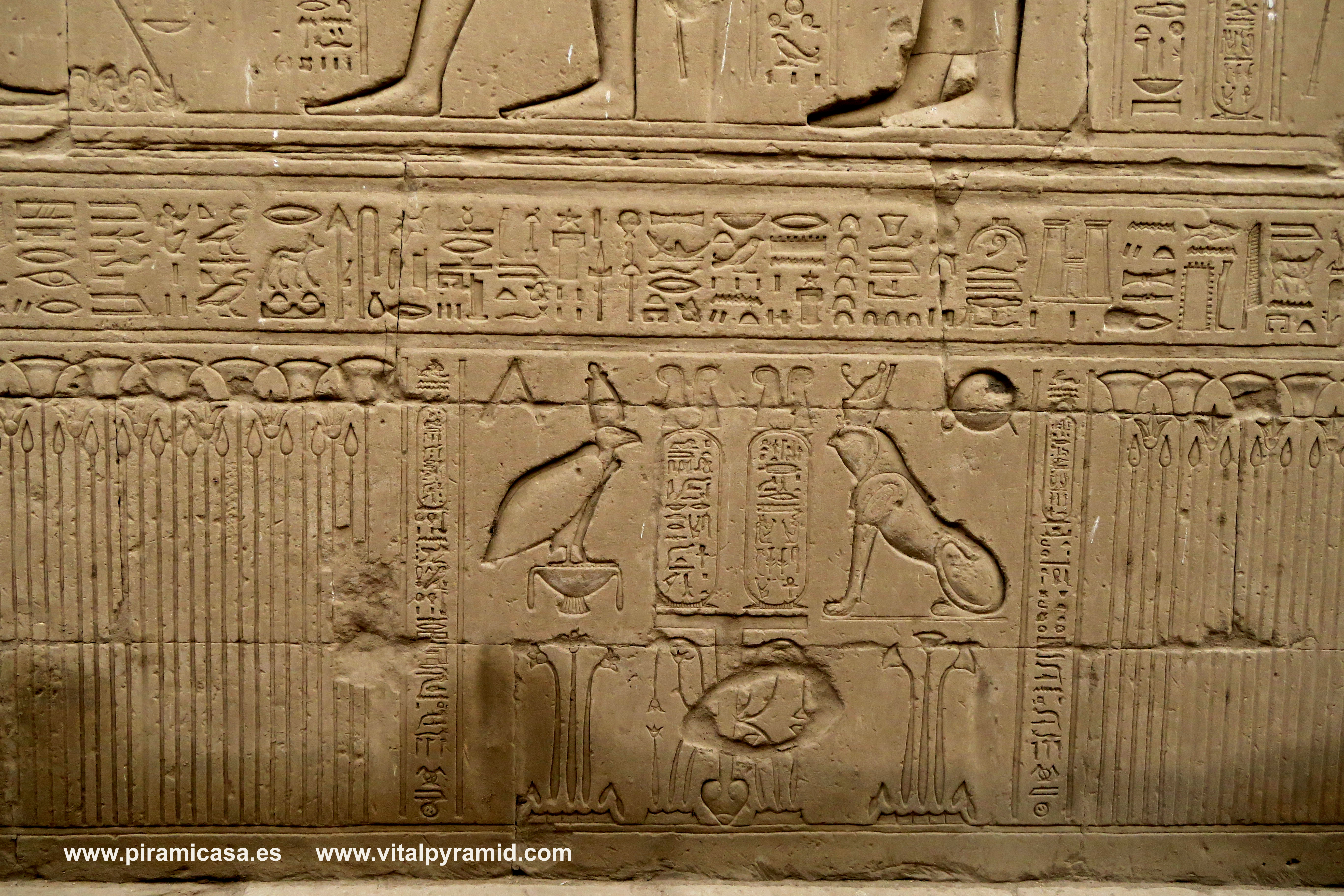 En 2018, durante nuestro 19º viaje, seguimos haciendo fotos de este fabuloso Templo de Horus, con sus grabados y jeroglíficos tan perfectos que aunque fuese el único templo de todo Egipto, basta para darse una idea de que es imposible tan perfección con cinceles de cobre y martillos. Son cosas que sólo puede comprenderse cuando se viaja a Egipto con la mente abierta y criterio analítico. En realidad son cientos los Templos de Egipto, aunque no se haya encontrado todos. Creemos que es un pequeño porcentaje lo que hay visible, por lo que es imposible imaginar que las cosas se hicieran como dicen las teorías ortodoxas y afirman con la contundencia de sus grandes títulos. La realidad científica más elemental basta para desmoronar como castillo de naipes esas teorías. Quienes nos acompañan a Egipto en nuestros viajes participan de la extraordinaria contemplación de estas obras inexplicables aún, de las que deberían hablar nuestros albañiles, arquitectos, ingenieros y petrólogos, en vez que meros repetidores de teorías de hace dos siglos, que se van emparchando para hacer un vestido que ya se descuelga solo, por el peso del absurdo y las evidencias en contra. Cada templo que se encuentra, cada pirámide que se halla o las ruinas de cualquier construcción antigua, es una palada más en la tumba de la antigua egiptología y un soplo de aire fresco para las nuevas generaciones de arqueólogos y egiptólogos interdisciplinarios.