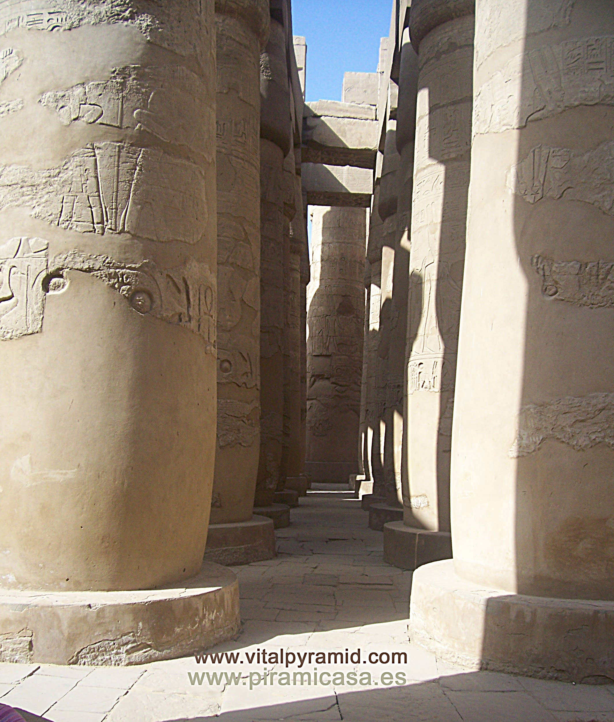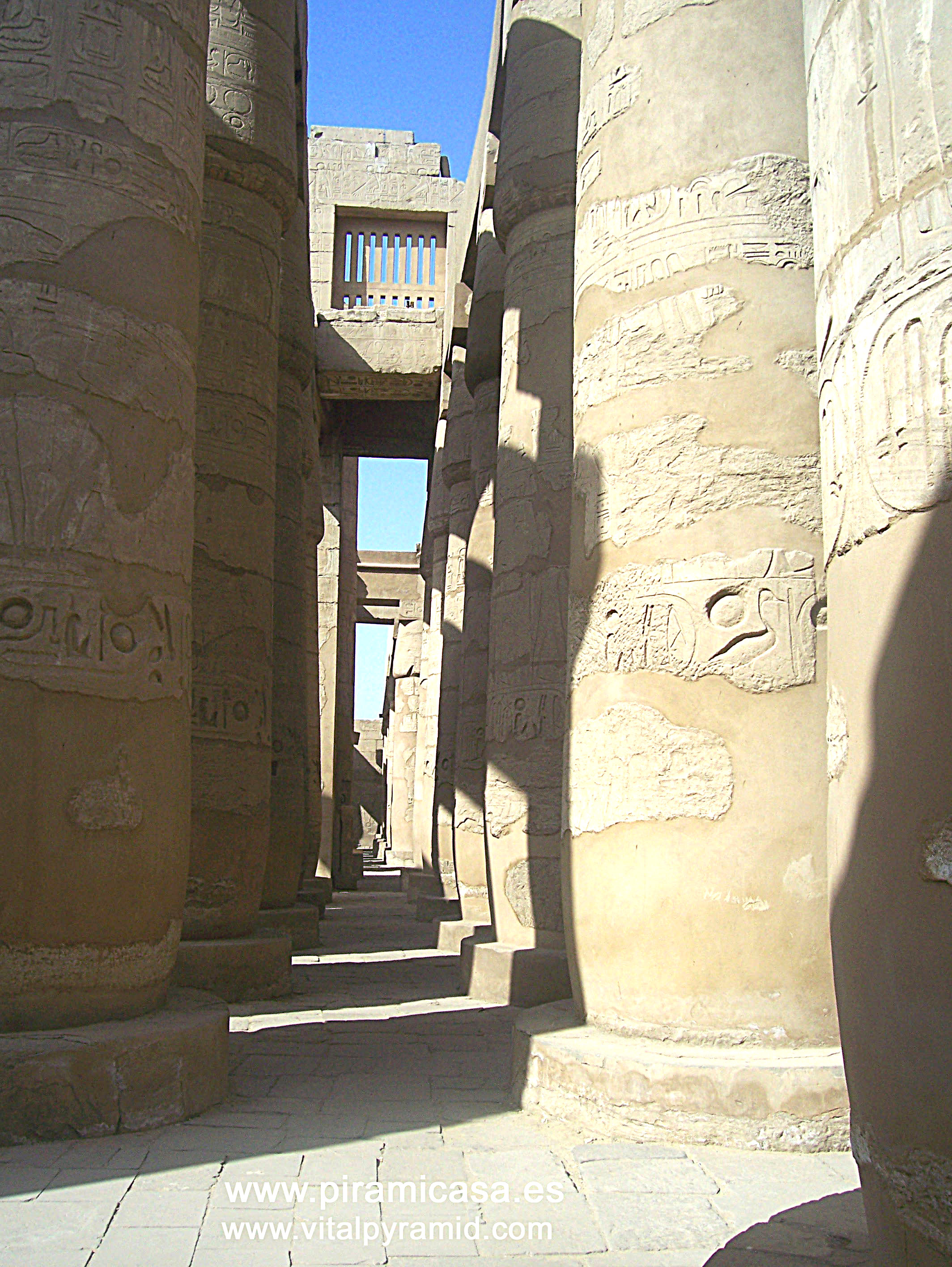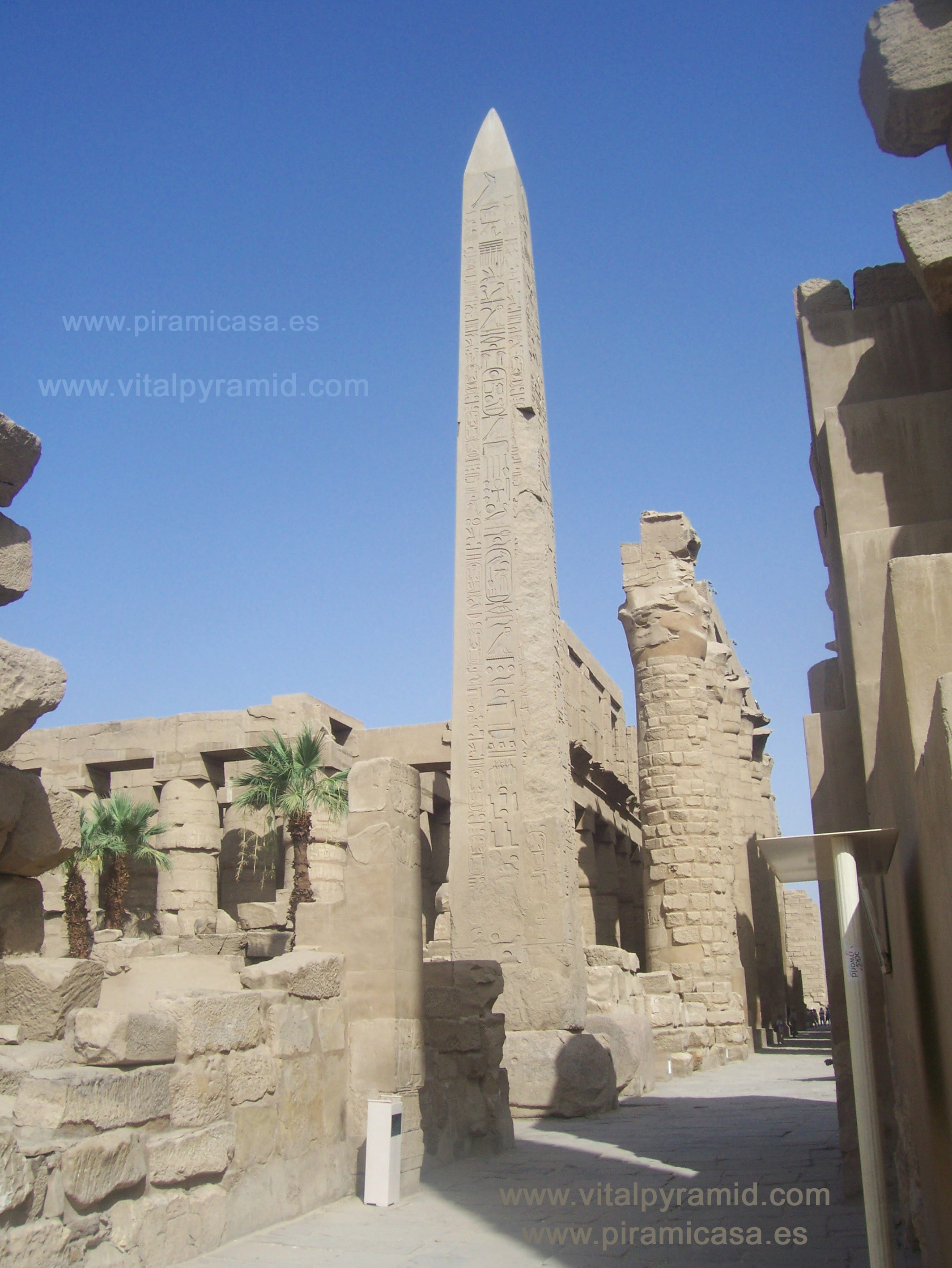 El Templo de Karnak en Egipto está formado por columnas enormes, fue donde se llevaron muchos de los más grandes obeliscos y de allí se llevaron hacia otros países algunos, los más pequeños. Aún no pueden decir los arqueólogos cómo pudieron cortarse en Aswan, ni como se transportaron aunque "explican" que con sogas y barquitos de madera... No pueden decir cómo los alzaron una vez en su destino... Aunque propongan la idea de que hicieron un pozo y los metiero allí. ¿Y cómo llevaron las bases al nivel del suelo? ¿Tenían montado un sistema hidráulico en el fondo?, ¿Y cómo no se les quebró, considerando el tonelaje y forma de los obeliscos ? En fin, que aunque desordenadas las fotografías, para los que conocen el templo no será problema ubicar a qué parte corresponde cada imagen.