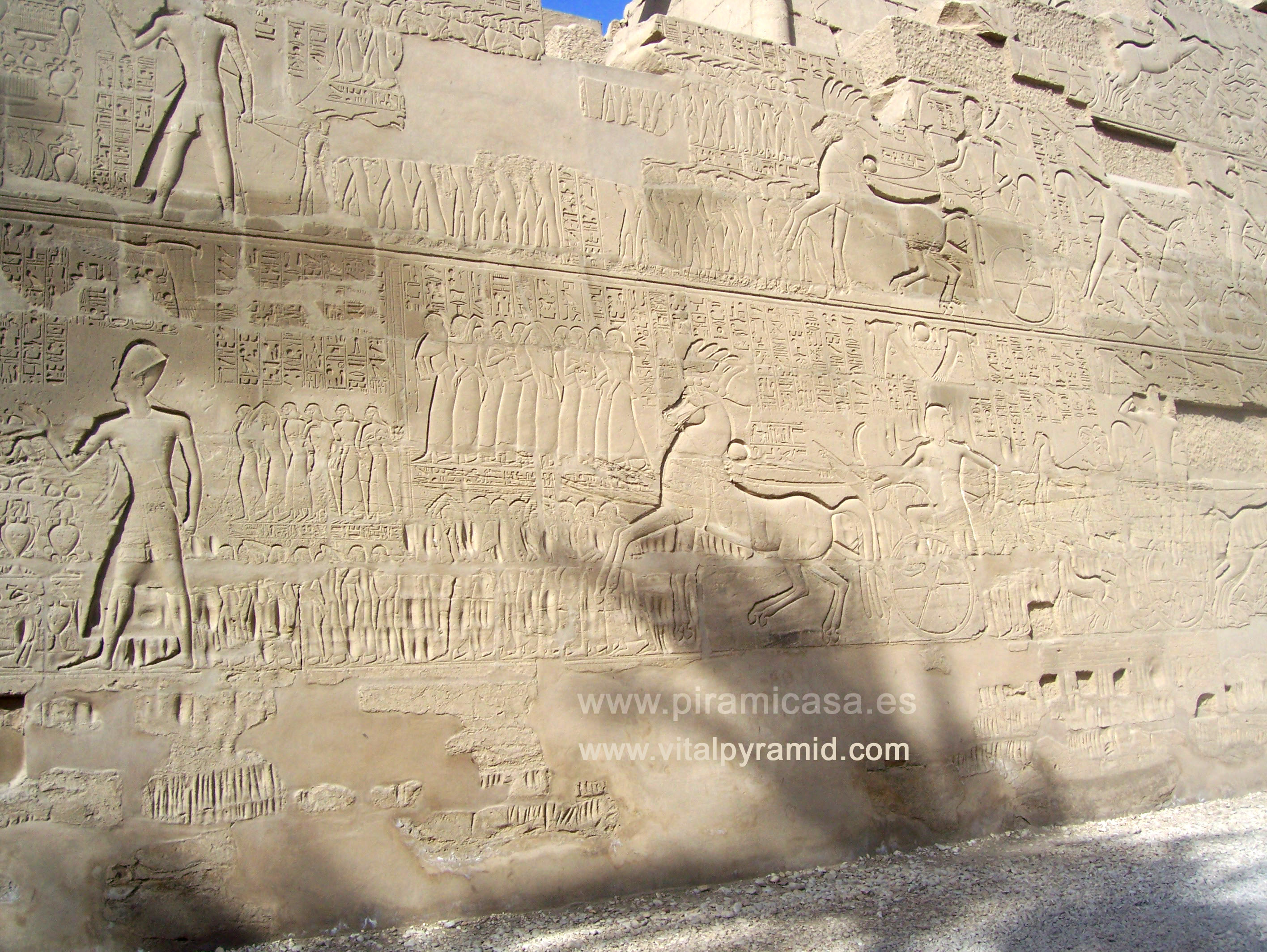 Las escenas de guerra que vemos en este grabado tienen diferencias de estilo y al parecer diferencia de tecnología respecto a otras partes del Templo de Karnak. Es como si hubiesen sido grabadas con una técnica similar pero inferior a la original. Puede que entre diversas partes del recinto de Karnak (como en casi todos los Templos de Egipto) hubiese modificaciones con siglos o milenios de diferencia, pero ni remotamente como suponen las teorías oficiales. No por competencias entre sucesivos faraones, sino por adecuaciones utilizando las partes más desgastadas de lo original.