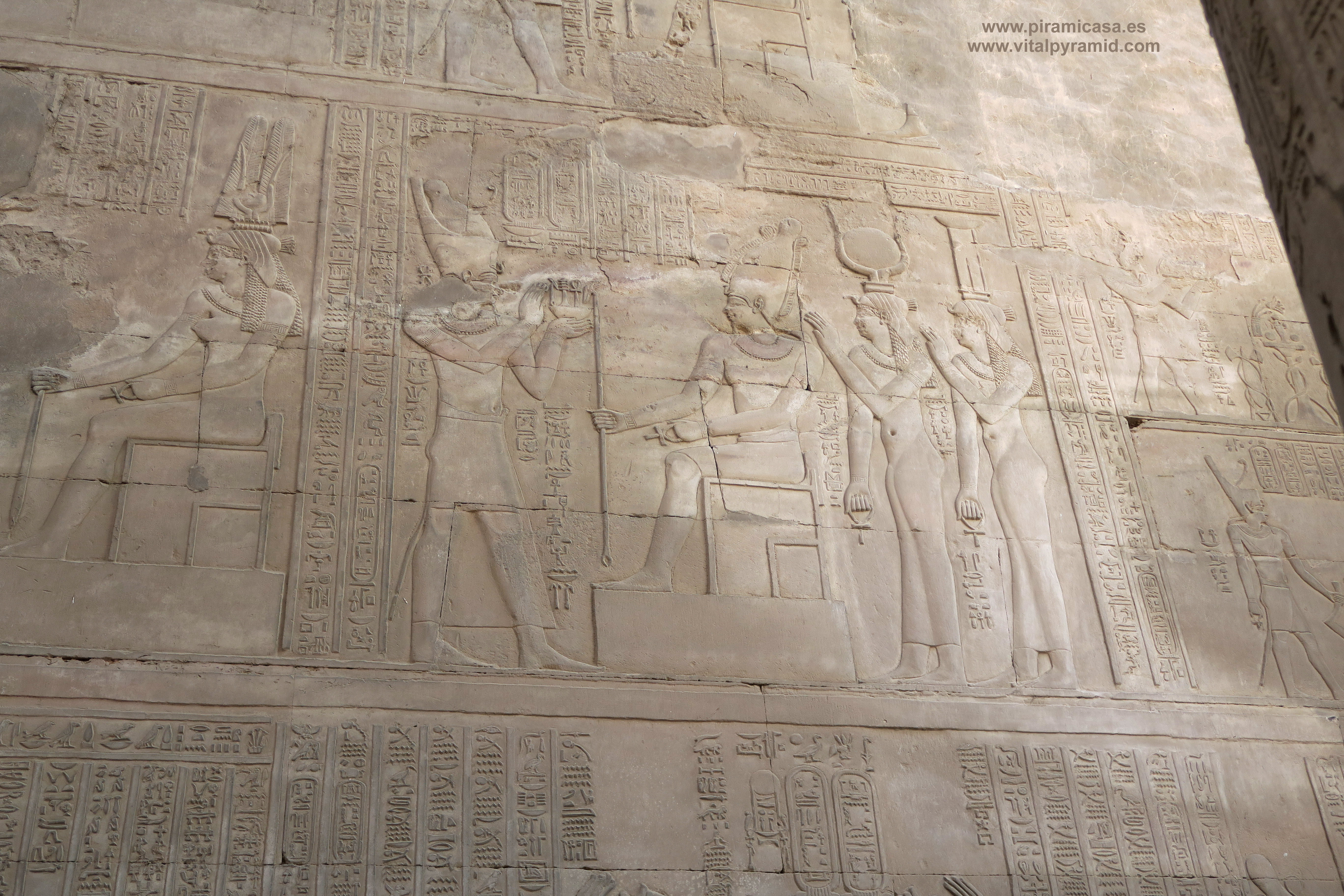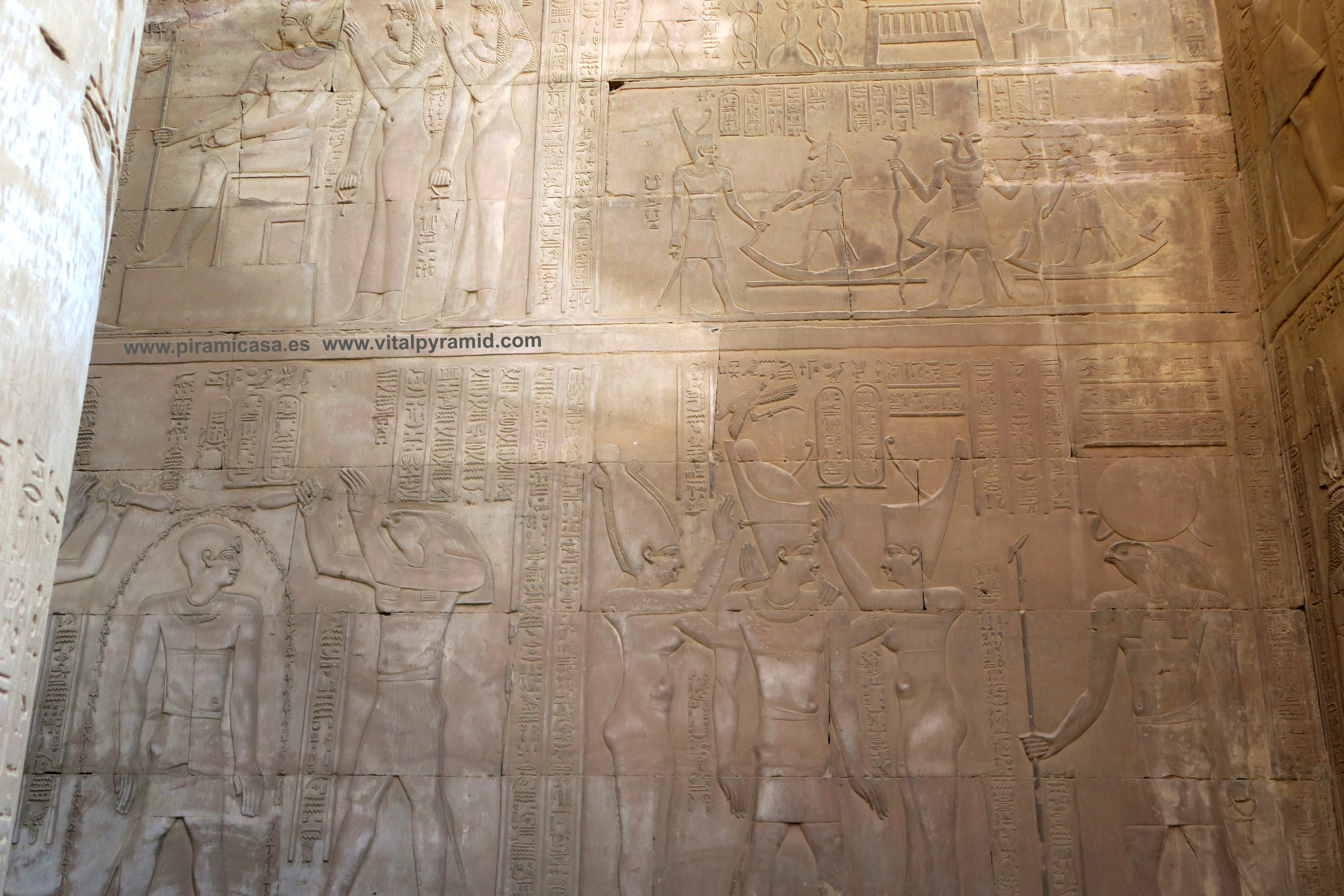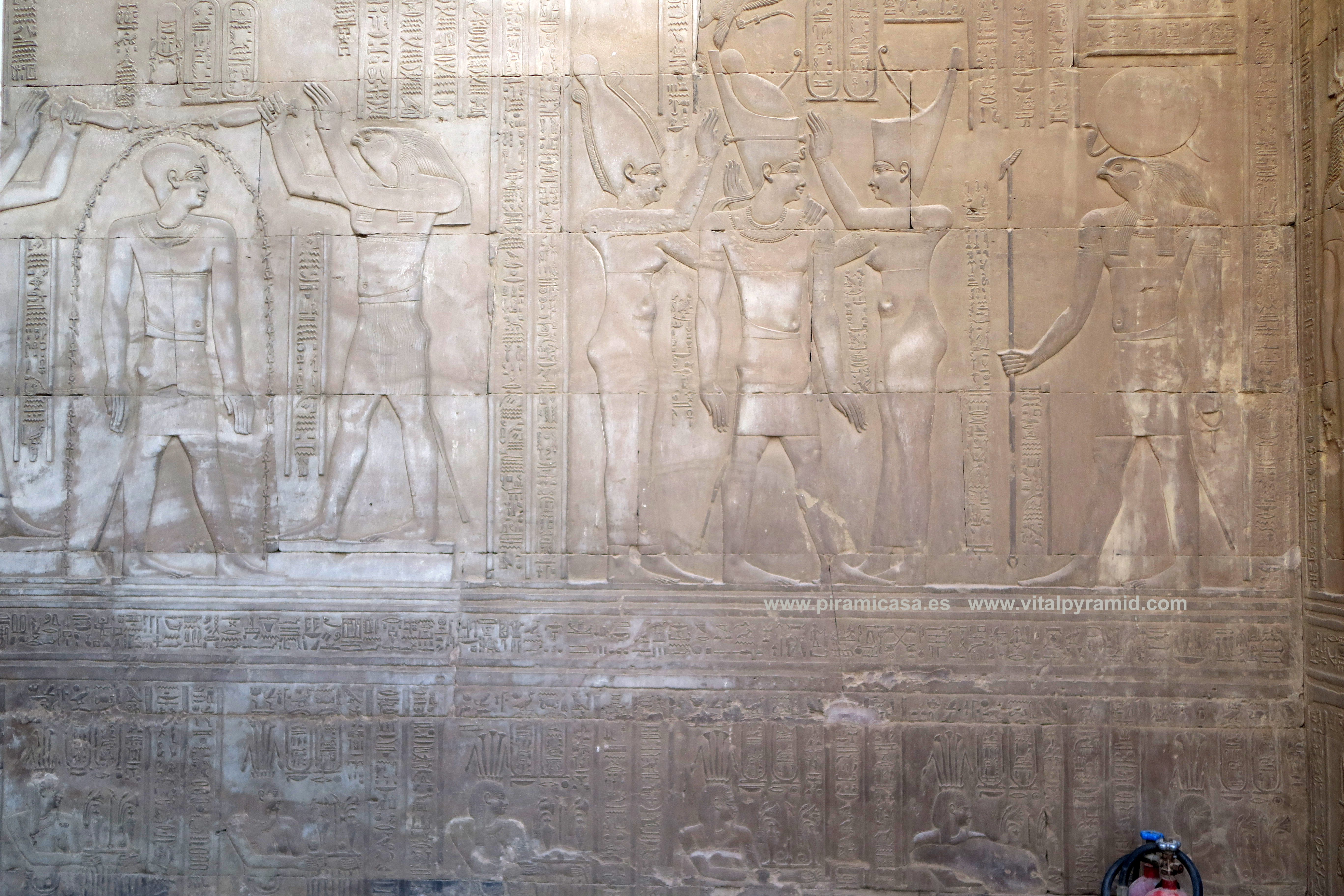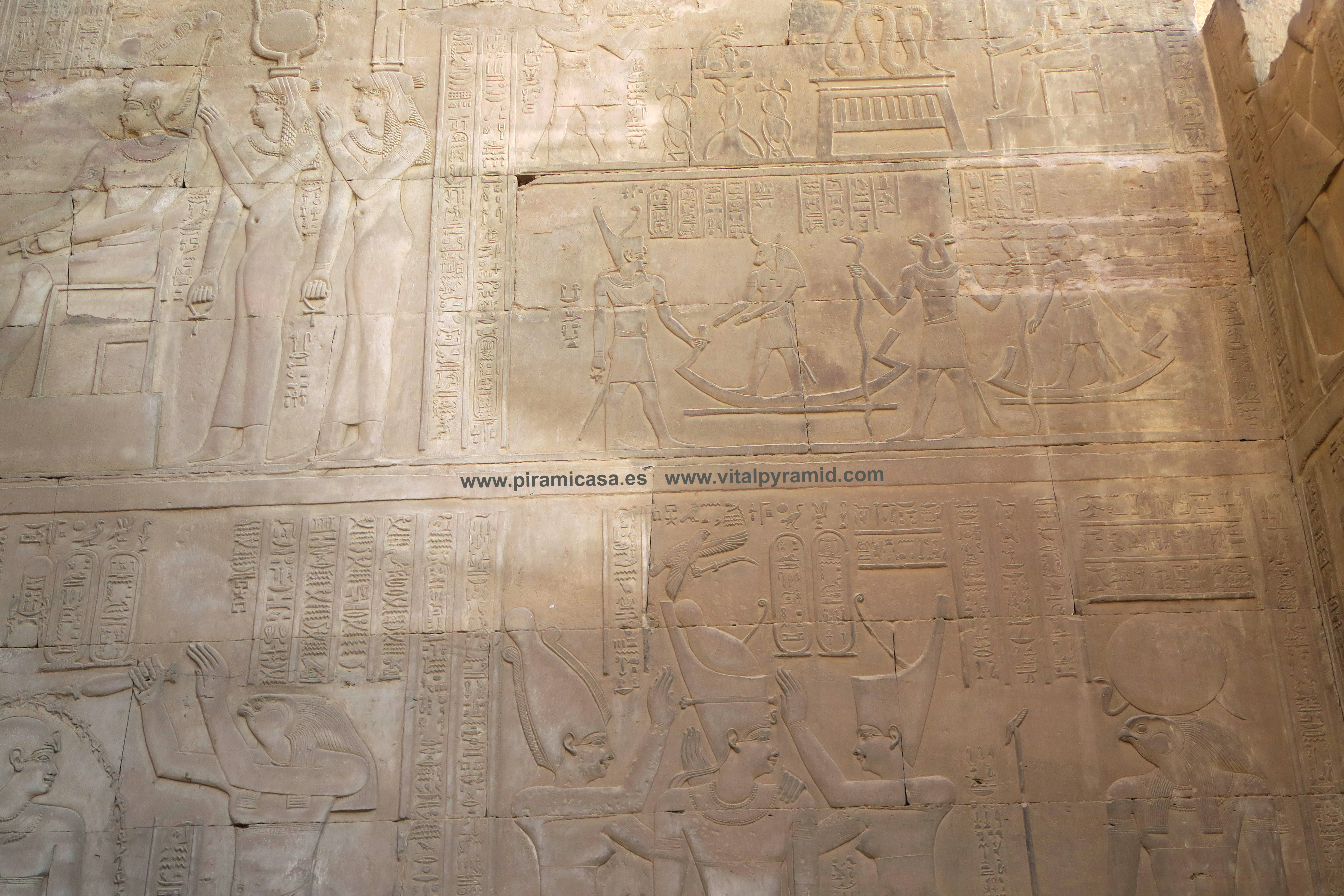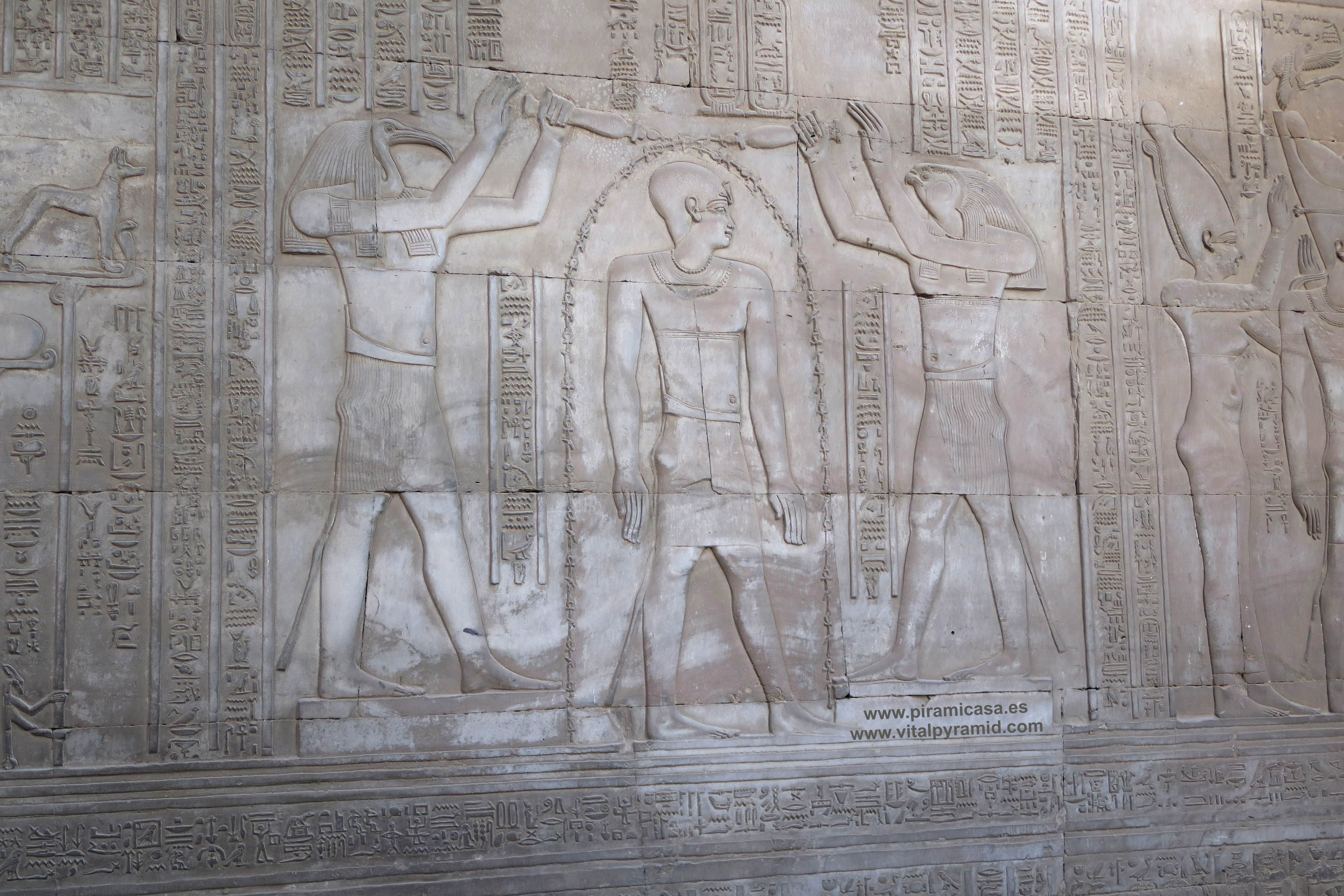 Seguimos en el Templo de Kom Ombo y en esta parte vemos abundantes escenas del proceso e iniciación del sacerdote, faraón o cualquier estudiante. Que se le represente con los símbolos de poder, sus coronas, etc., no significa que se trate de alguien en especial. Podríamos decir que es "el estudiante", "el iniciado", el que ha llegado a ser Maestro, al margen del rango que vaya a ocupar. Ha pasado por las pruebas, ha sido ungido por la enegía de Toth (el Mensajero o Didacta), por Horus (La Consciencia), por Isis (la Ciencia), por Osiris (el Conocimiento) y por Sobek (El Instinto). Sólo comprendiendo en su justo valor las idiografías de esos "dioses" caemos en la cuenta de lo importante del proceso que ha llevado todo aquel que entrata antaño a este "templo". Como quien entra a una Universidad, aunque sin duda allí recibían verdaderos conocimientos, no la sarta de bobadas que se suele enseñar hoy en nuestro sistema esclavista, que genera sólo buenos empleados, buenos capataces, buenos competidores económicos, buenos sirvientes del sistema en todos sus rangos. Allí se convertían en Seres Trascendentes...