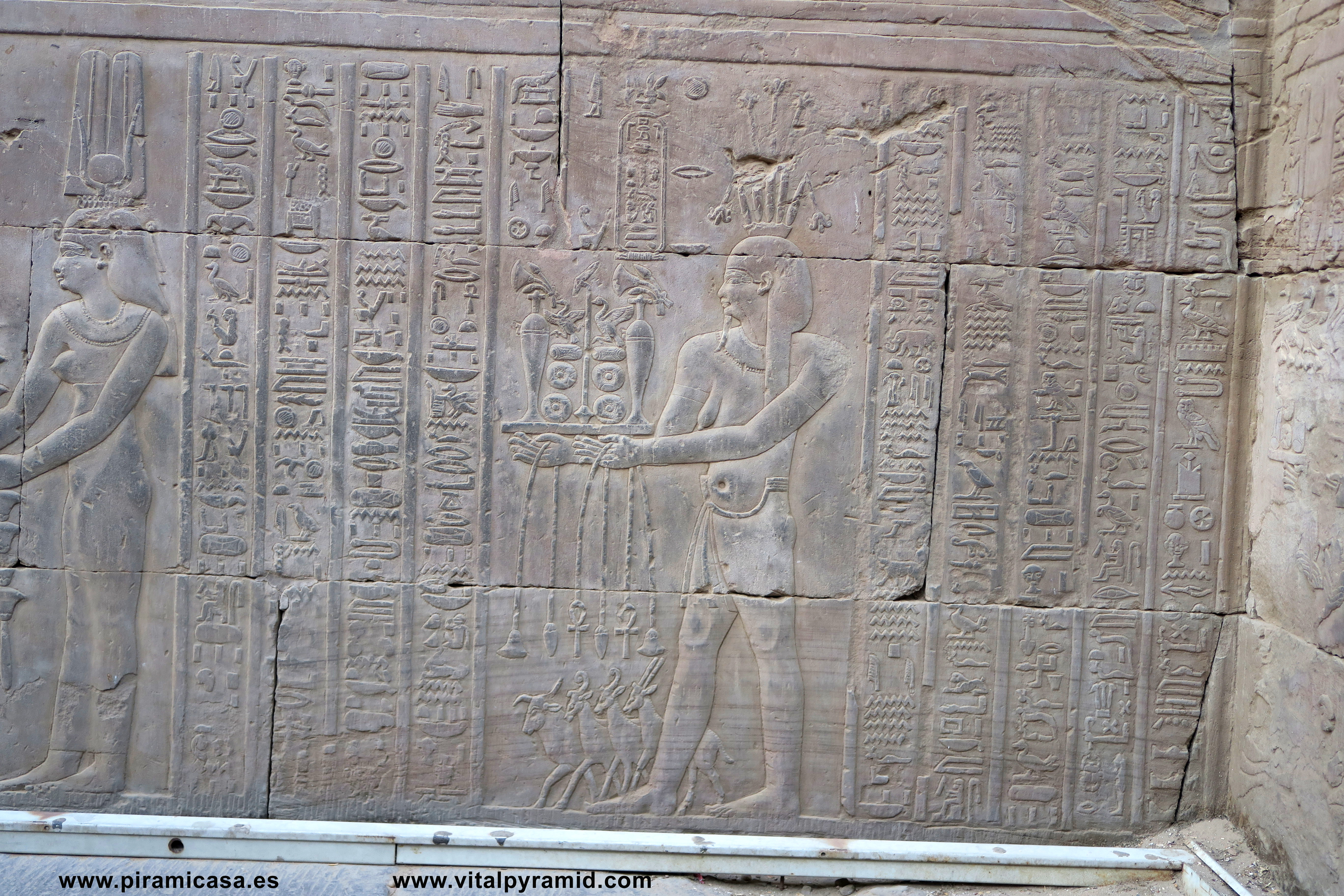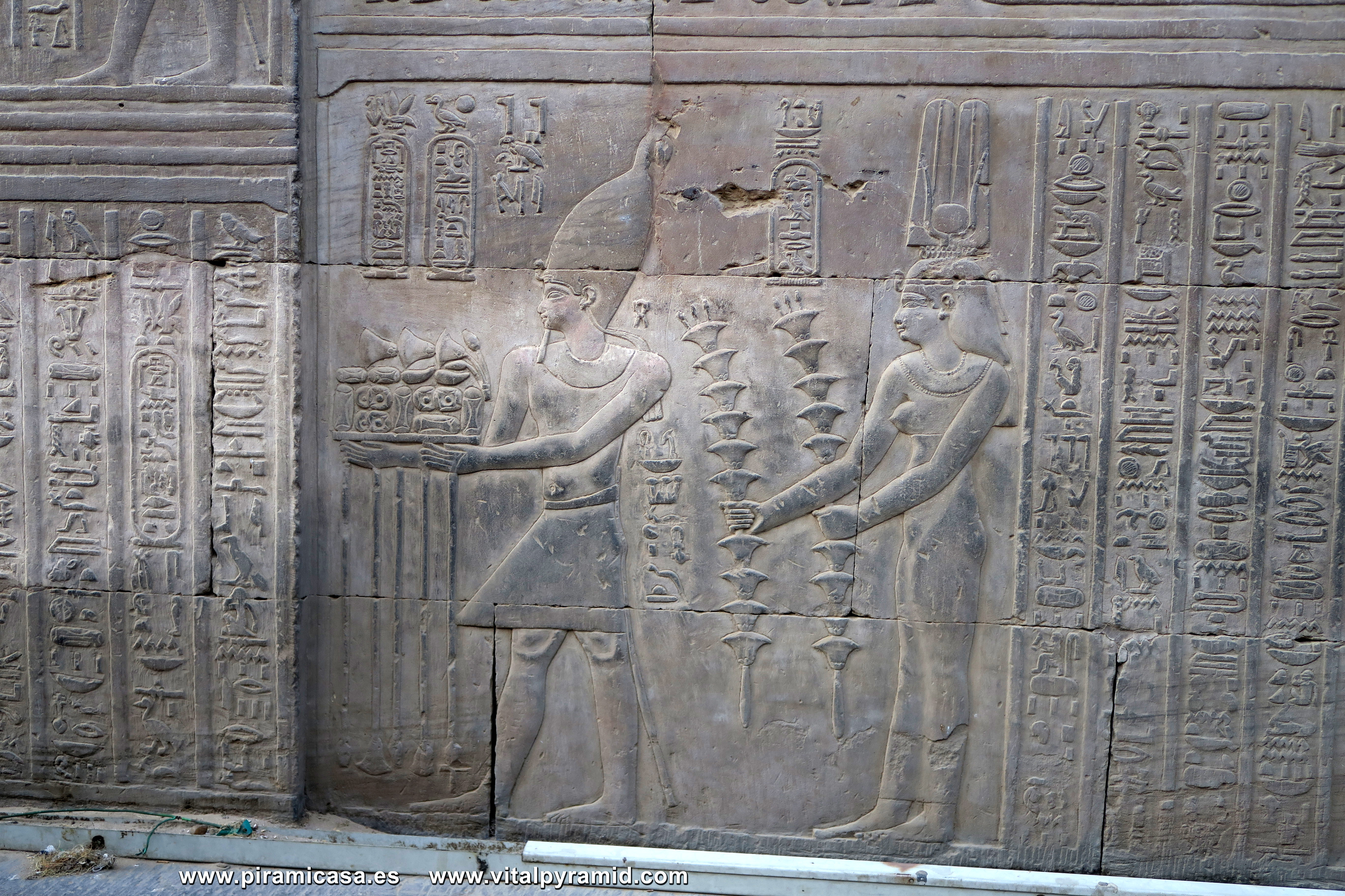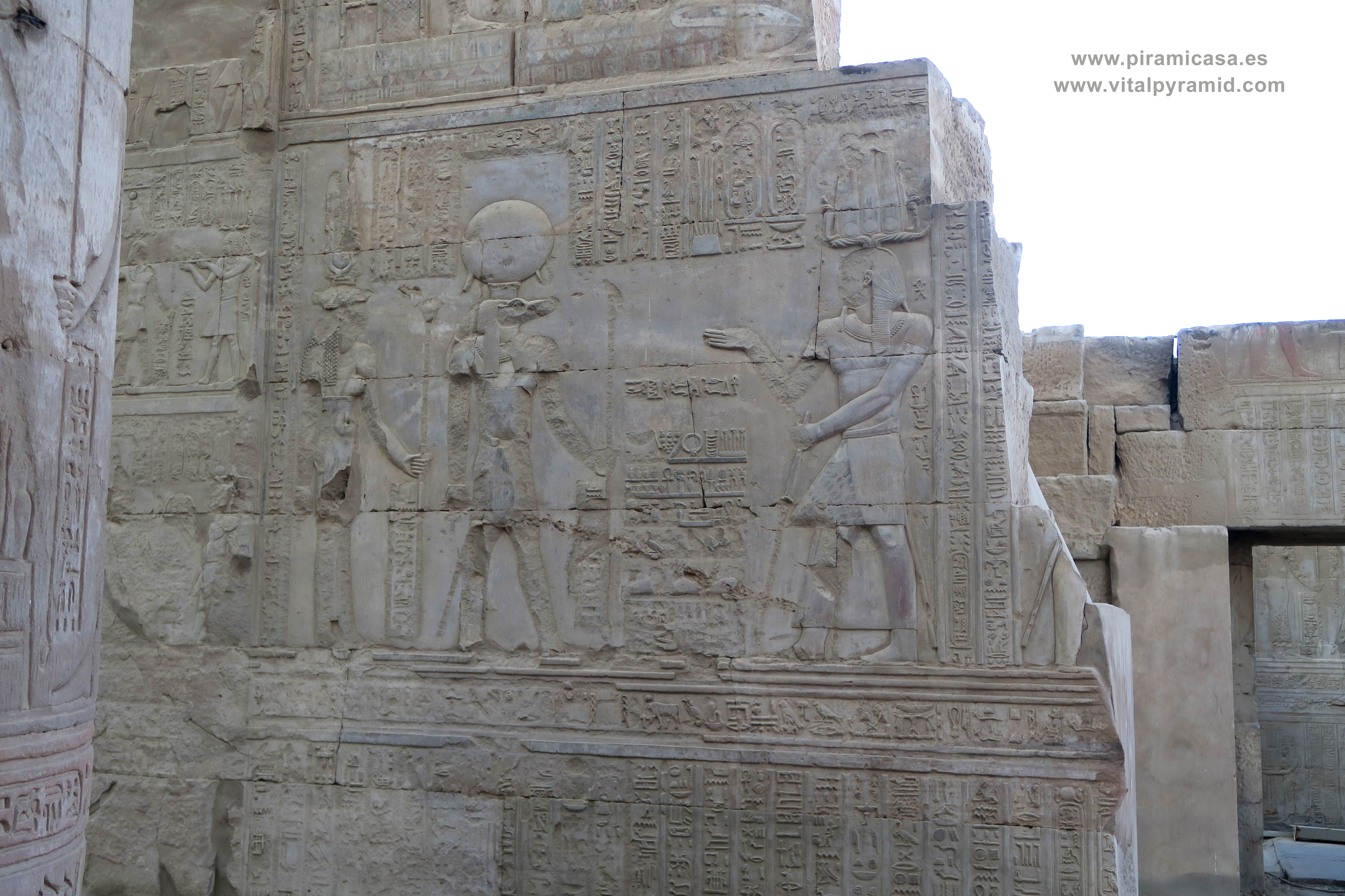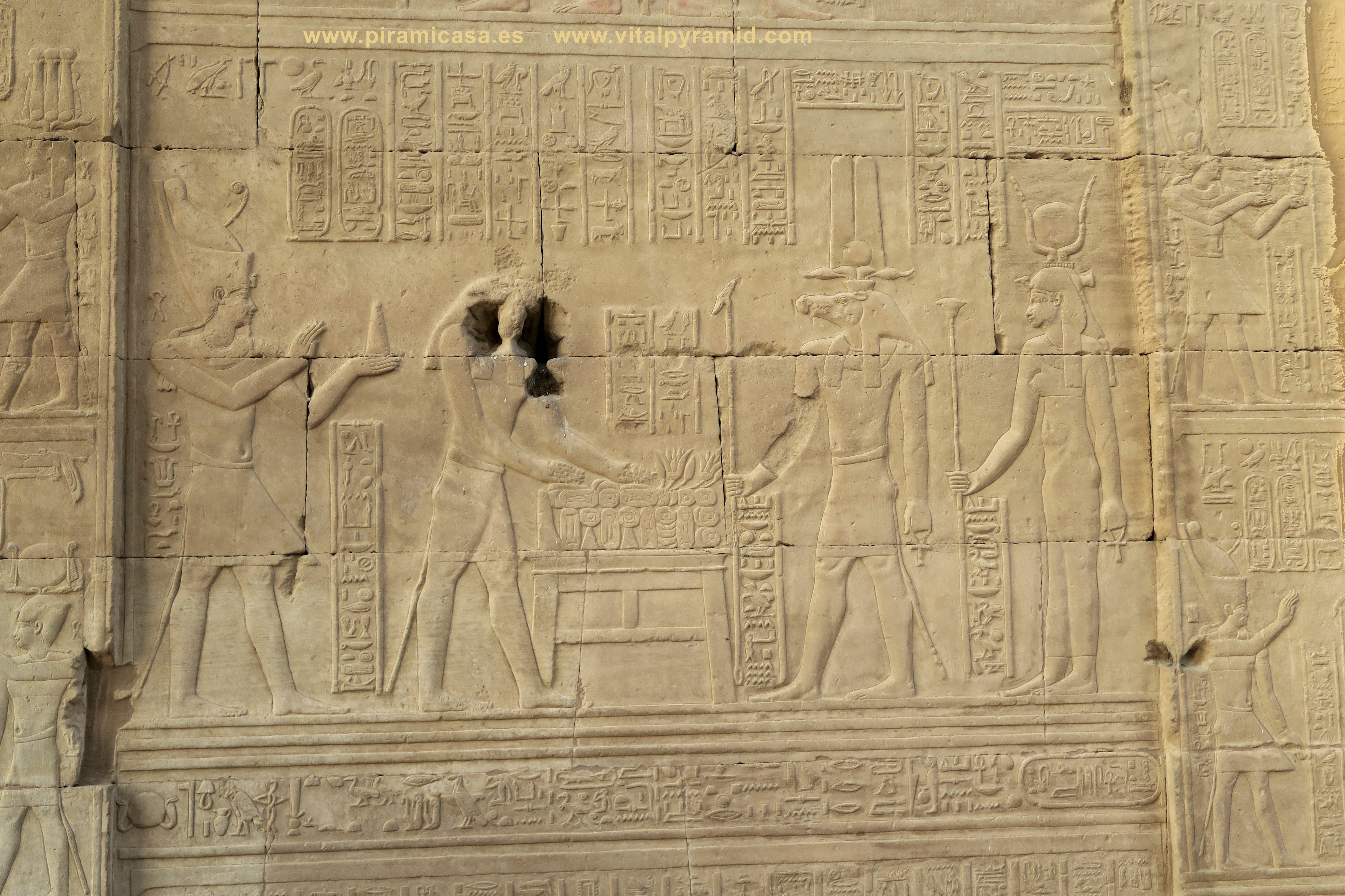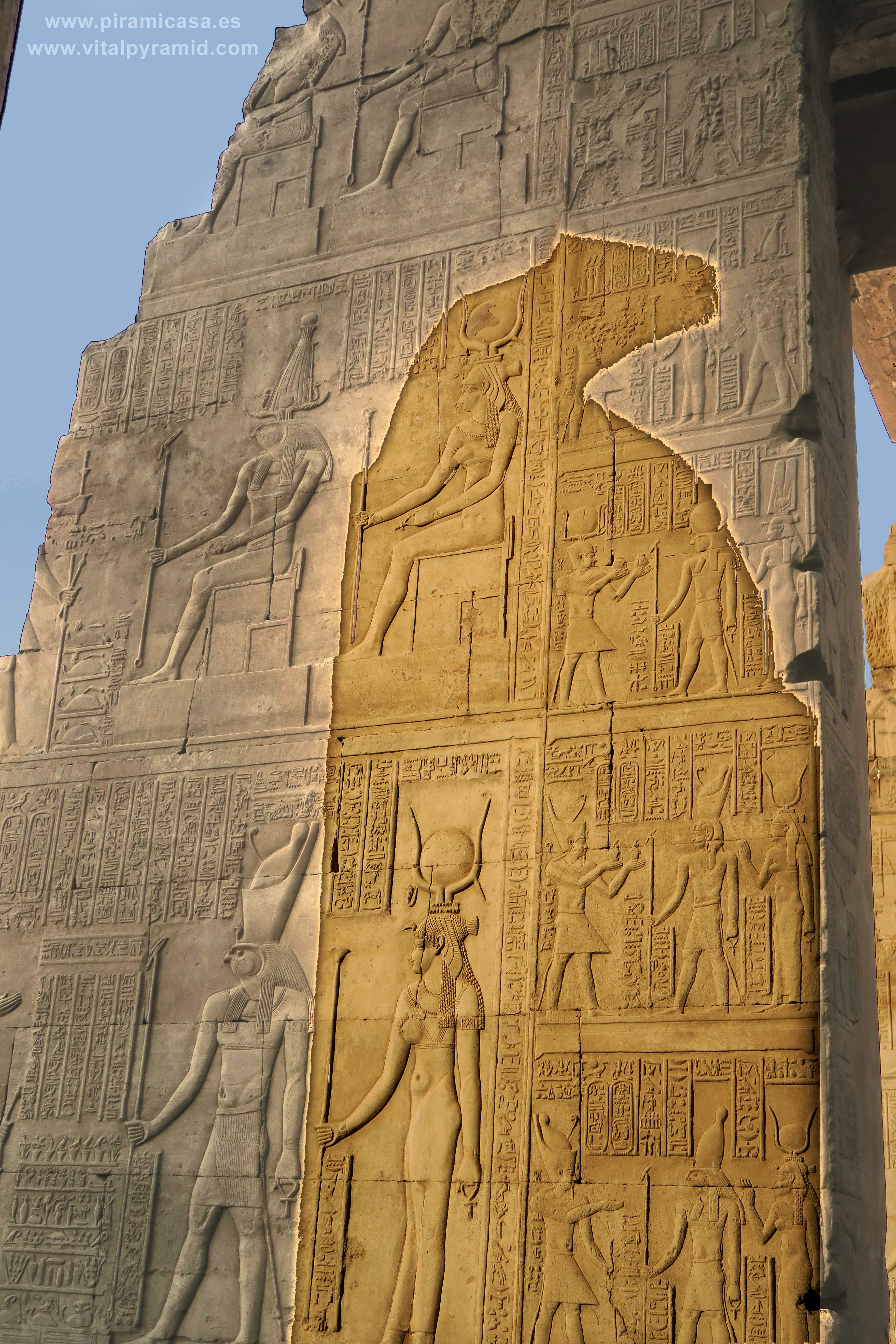 Seguimos en el Templo de Kom Ombo y en esta parte vemos abundantes escenas del proceso e iniciación del sacerdote, faraón o cualquier estudiante. Que se le represente con los símbolos de poder, sus coronas, etc., no significa que se trate de alguien en especial. Podríamos decir que es "el estudiante", "el iniciado", el que ha llegado a ser Maestro, al margen del rango que vaya a ocupar. Ha pasado por las pruebas, ha sido ungido por la enegía de Toth (el Mensajero o Didacta), por Horus (La Consciencia), por Isis (la Ciencia), por Osiris (el Conocimiento) y por Sobek (El Instinto). Sólo comprendiendo en su justo valor las idiografías de esos "dioses" caemos en la cuenta de lo importante del proceso que ha llevado todo aquel que entrata antaño a este "templo". Como quien entra a una Universidad, aunque sin duda allí recibían verdaderos conocimientos, no la sarta de bobadas que se suele enseñar hoy en nuestro sistema esclavista, que genera sólo buenos empleados, buenos capataces, buenos competidores económicos, buenos sirvientes del sistema en todos sus rangos. Allí se convertían en Seres Trascendentes...