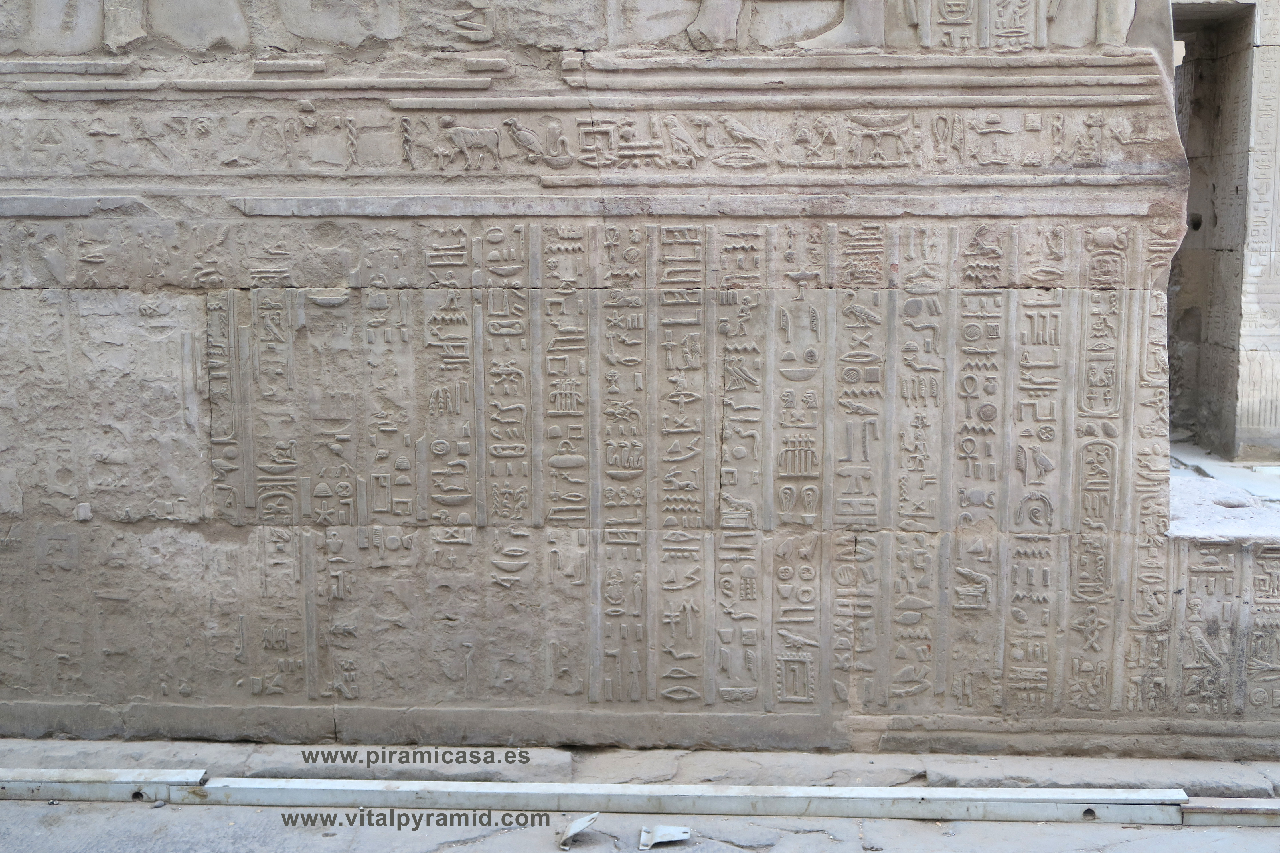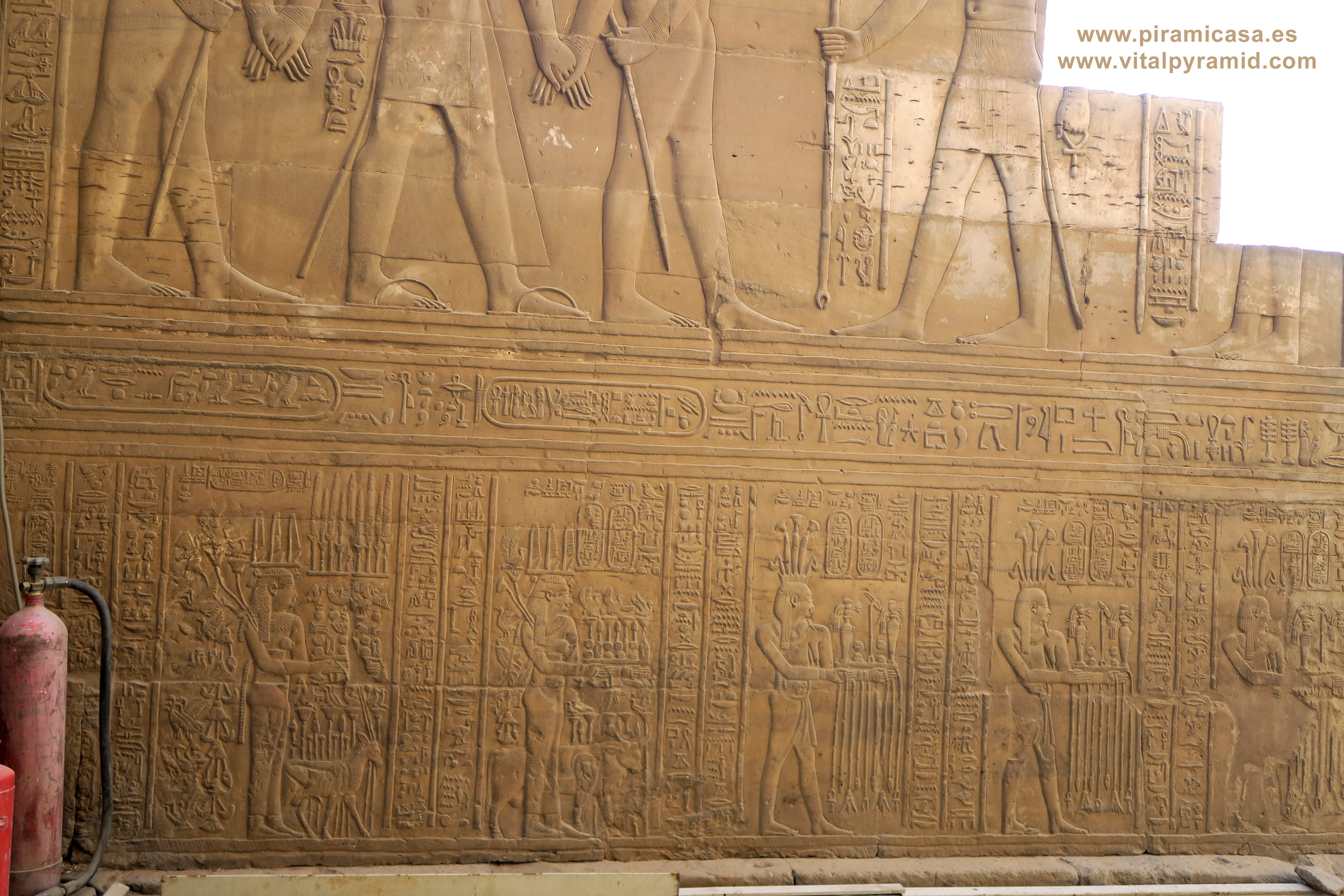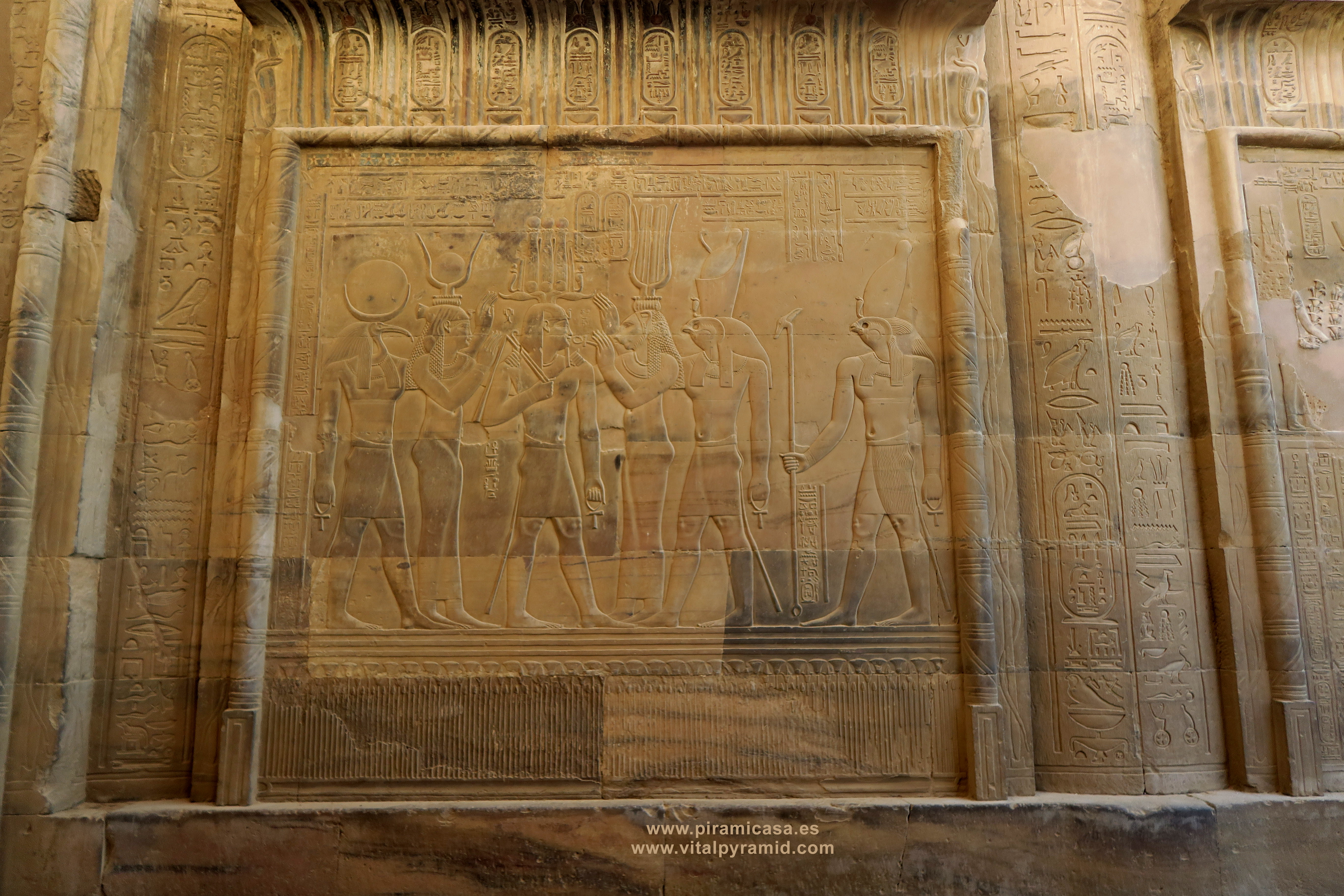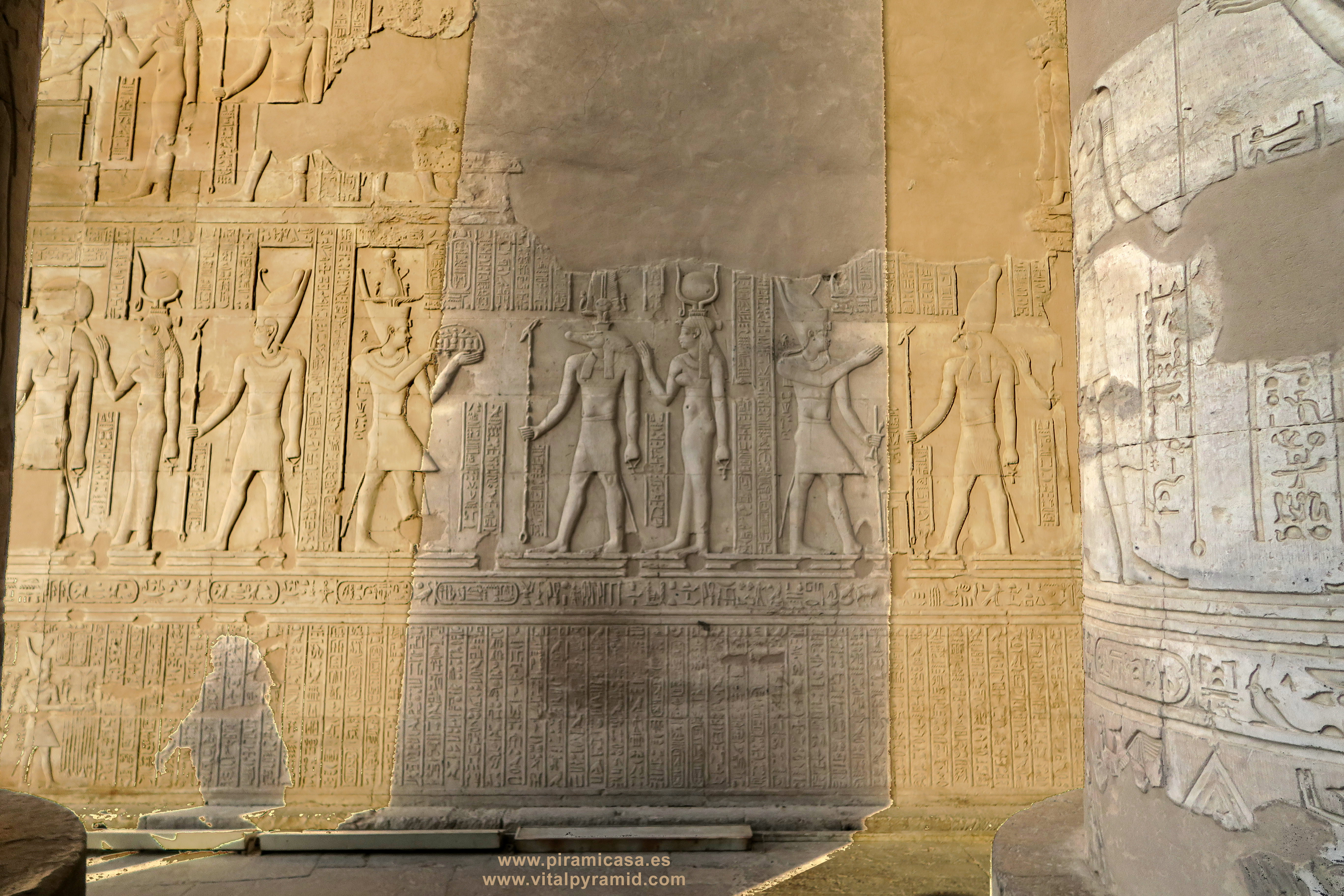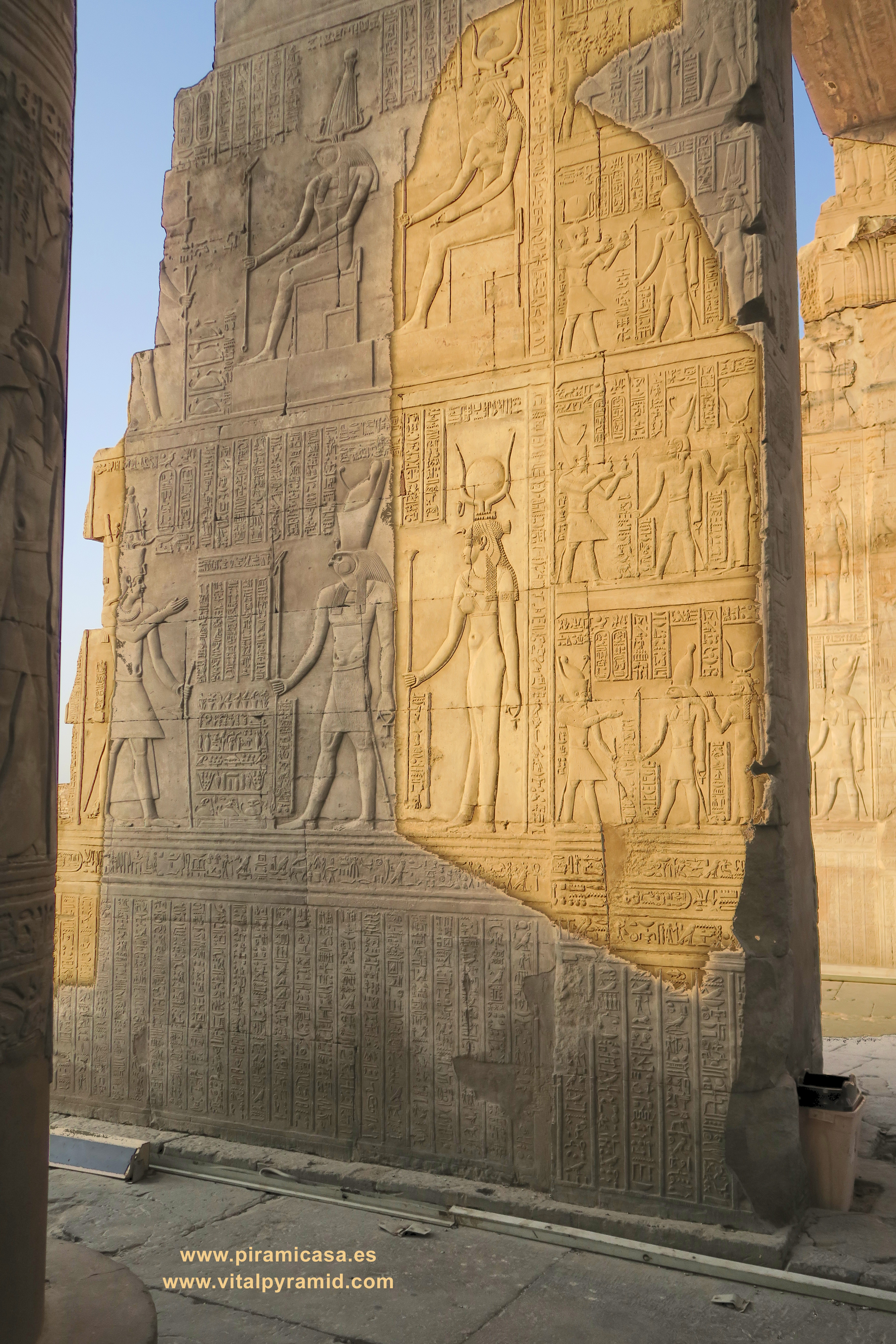Seguimos en el Templo de Kom Ombo y en esta parte vemos abundantes escenas del proceso e iniciación del sacerdote, faraón o cualquier estudiante. Que se le represente con los símbolos de poder, sus coronas, etc., no significa que se trate de alguien en especial. Podríamos decir que es "el estudiante", "el iniciado", el que ha llegado a ser Maestro, al margen del rango que vaya a ocupar. Ha pasado por las pruebas, ha sido ungido por la enegía de Toth (el Mensajero o Didacta), por Horus (La Consciencia), por Isis (la Ciencia), por Osiris (el Conocimiento) y por Sobek (El Instinto). Sólo comprendiendo en su justo valor las idiografías de esos "dioses" caemos en la cuenta de lo importante del proceso que ha llevado todo aquel que entrata antaño a este "templo". Como quien entra a una Universidad, aunque sin duda allí recibían verdaderos conocimientos, no la sarta de bobadas que se suele enseñar hoy en nuestro sistema esclavista, que genera sólo buenos empleados, buenos capataces, buenos competidores económicos, buenos sirvientes del sistema en todos sus rangos. Allí se convertían en Seres Trascendentes...