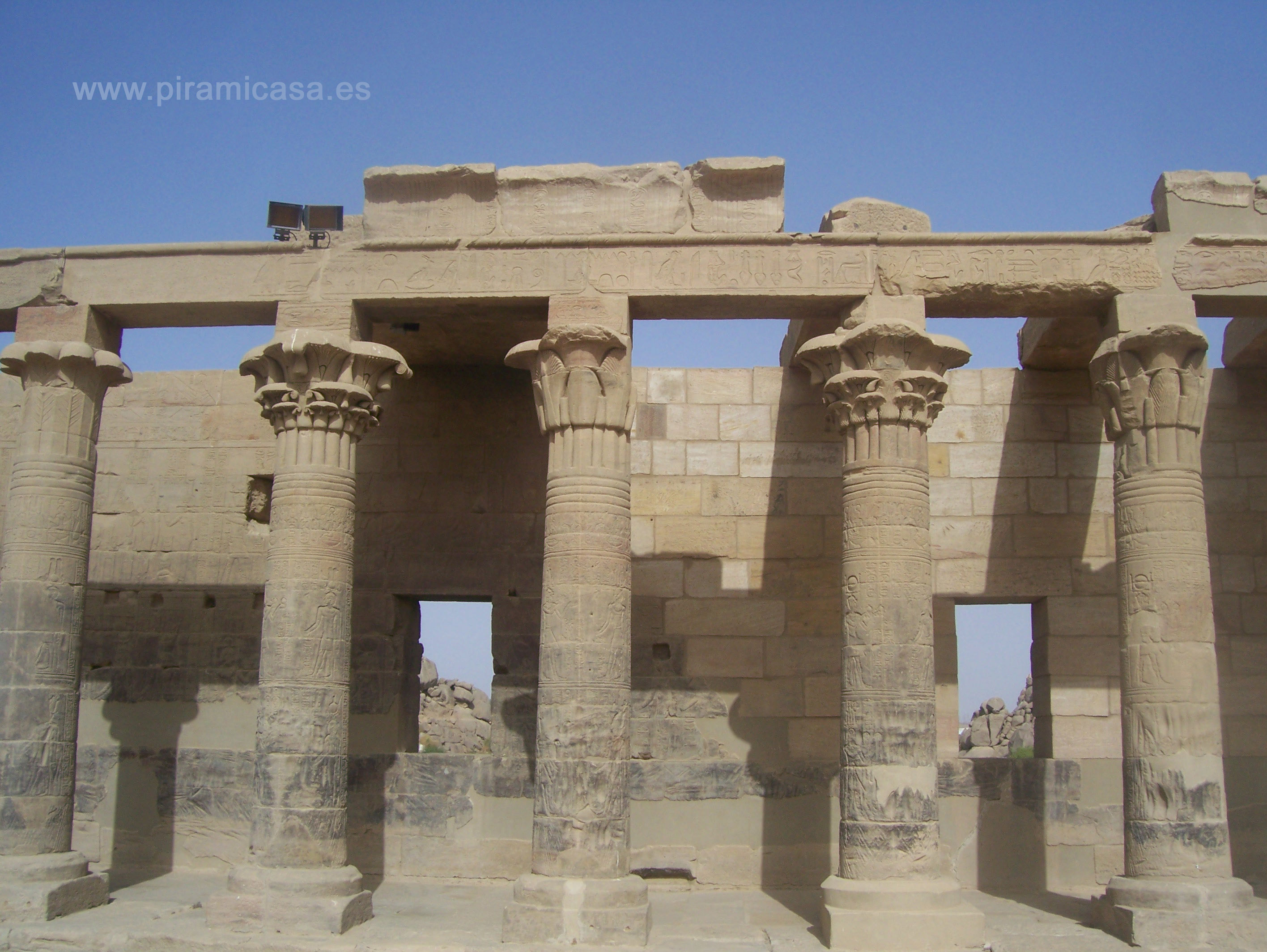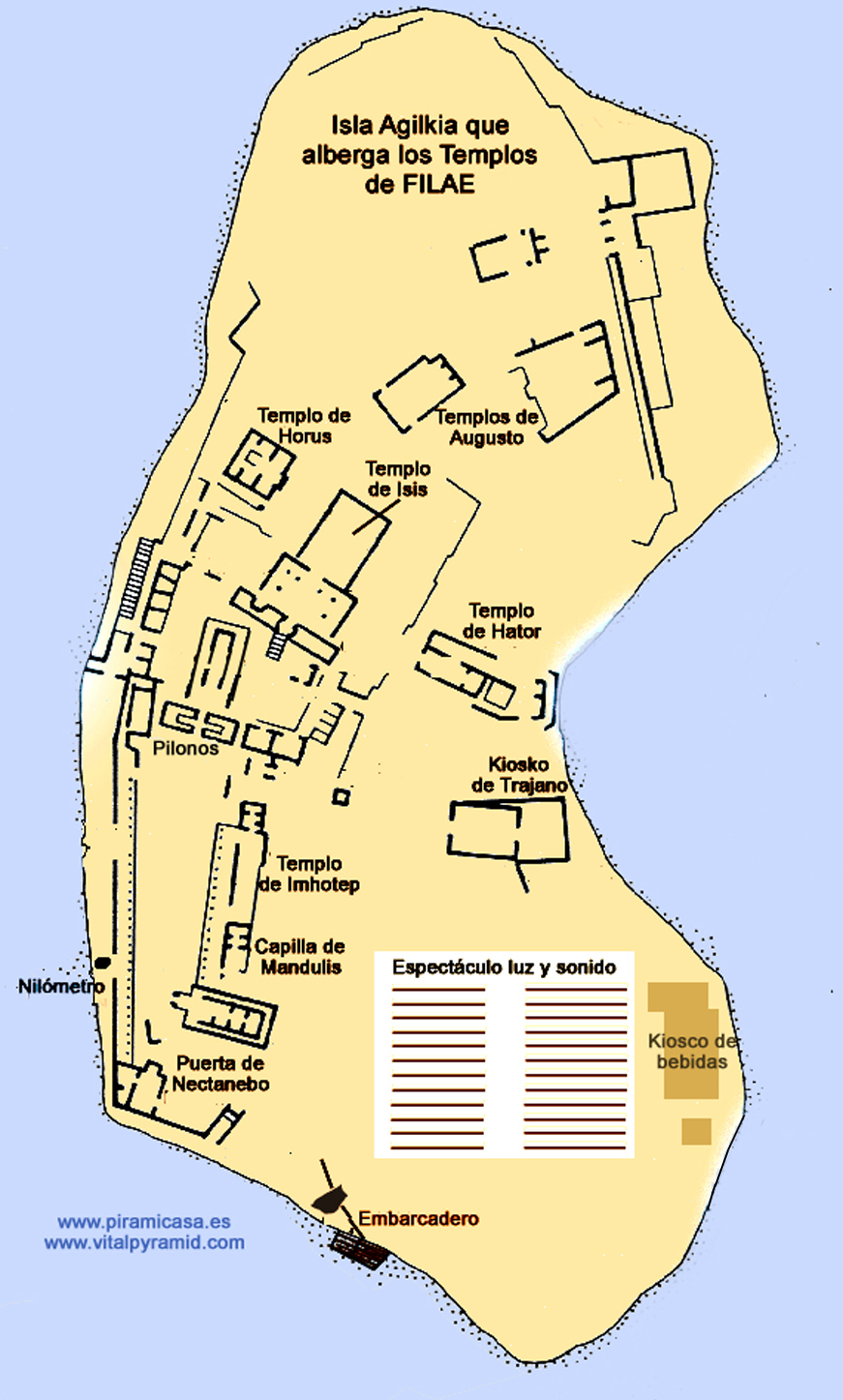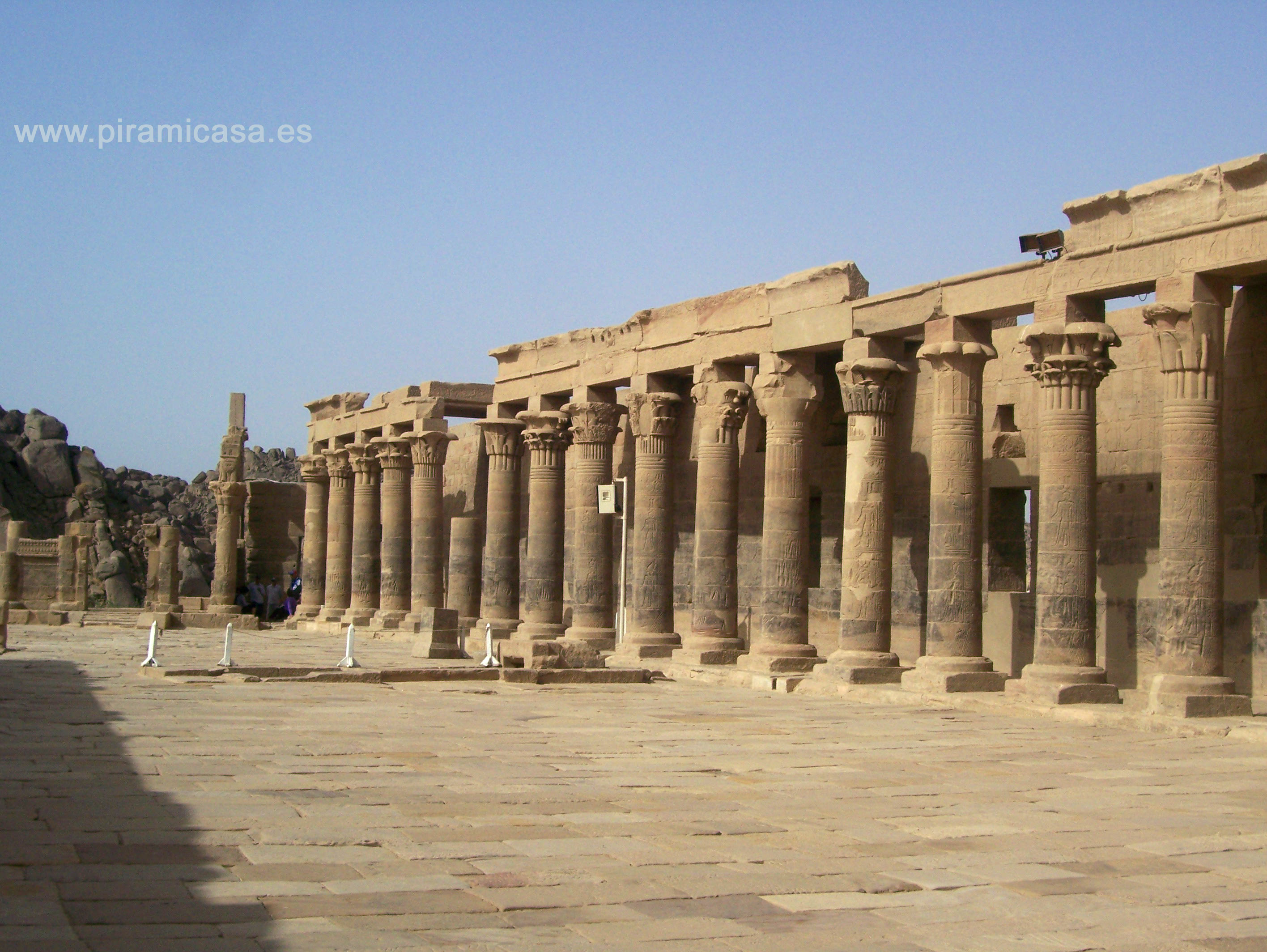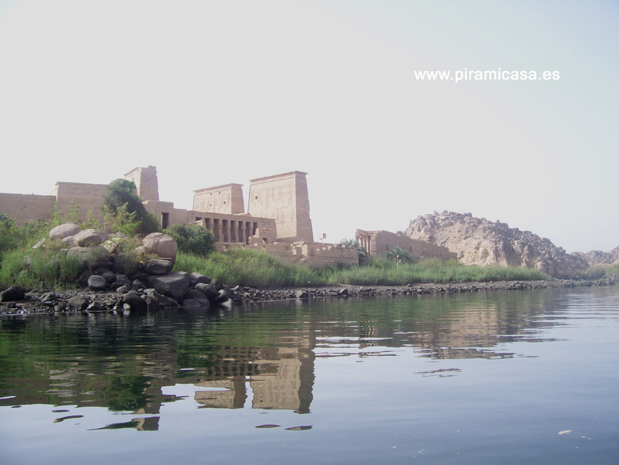 La Isla de Filae nos presenta un templo que también ha sido modernamente desplazado para salvarlo de las aguas del Nilo, pero también se aprecian en la obra una larga serie de defectos en la reconstrucción. No obstante, no ha sido tan "chapuza" como Abu Simbel. No se ha intentado reconstruir partes, sino cortar, trasladar y ensamblar lo existente. Una obra de ingeniería realmente muy encomiable. La Isla de File estaba a unos 700 metros al Sur-Este del actual emplazamiento de estos templos. La isla actualmente llamada de File se llamaba Agilkia (o Agilika) y dadas sus dimensiones y altitud se prestó muy bien para emplazar los templos que había que rescatar de las aguas, que tras la construcción de la Represa de Aswan modificarían mucho el paisaje del Nilo en esa zona.