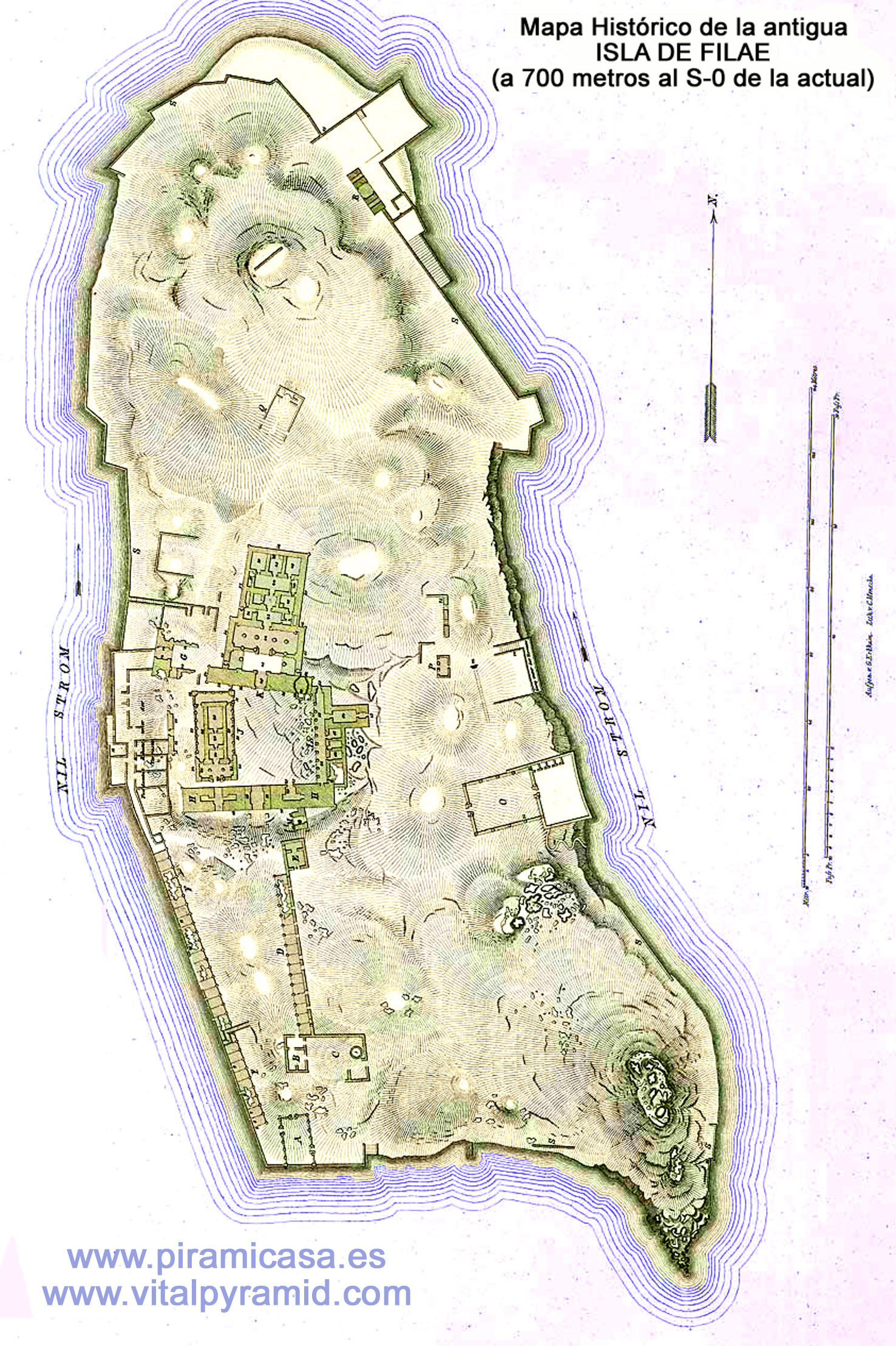 Aquí tenemos el mapa del emplazamiento actual, es decir de la Isla de Agilika, y al lado el mapa histórico de la Isla de File, tal como estaba antes del salvamento.
