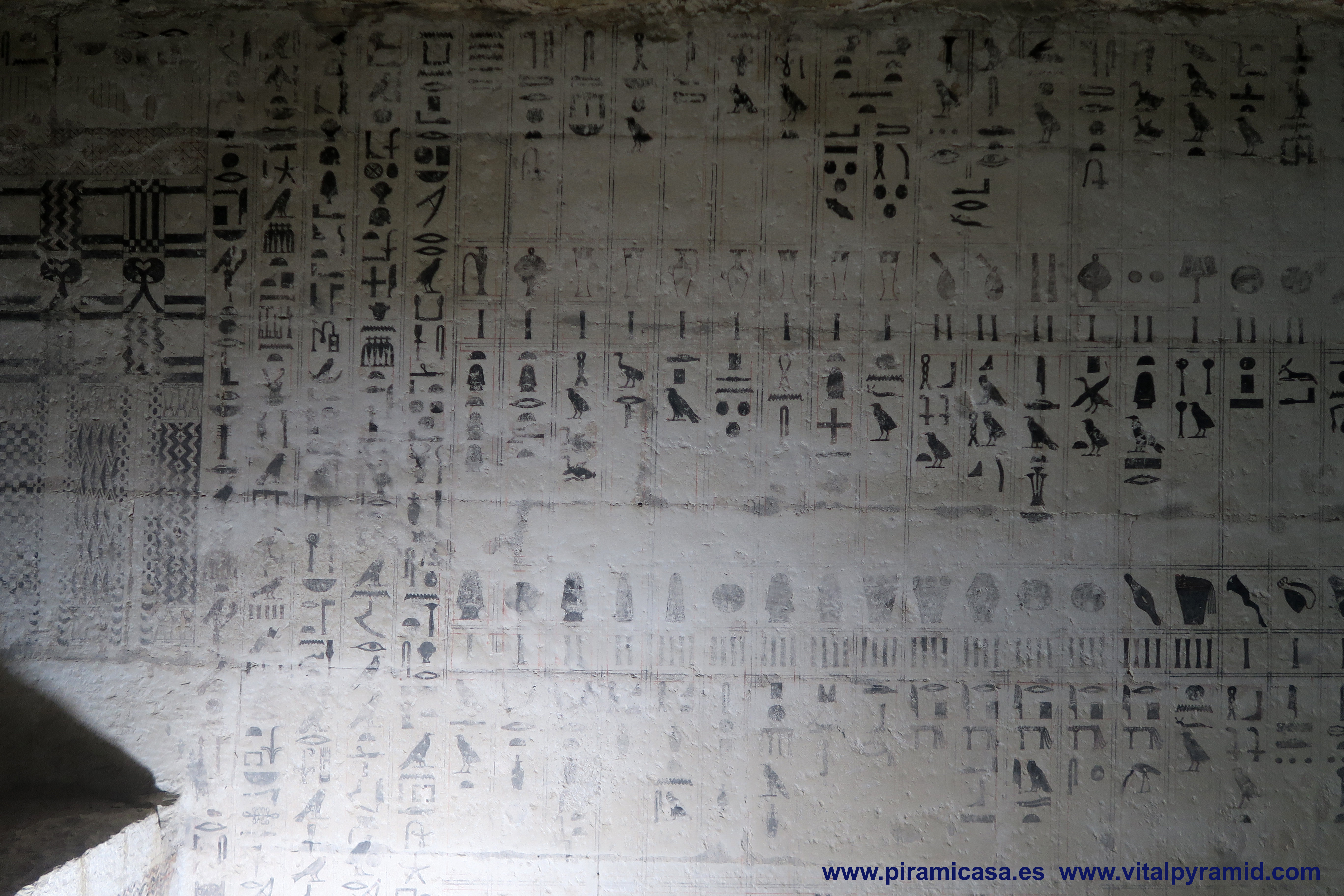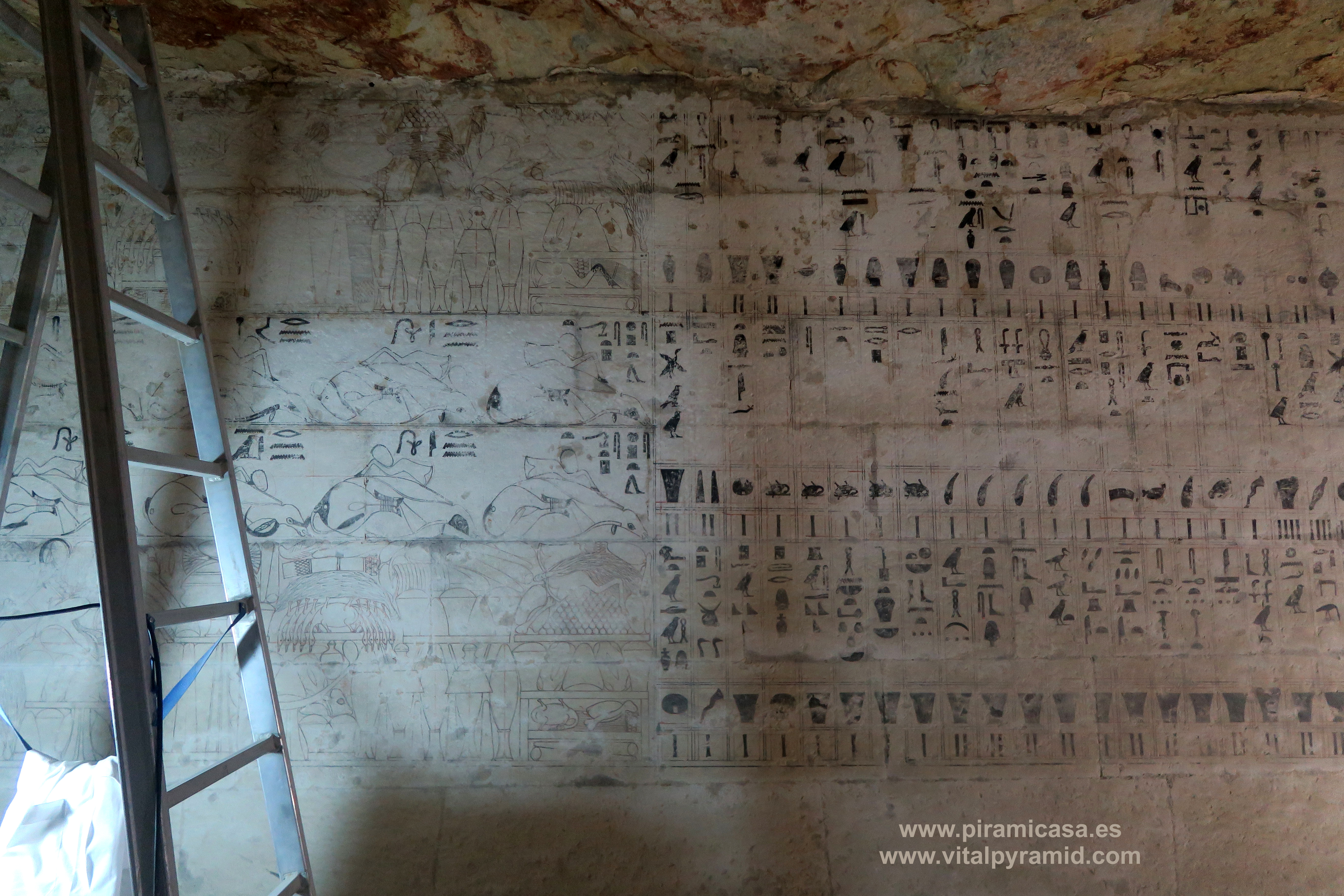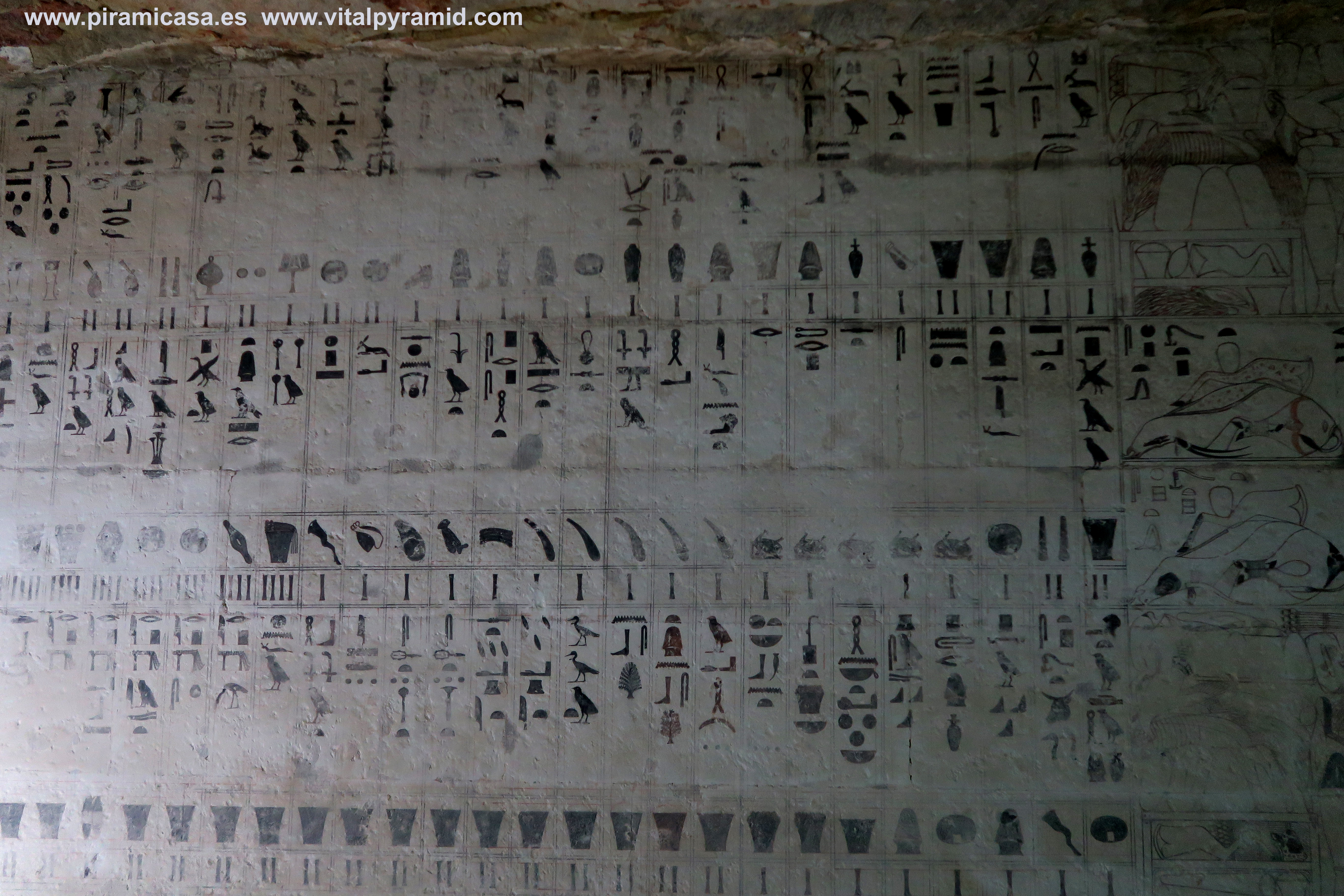 En Egipto vamos a encontrarnos en casi todas partes con supuestas tumbas, supuestas "necrópolis", como si todo lo antiguo hubiese sido cementerio, como si en todas partes se hubieran encontrado cadáveres, momias, ajuar mortuorio. Sin embargo en muy pocos sitios se han encontrado momias. Ni siquiera en el Valle de los Reyes, a excepción de la tumba de Tutankhamon, como explicamos en la sección del Valle de los Reyes. Mereruka presenta sólo escenas de caza, pesca, naturaleza, proceso y conservación de alimentos, así como temas de medicina. Empezamos por debajo del todo, en la cripta suberránea donde veremos un enorme tanque que nunca contuvo cadáver alguno. También recordemos que los jeroglíficos egipcios jamás han sido descifrados, constituyendo hasta hoy un misterio y una pseudociencia, toda vez que hay diversas teorías sin coherencia entre ella, elaboradas por egiptólogos de prestigio. Por lo tanto los jeroglíficos de estas cámaras también están para ser estudiados, analizados por criptógrafos y con toda seguridad, cuando sean correctamente traducidos se caerán la casi totalidad de las teorías que los antropólogos, arqueólogos y en especial los egiptólogos, exponen como verdades indiscutibles. Las nuevas generaciones de arqueólogos ya están empezando a generar teorías alternativas, destituyendo la "conspiración del silencio" que existe en todos los órdenes académicos, por los intereses económicos relacionados a la venta de los libros y el mantenimiento de las cátedras, cosas que quedan todas caducas, obsoletas con cada descubrimiento, porque ya no le caben parches a esta psedociencia llamada "egiptología". Será verdadera cuando sea interdisciplinaria, cuando no haya intereses curriculares, académicos, literarios y económicos que defender y se quiera llegar a la pura verdad.