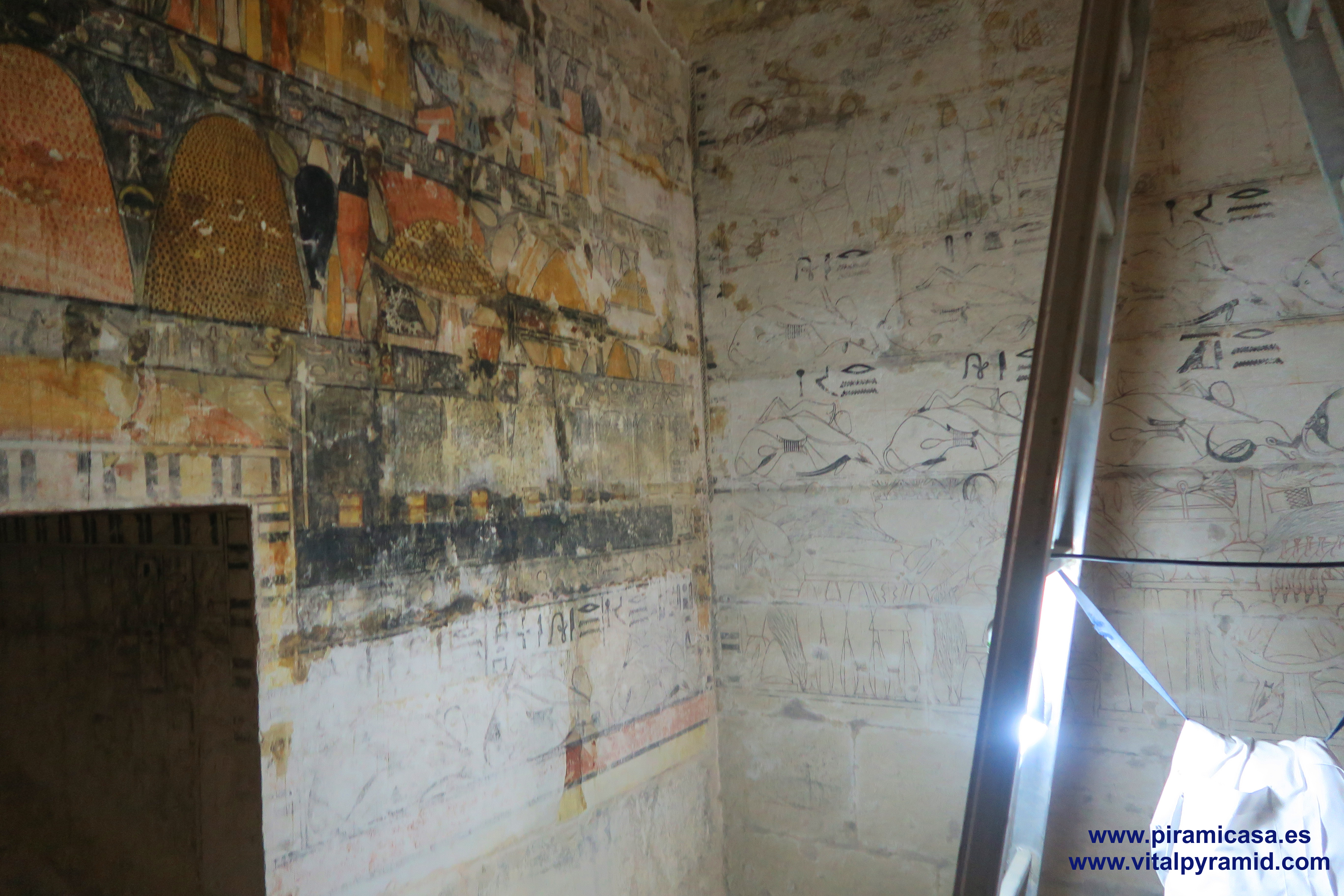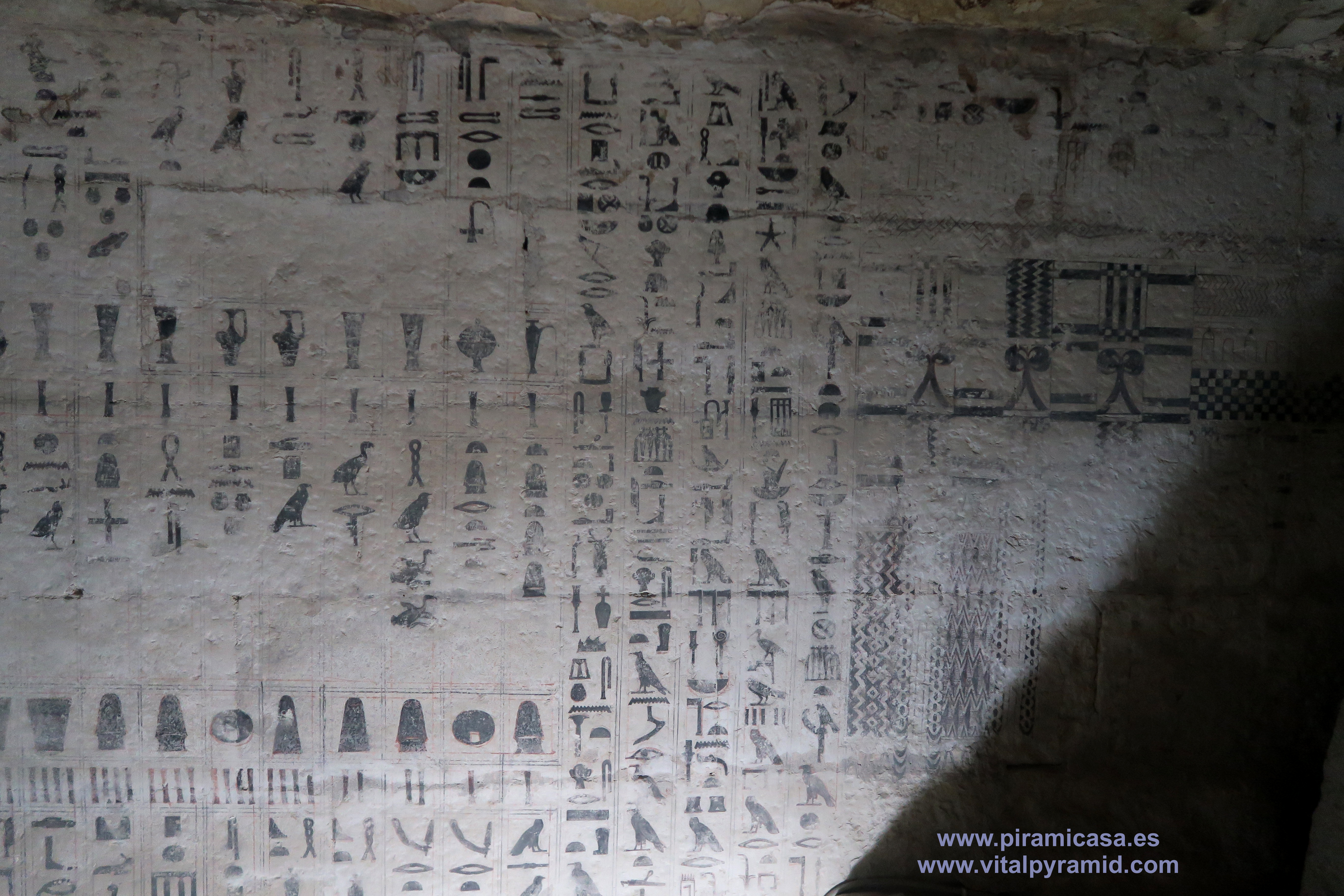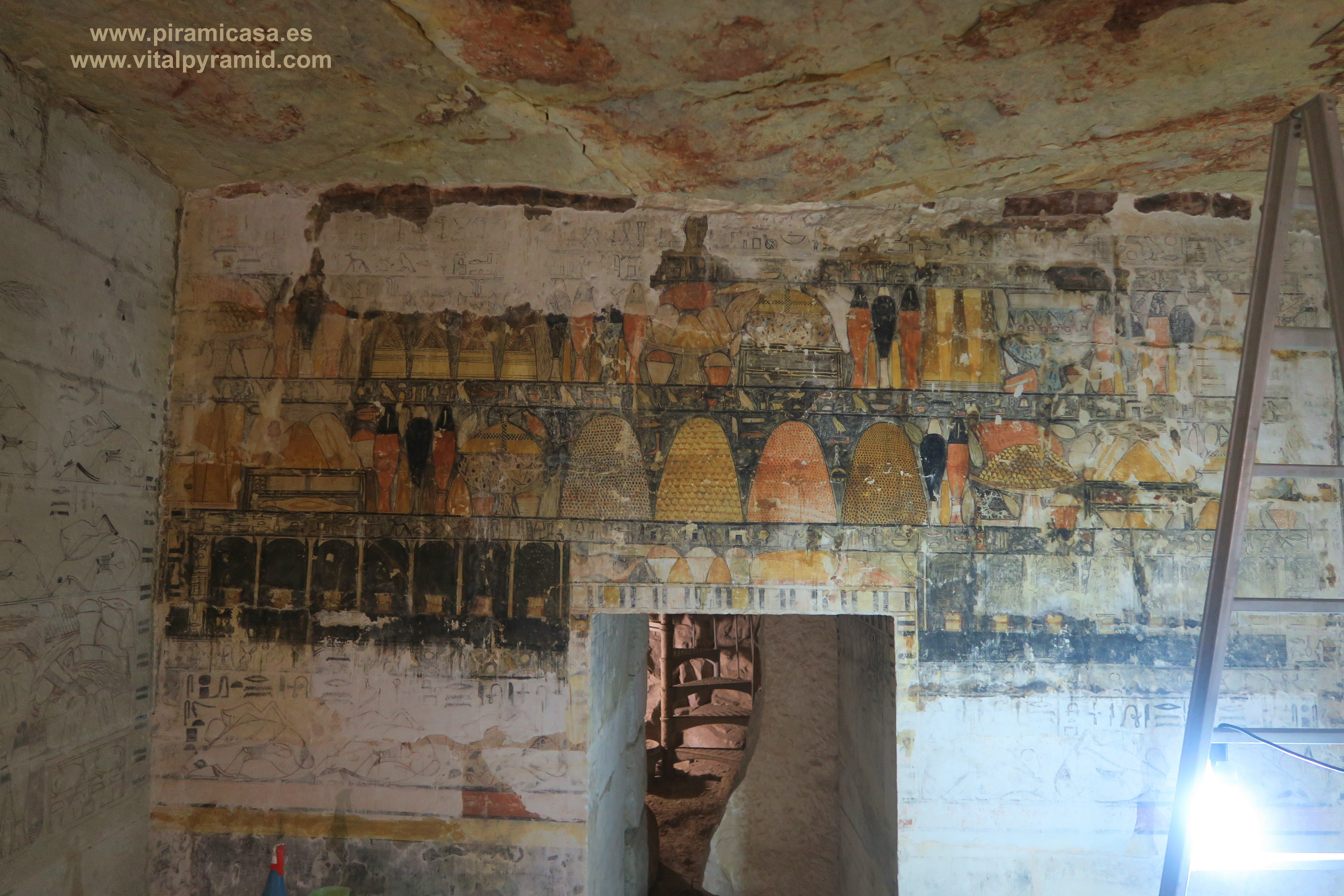 En Egipto vamos a encontrarnos en casi todas partes con supuestas tumbas, supuestas "necrópolis", como si todo lo antiguo hubiese sido cementerio, como si en todas partes se hubieran encontrado cadáveres, momias, ajuar mortuorio. Sin embargo en muy pocos sitios se han encontrado momias. Ni siquiera en el Valle de los Reyes, a excepción de la tumba de Tutankhamon, como explicamos en la sección del Valle de los Reyes. Mereruka presenta sólo escenas de caza, pesca, naturaleza, proceso y conservación de alimentos, así como temas de medicina. Empezamos por debajo del todo, en la cripta suberránea donde veremos un enorme tanque que nunca contuvo cadáver alguno. También recordemos que los jeroglíficos egipcios jamás han sido descifrados, constituyendo hasta hoy un misterio y una pseudociencia, toda vez que hay diversas teorías sin coherencia entre ella, elaboradas por egiptólogos de prestigio. Por lo tanto los jeroglíficos de estas cámaras también están para ser estudiados, analizados por criptógrafos y con toda seguridad, cuando sean correctamente traducidos se caerán la casi totalidad de las teorías que los antropólogos, arqueólogos y en especial los egiptólogos, exponen como verdades indiscutibles. Las nuevas generaciones de arqueólogos ya están empezando a generar teorías alternativas, destituyendo la "conspiración del silencio" que existe en todos los órdenes académicos, por los intereses económicos relacionados a la venta de los libros y el mantenimiento de las cátedras, cosas que quedan todas caducas, obsoletas con cada descubrimiento, porque ya no le caben parches a esta psedociencia llamada "egiptología". Será verdadera cuando sea interdisciplinaria, cuando no haya intereses curriculares, académicos, literarios y económicos que defender y se quiera llegar a la pura verdad.