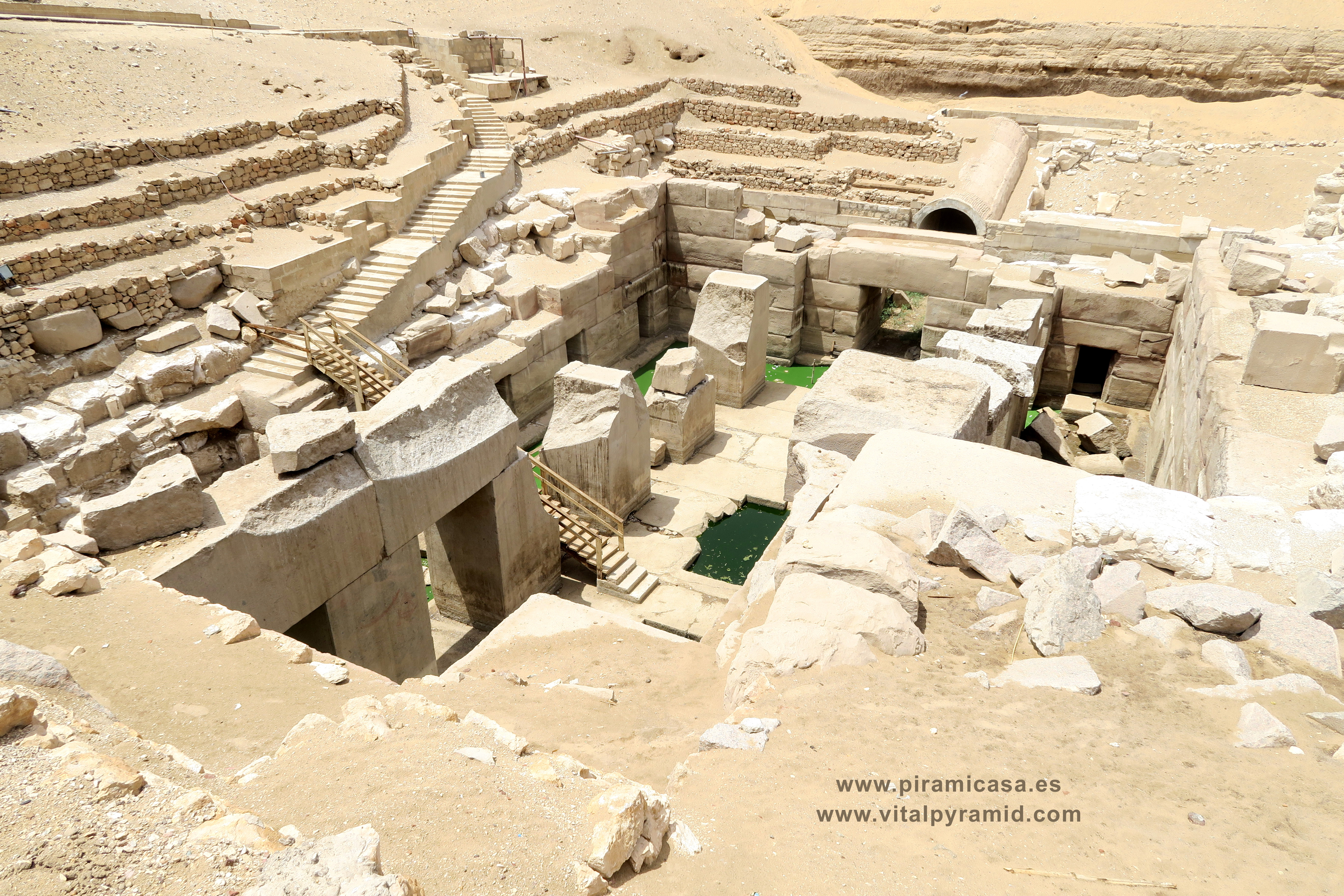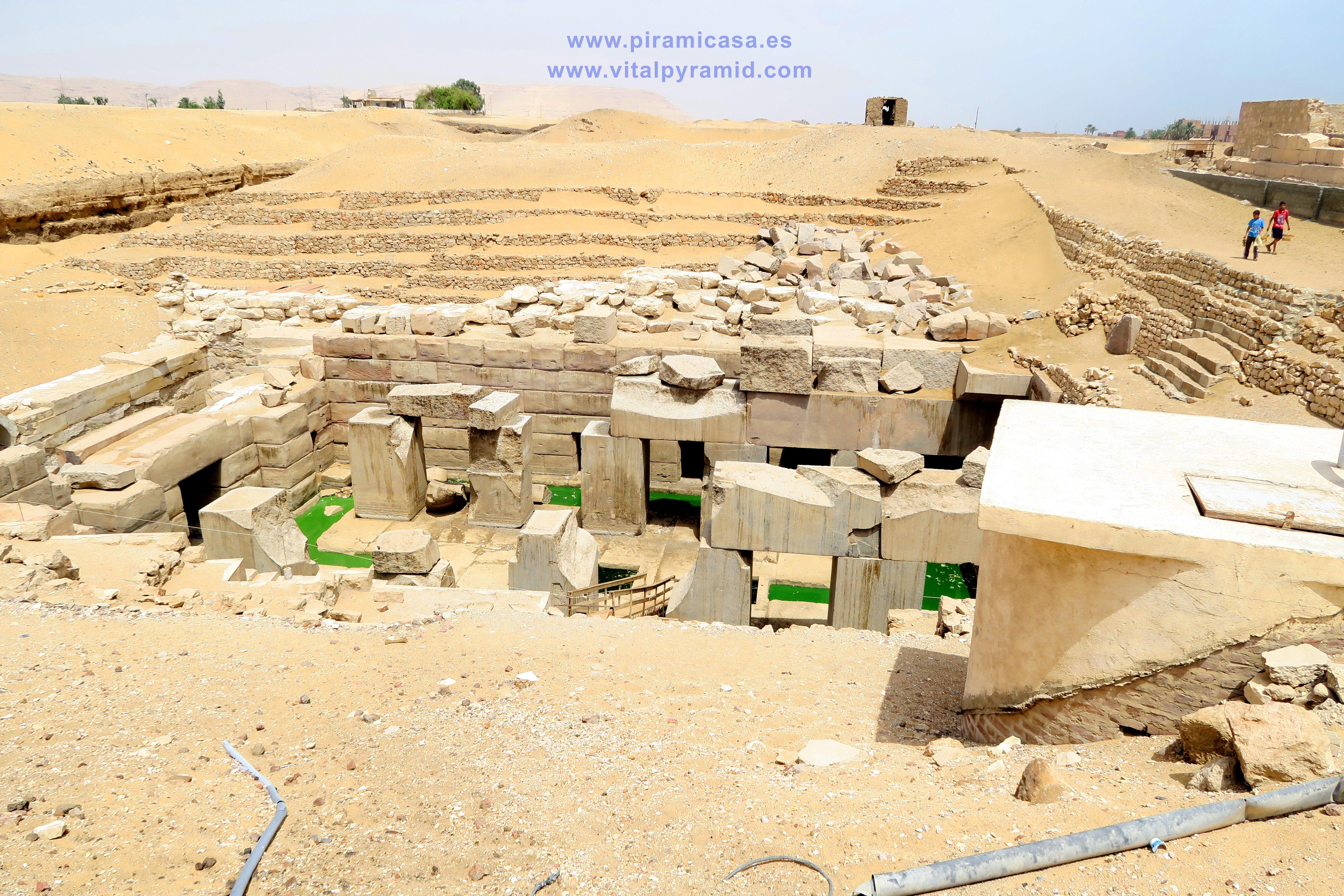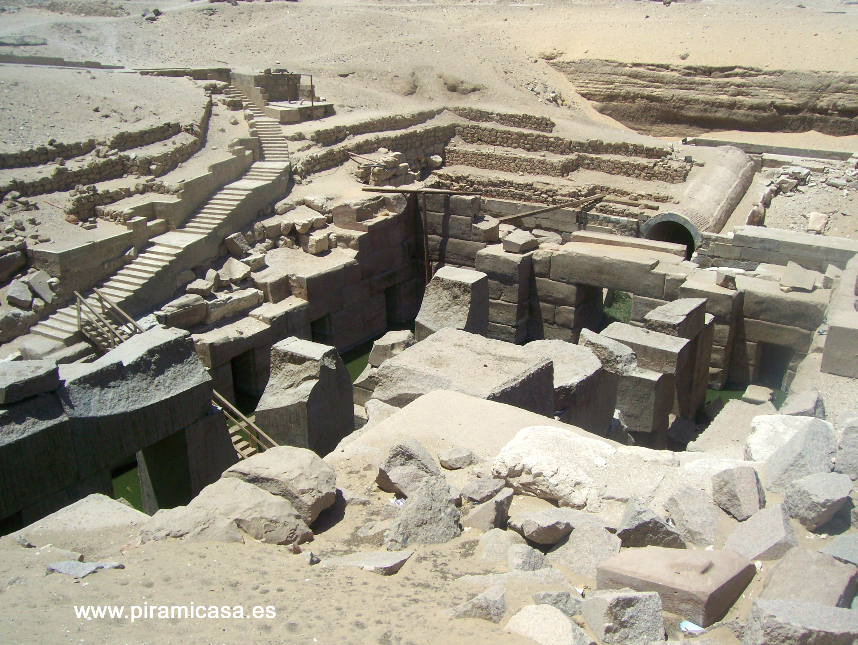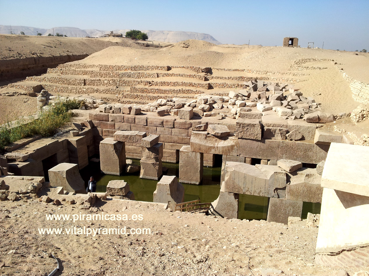FOTOS DEL OSIRIÓN, EN ABYDOS, EGIPTO, EN 2018 Estaba sin agua, pero un inspector del Ministrerio de Antigüedades, dos ayudantes y media docena de policías custodiaban el lugar. No fue posible bajar por la escalera ni siquiera hasta donde es habitual hacerlo. Como puede verse en las fotos, las puertas hacia el interior del templo permitirían el paso, aunque posiblemente hubiera mucho barro, ciénaga y por supuesto, peligro para las personas. No se podría entrar sin equipo adecuado. No tenemos datos de los estudios que haya hecho el Gobierno, pero sin duda que habría de darnos muy importantes datos. Bien sabemos que el piso del Templo es en realidad un techo, porque como lo indican los megalitos que hay antes de la entrada, dichas rocas son cornisas, no meros bloques para sostener los bancales o terrazas.