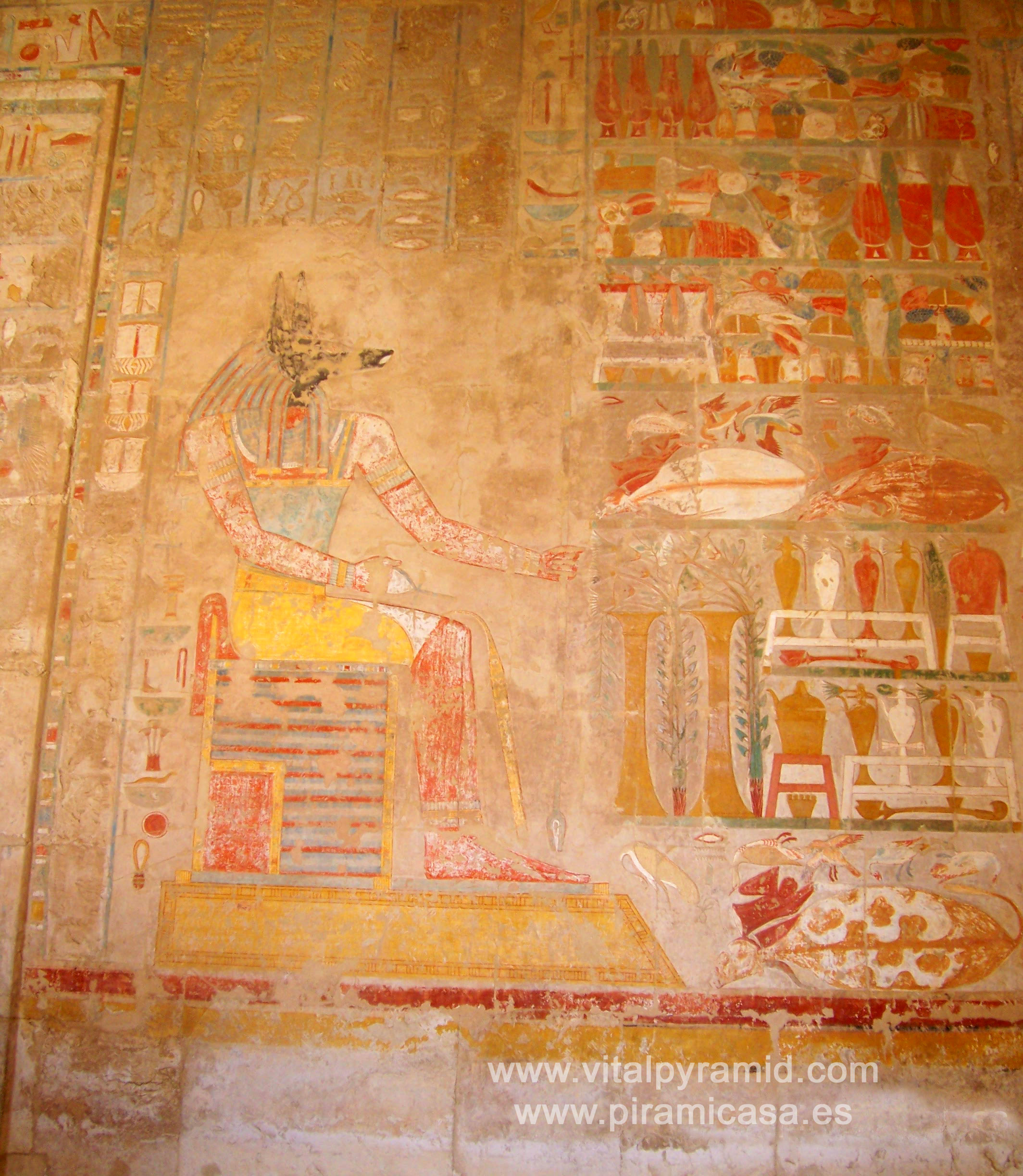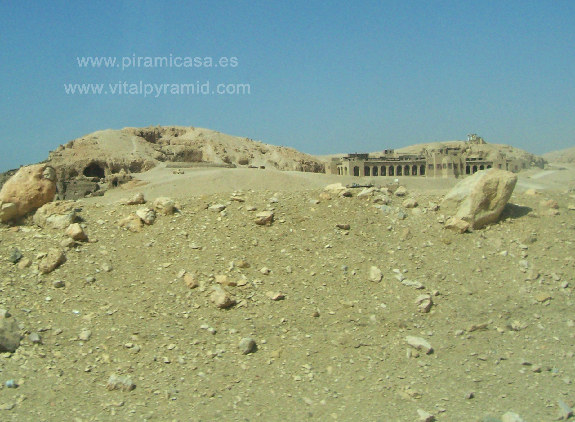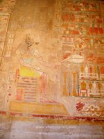 El entorno del Templo de la Reina Hatshepsut es montañoso, imponente y bello. Lo veréis a la derecha, rumbo al Valle de los Reyes. En el documento anterior vemos un sujeto con una especie de probeta o enlenmeyer, en que hay tres esferas que representan los óvulos de esta Reina que fue inseminada artificalmente. La inseminación artificial es cosa del pasado, diría alguien, pues cierto que lo es. Un genetista experto nos podría decir si esta parte de la historia es cierta y mucho más. El Templo tenía originalmente abajo muchas cosas que ahora no están y cuando se reconstruyeron las escaleras, quedaron perdidas algunas columnas del primero de sus tres niveles. En el segundo y tercero, se puede apreciar que hay aún doce columnas a cada lado de la entrada, y cada una tenía su estatua. En el lateral de cada nivel, una estatua más completando los 13. Egipto encierra por todas partes claves matemáticas y esotéricas que muchas veces están en números. Así que a la hora dde investigar, tenedlo "en cuenta..." Nunca mejor dicho.