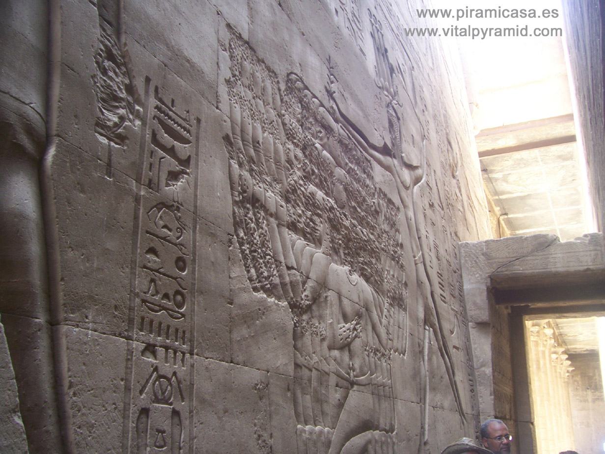 El templo de Horus es uno de los más curiosos y tiene buena parte muy bien conservado debido a que permaneció durante muchos milenios (muchos más que los supuestos por los arqueólogos oficiales) sepultado bajo la protectora arena del desierto. Horus representa en el Hermetismo, la Conciencia despierta. Es hijo de Isis y Osiris, que representan respectivamente a la Ciencia y el Conocimiento Algunas escenas grabadas entre sus maravillosos jeroglíficos, representan lo explicado en el Libro de los Muertos. También contiene este templo una historia en su interior, que hace comprender de dónde sale la historia judía del Arca de la Alianza. La verdadera, la original, ha estado en Egipto. Si no se trata de la original, al menos de una mucho más antigua que la que mandó a construir el dios de los judíos unos 600 años antes de Cristo.