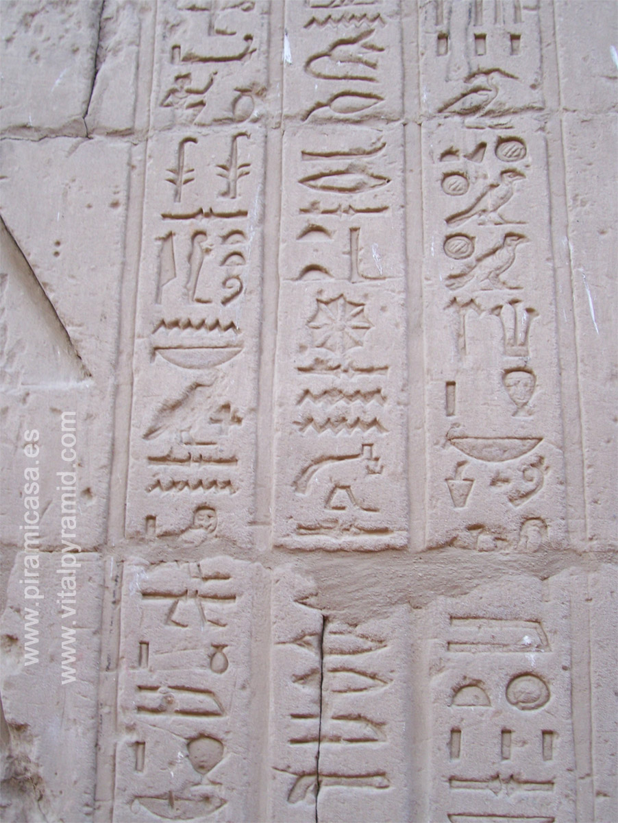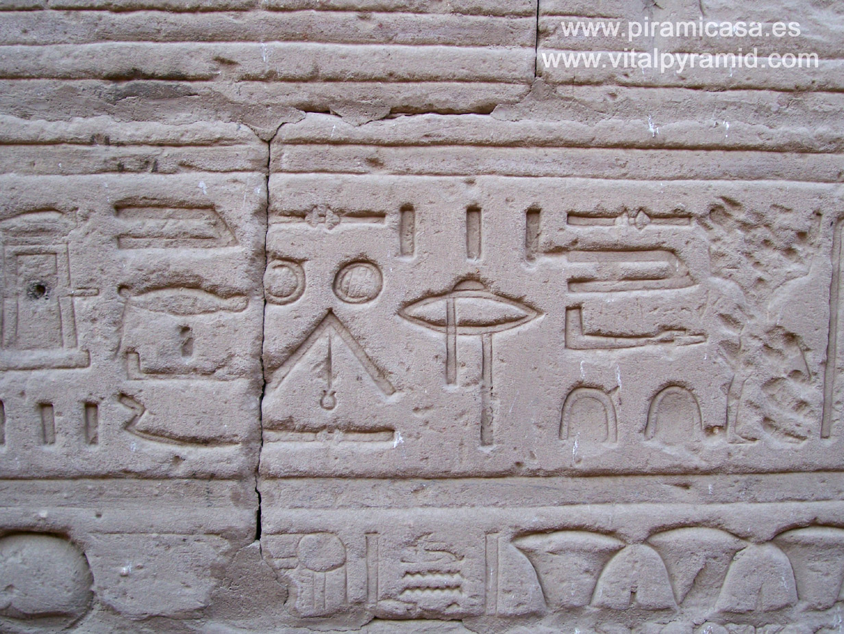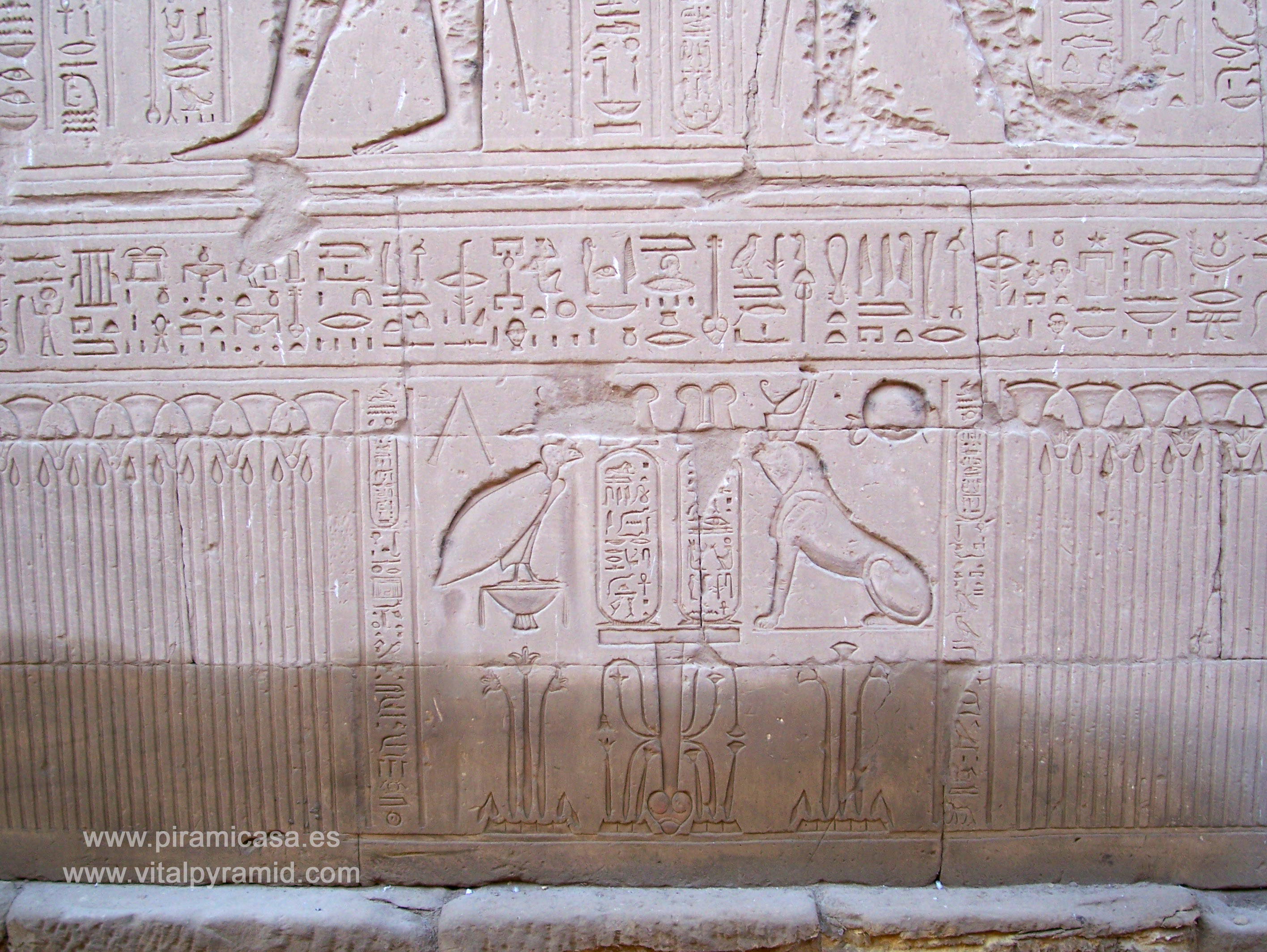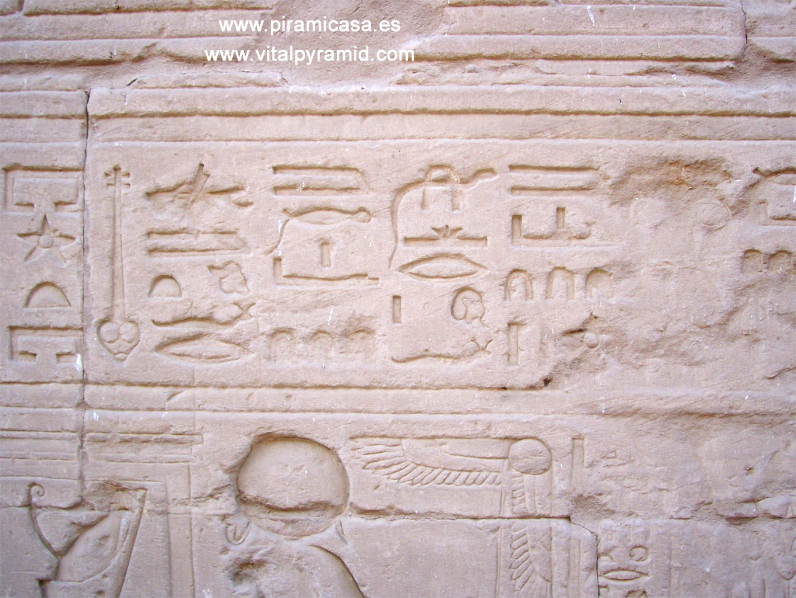 | En la imagen de arriba, la de la derecha y la de abajo, tenemos en un sector del muro izquierd exterior del Templo de Edfu, una serie de ideogramas donde aparece lo que los simplistas de la arqueología traducen como la letra "R". Si se observa sabiendo la falsedad de que los jeroglíficos hayan podido ser traducidos, tenemos que atenernos a lo que podemos comprender objetivamente. Flechas que indican hacia arriba, estrellas, una escuadra con plomada (fuerza de gravedad) y especialmente en la foto de abajo, una relación de días... ¿De viajes? | ||