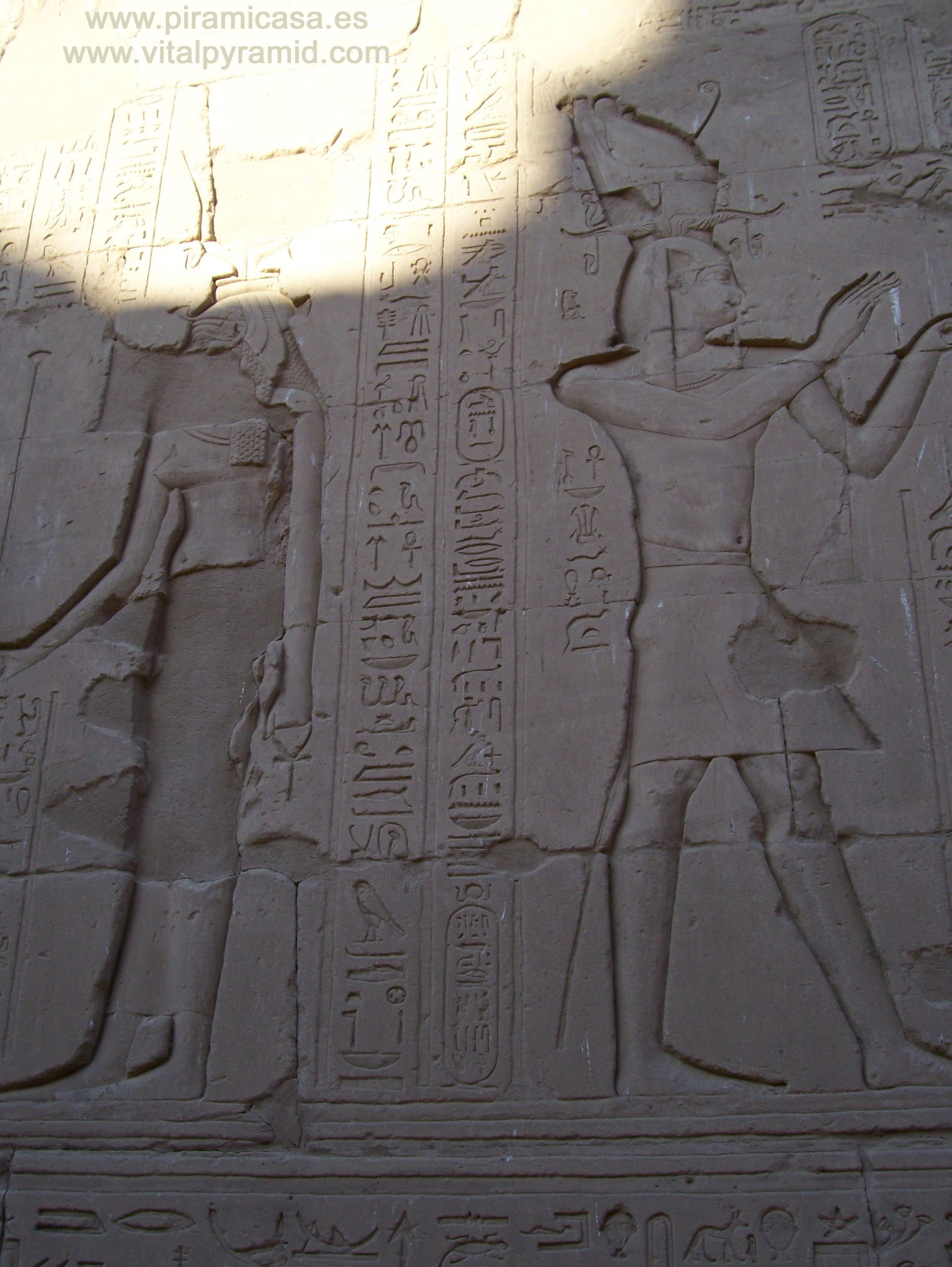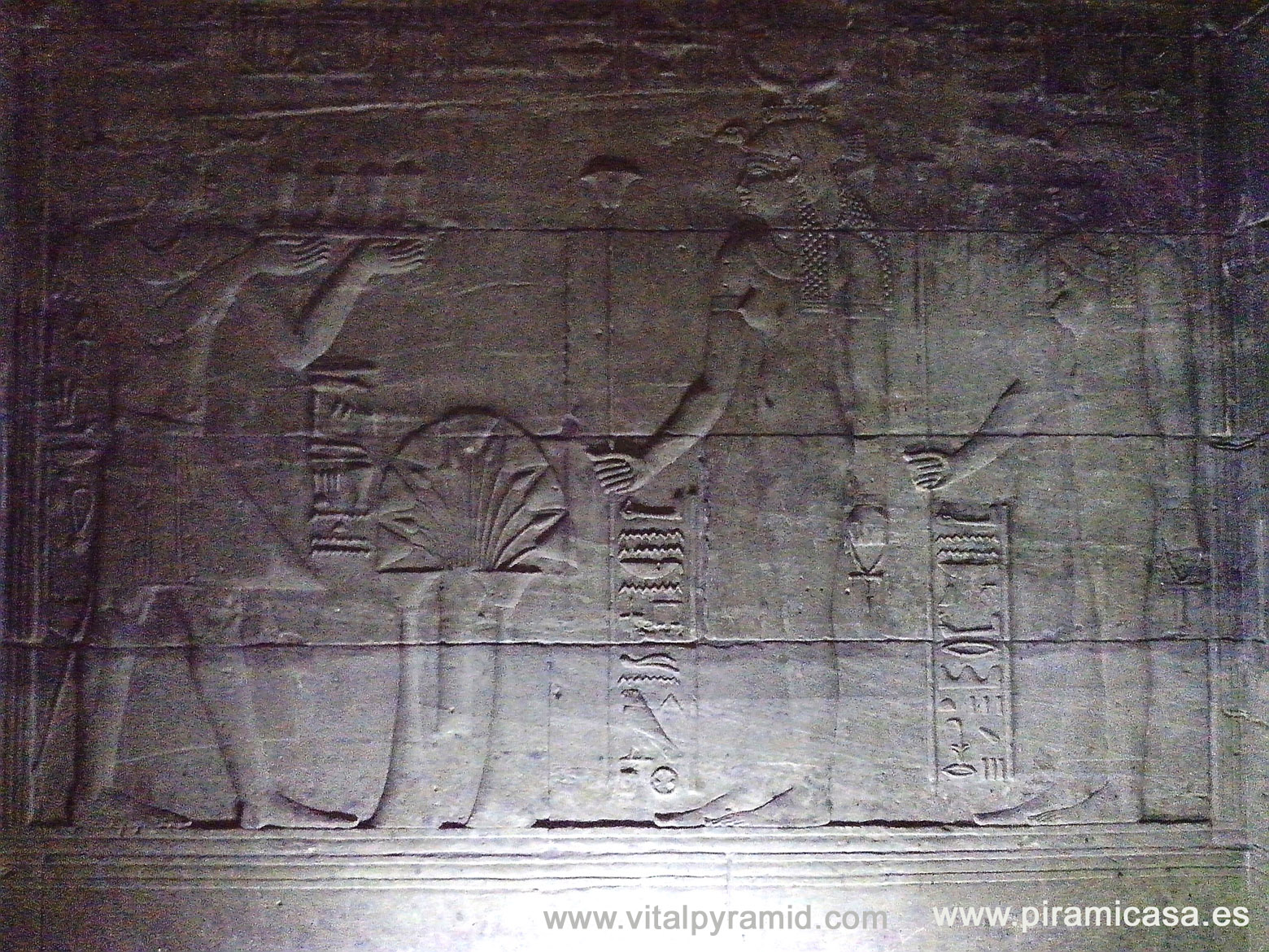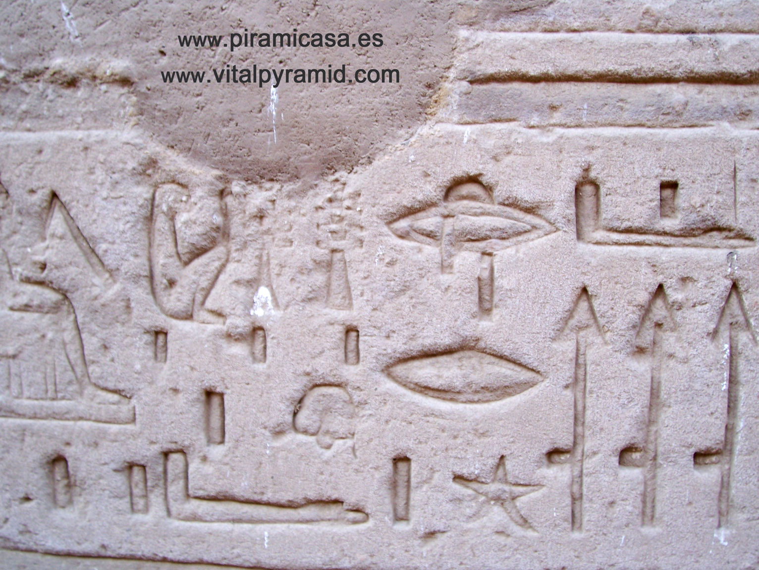 | En la imagen de arriba, la de la derecha y la de abajo, tenemos en un sector del muro izquierd exterior del Templo de Edfu, una serie de ideogramas donde aparece lo que los simplistas de la arqueología traducen como la letra "R". Si se observa sabiendo la falsedad de que los jeroglíficos hayan podido ser traducidos, tenemos que atenernos a lo que podemos comprender objetivamente. Flechas que indican hacia arriba, estrellas, una escuadra con plomada (fuerza de gravedad) y especialmente en la foto de abajo, una relación de días... ¿De viajes? | ||