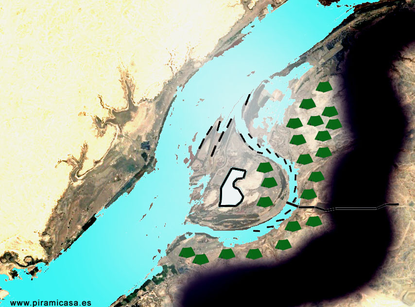 -No será fácil alcanzar el castillo que tienen allí. -decía Henutsen un día después, mostrando los mapas levantados- Hay unas tres mil personas en campamentos dispersos entre el río y la ciénaga, pero hay un único puente hasta la isla, que atraviesa la ciénaga y el brazo de río. El castillo tiene al menos seis cuerdas de largo y tres o cuatro de ancho. Está sobre un promontorio en esta isla que debe tener al menos veinte cuerdas de ancho y no pudimos llegar hasta allí. Los cocodrilos abundan y es impensable ir a nado. También hay ahora once barcos como los que liquidamos o un poco mayores y unas quince barcazas poco más pequeñas. Tengo la sensación de que hay mucha más gente. Sólo para llenar esos navíos, unos quince mil hombres. Pero un ejército tan grande debe tener detrás un pueblo de mujeres y niños