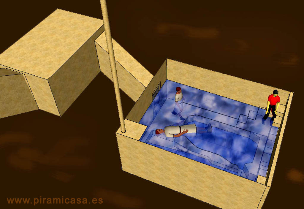 -Ese conducto de allí, -decía Enhutatis señalando un hueco en una esquina superior- es una entrada para el agua que debe echarse desde la parte superior, casi en la cúspide de la pirámide. El agua entra a estas piscinas y puede subir un poco más, pero nunca podrá superar el nivel del segundo escalón, porque el aire se comprime hasta un punto en que no puede entrar más agua. Aquí abajo hay un efecto parecido al del interior de la pirámide, pero los Templarios aconsejan no pasar de cuatro Râdnies aquí dentro, pudiendo volver cuatro Râdnies después. Entonces abren la puerta rastrillo y el agua sale un poco por el pasillo hacia la sala de tocador. Desde afuera sacan una parte del agua con unas vejigas de camello, como en cualquier sitio donde haya que subirla, como en los pozos sin fuerza. Después la gente sale y regresa para la sesión siguiente. Dicen que curan muchas dolencias con este sistema.