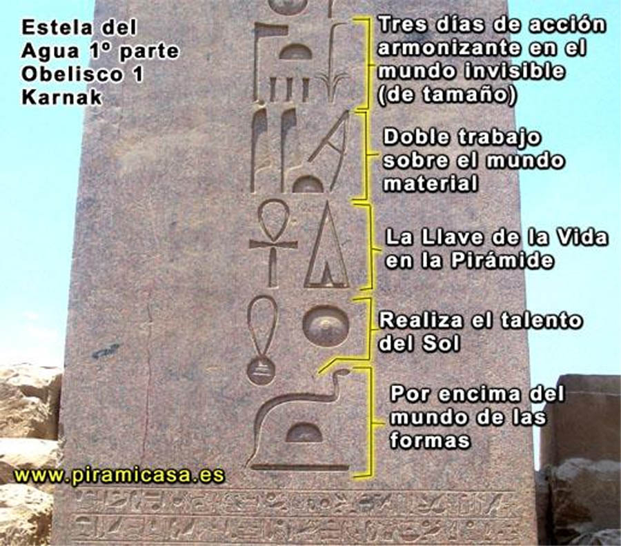-Mirad Podéis leerlo de abajo hacia arriba o de arriba hacia abajo. Con toda la estela daría igual, pero veamos sólo este fragmento El agua tarda tres días en cambiar, como ya sabemos Doble trabajo porque cambia la forma pero también la energía. La llave de la Vida en la Pirámide realiza el talento del sol por encima del mundo de las formas Podría escribir toda una biblioteca sólo con las estelas de los obeliscos, pero ahora comprendo el significado profundo, aunque apenas si hay palabras en nuestro idioma para explicarlo todo
